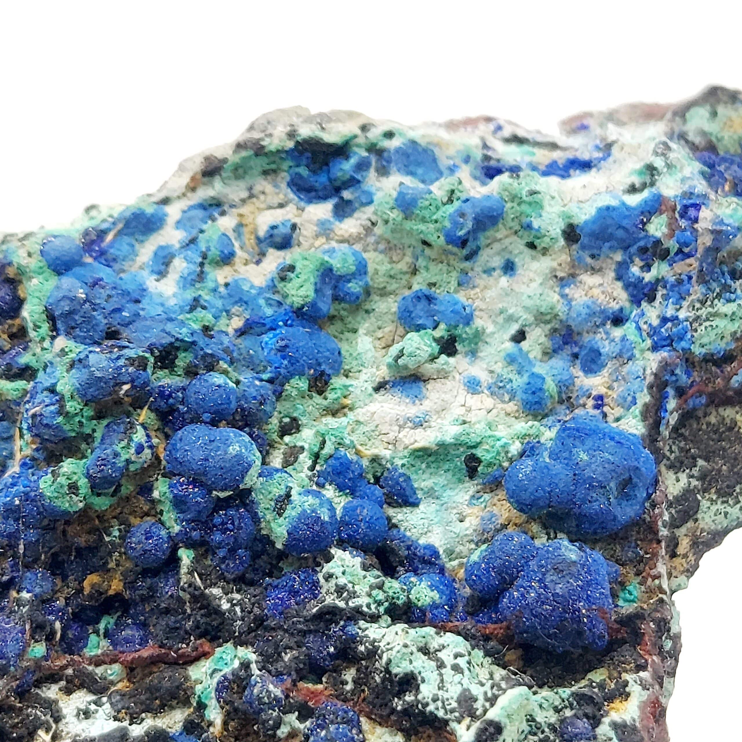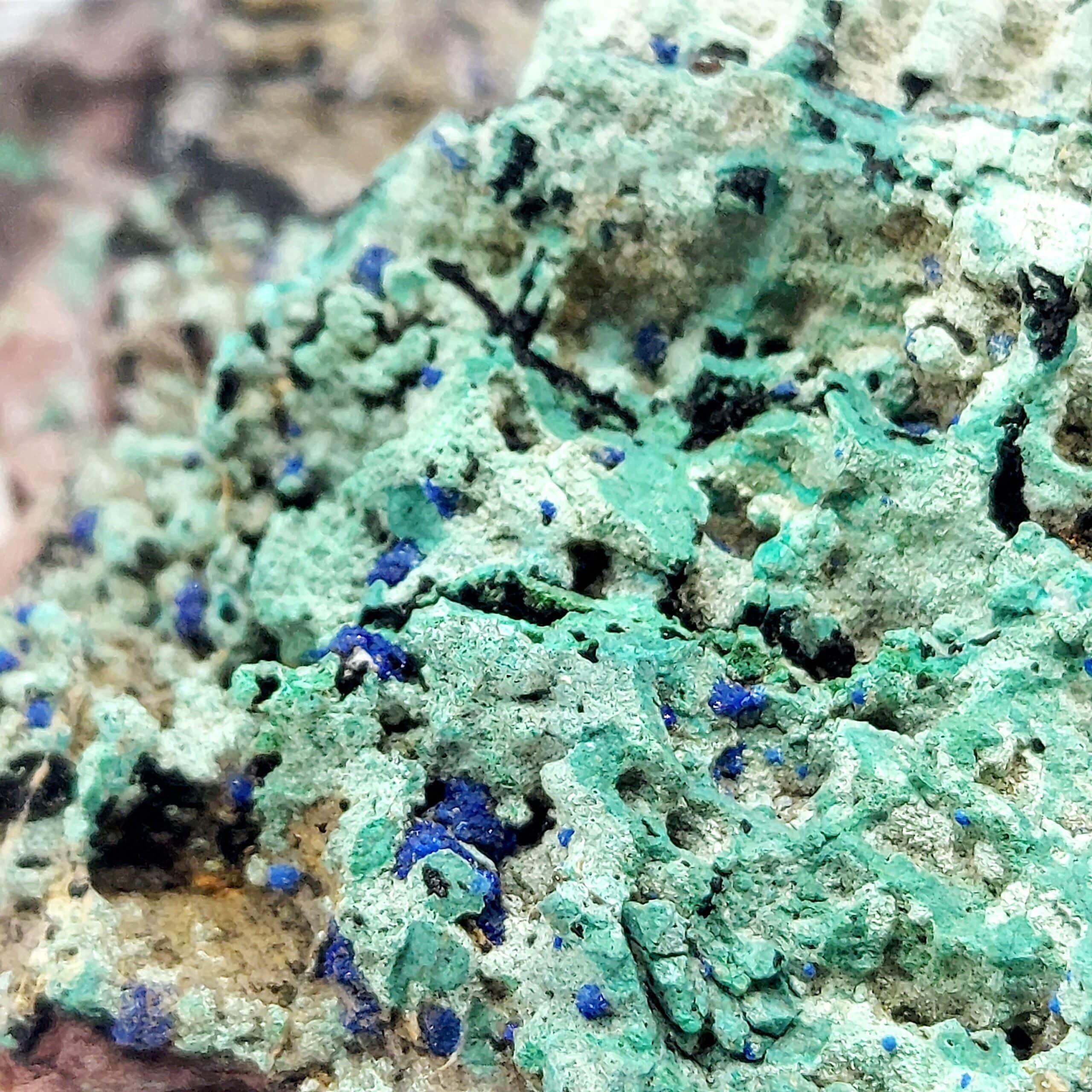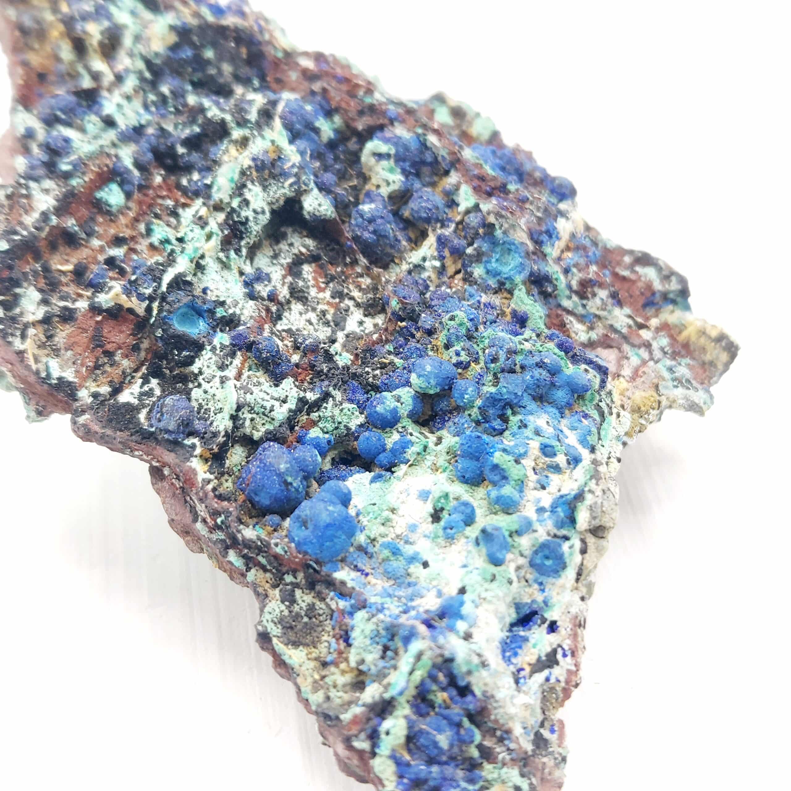 Échantillon de belle taille associant allophane d’un bleu prononcé, Azurite et Malachite provenant de l’ancienne mine d’Alzon, département du Gard.