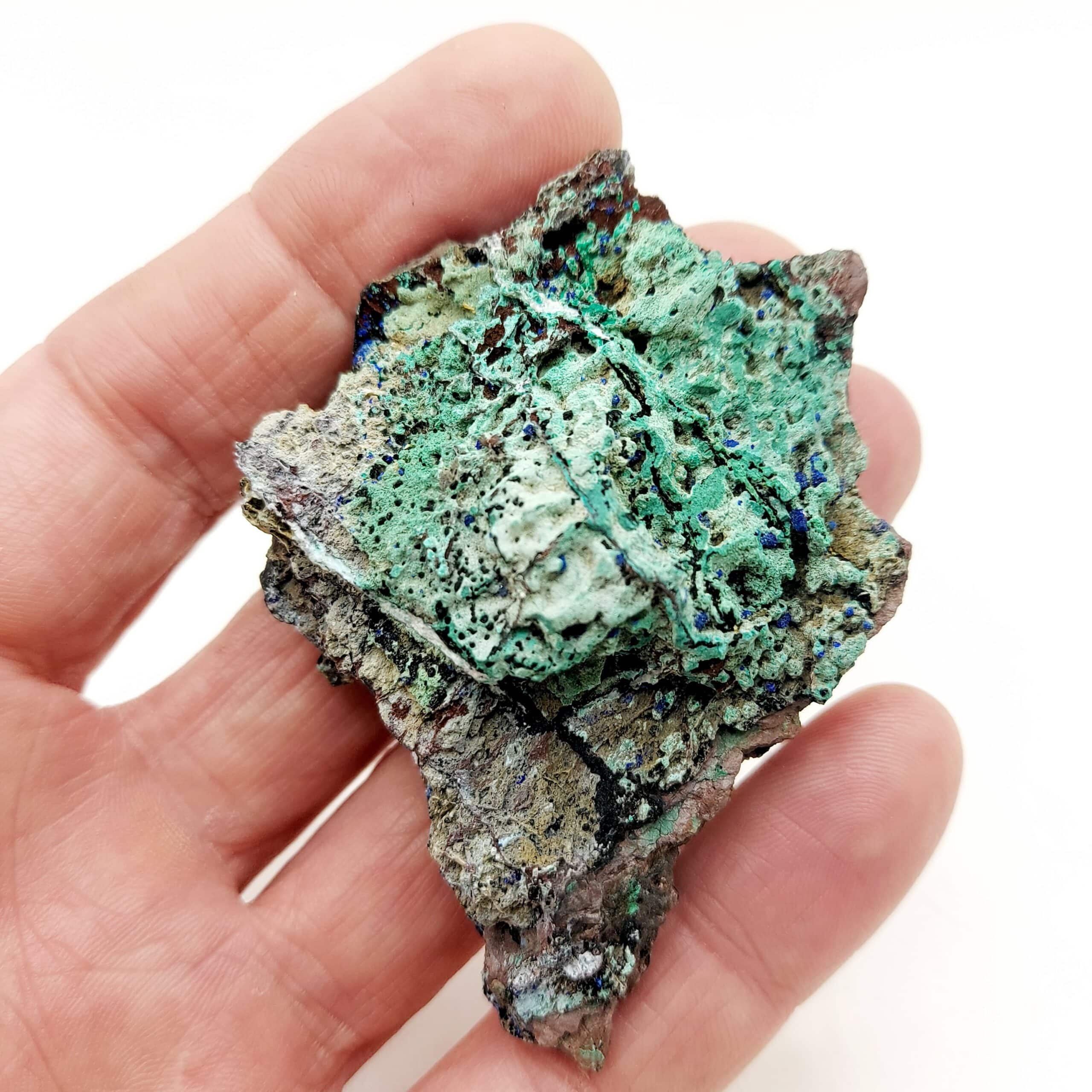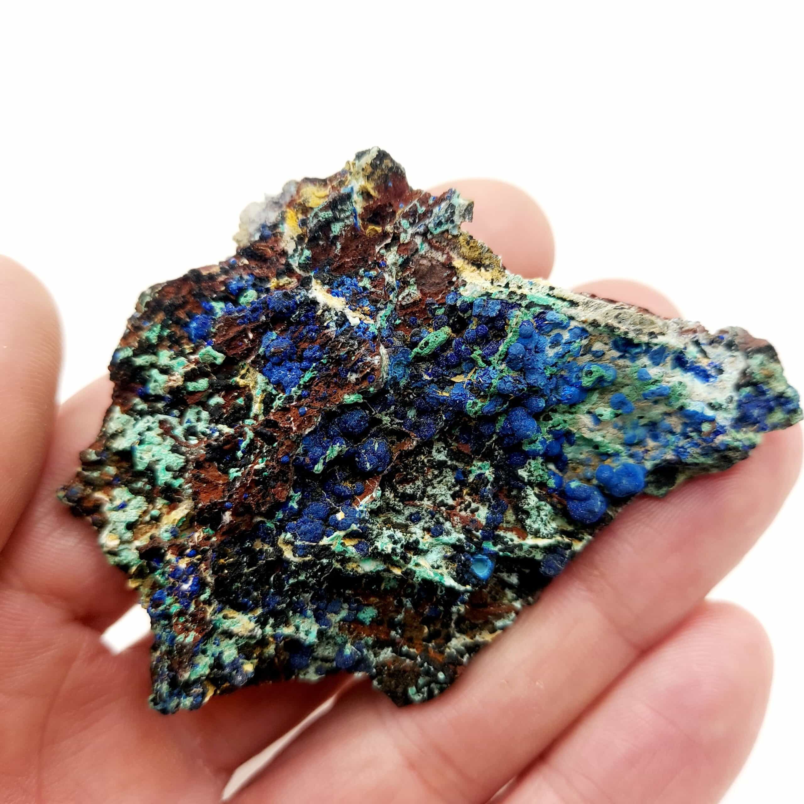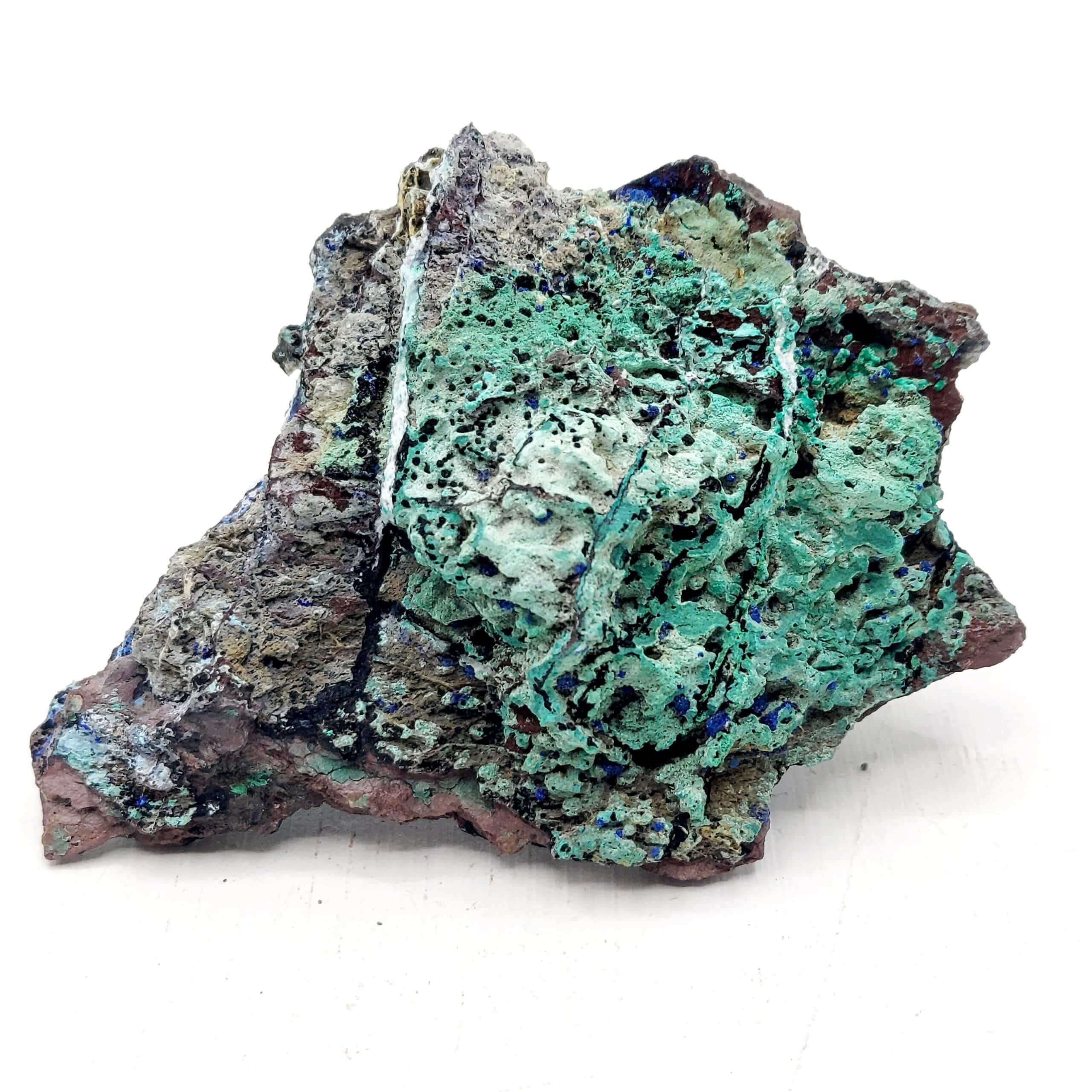 Échantillon de belle taille associant allophane d’un bleu prononcé, Azurite et Malachite provenant de l’ancienne mine d’Alzon, département du Gard.
