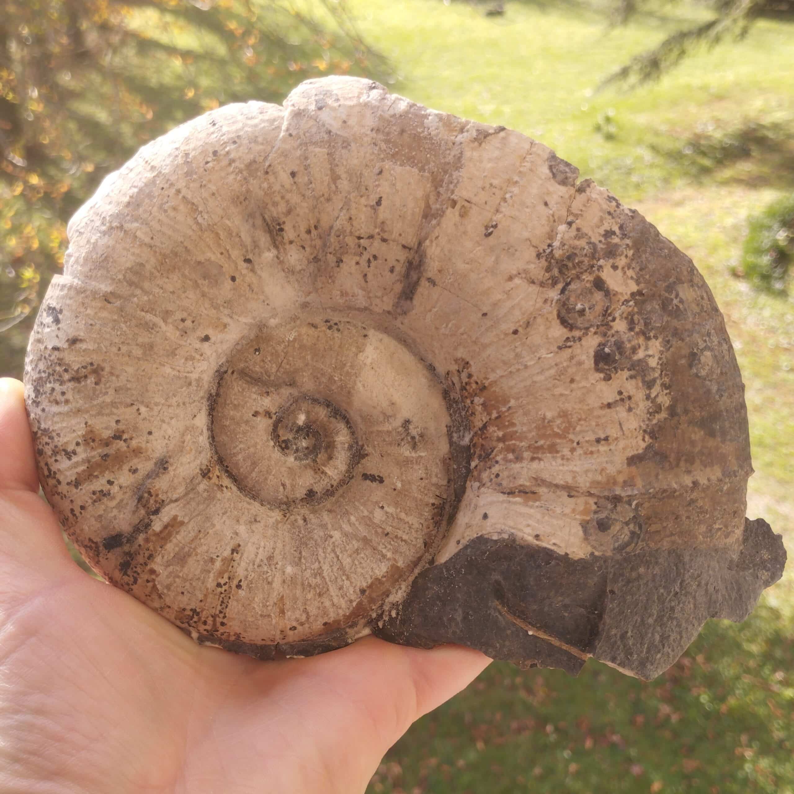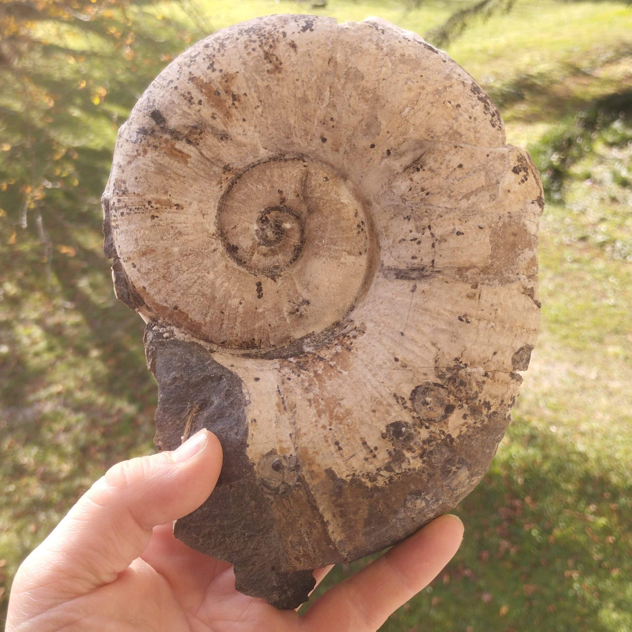 Grand spécimen de fossile d’ammonite de type Lytoceras cornucopia dont l’intérieur est cristallisé en célestite. Spécimen en provenance d’Aveyron.