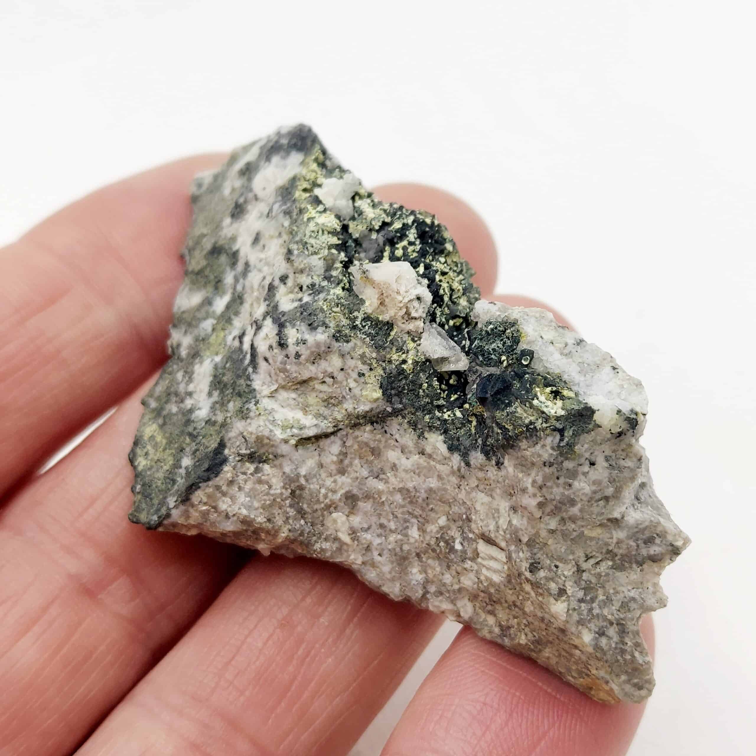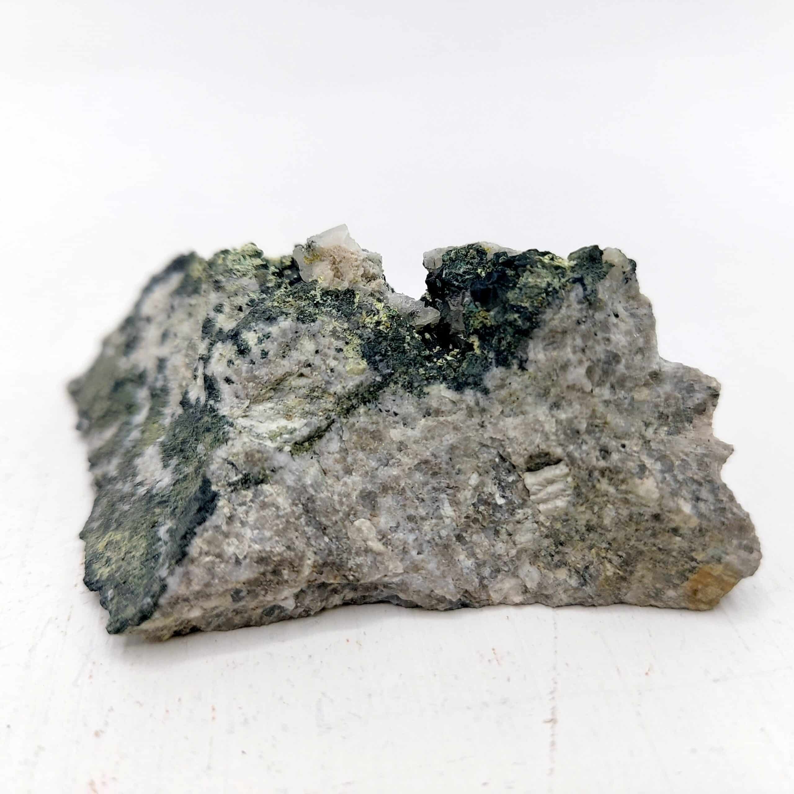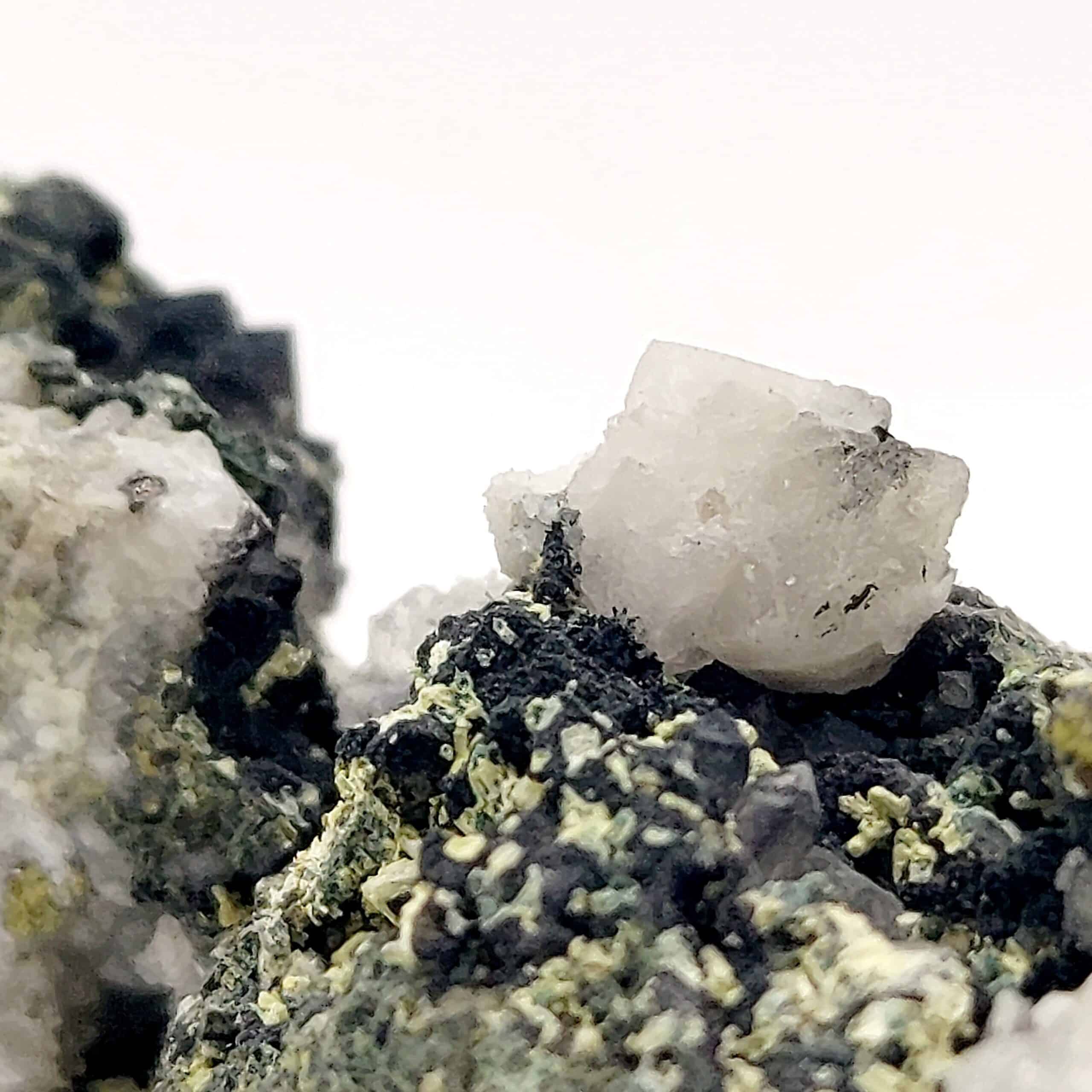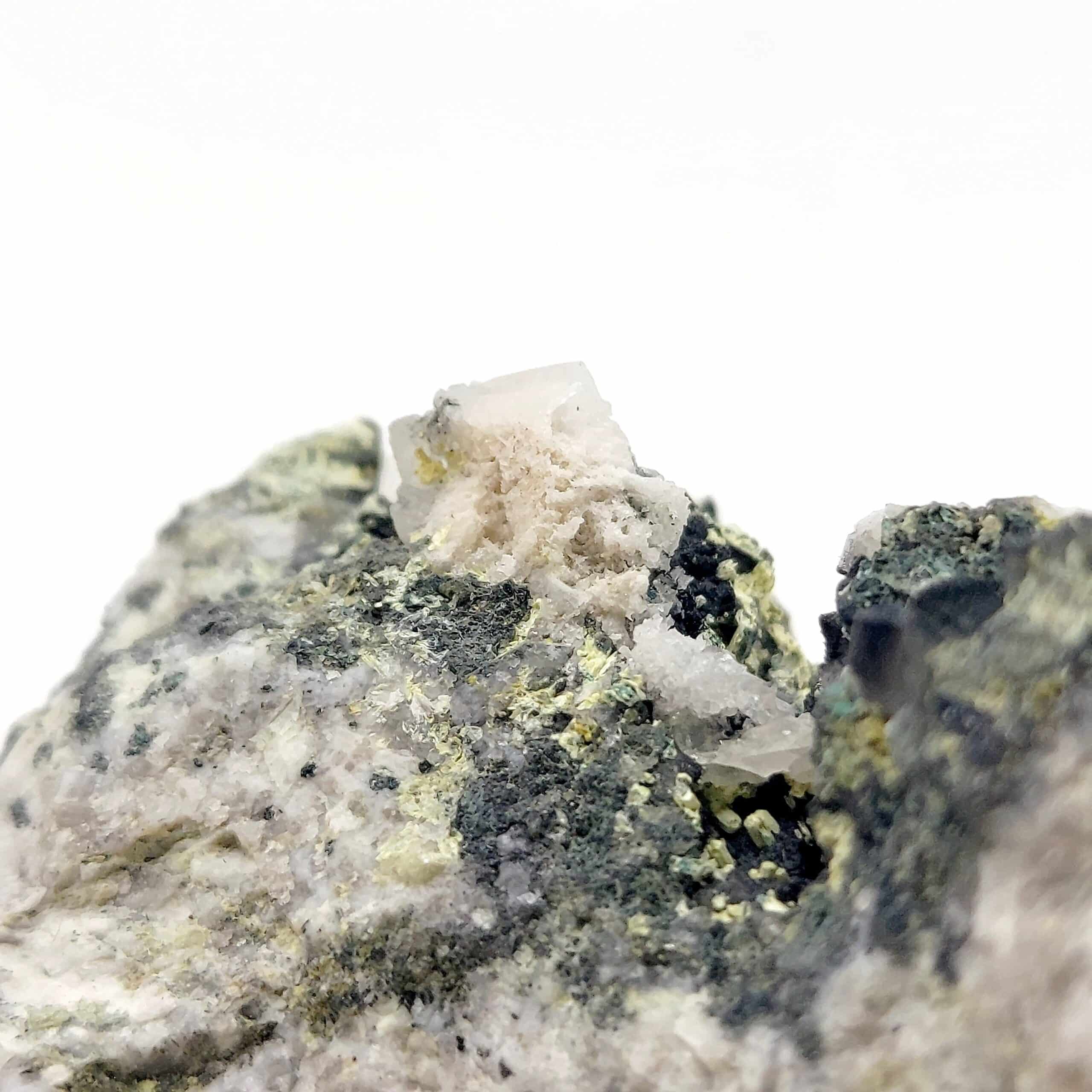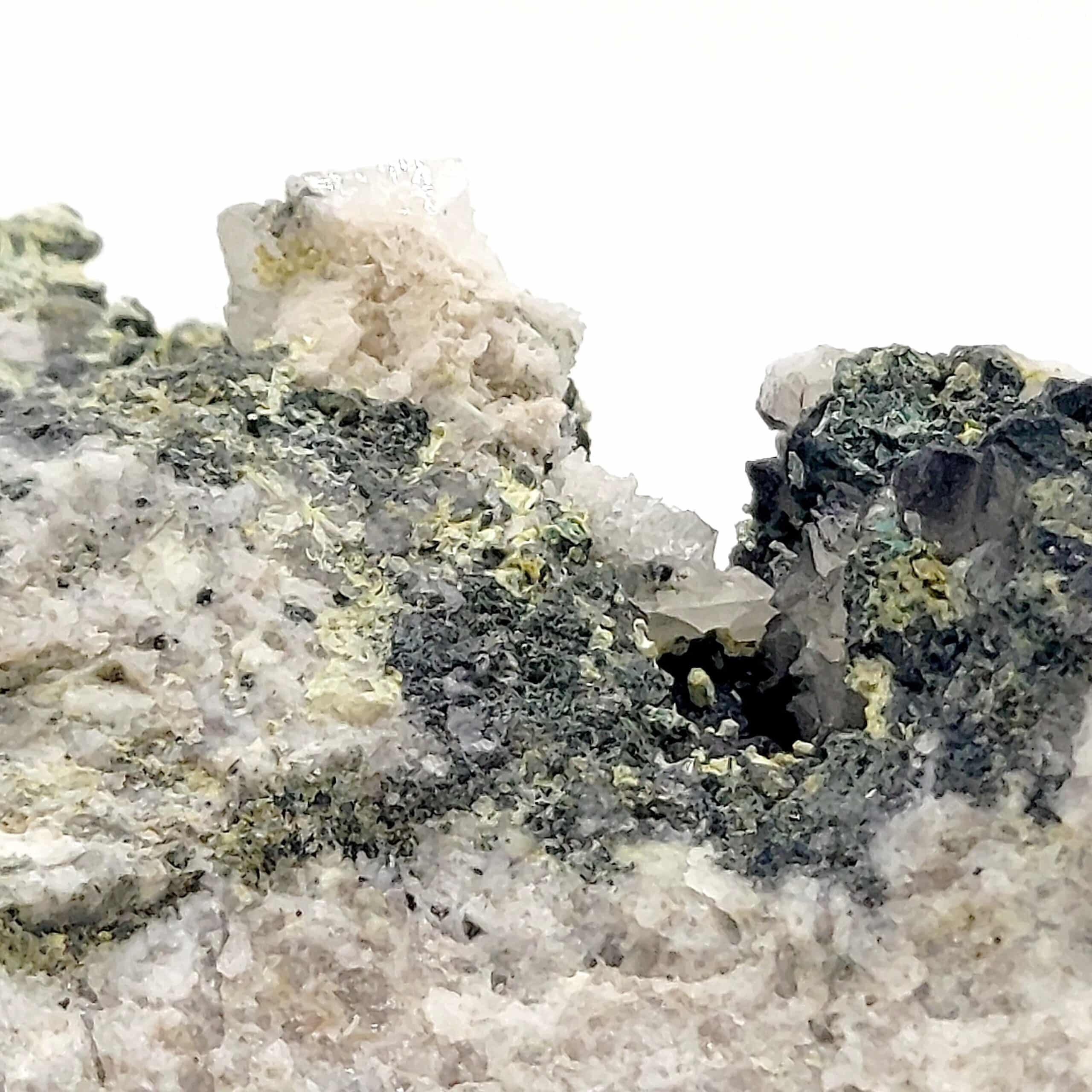 Jolie association de micro-minéraux, en l’occurence de l’anglésite en petits cristaux incolores, de la malachite verdâtre, de la bindmeimite vert jaune de l’ancienne mine du mas-Dieu dans le département du Gard.