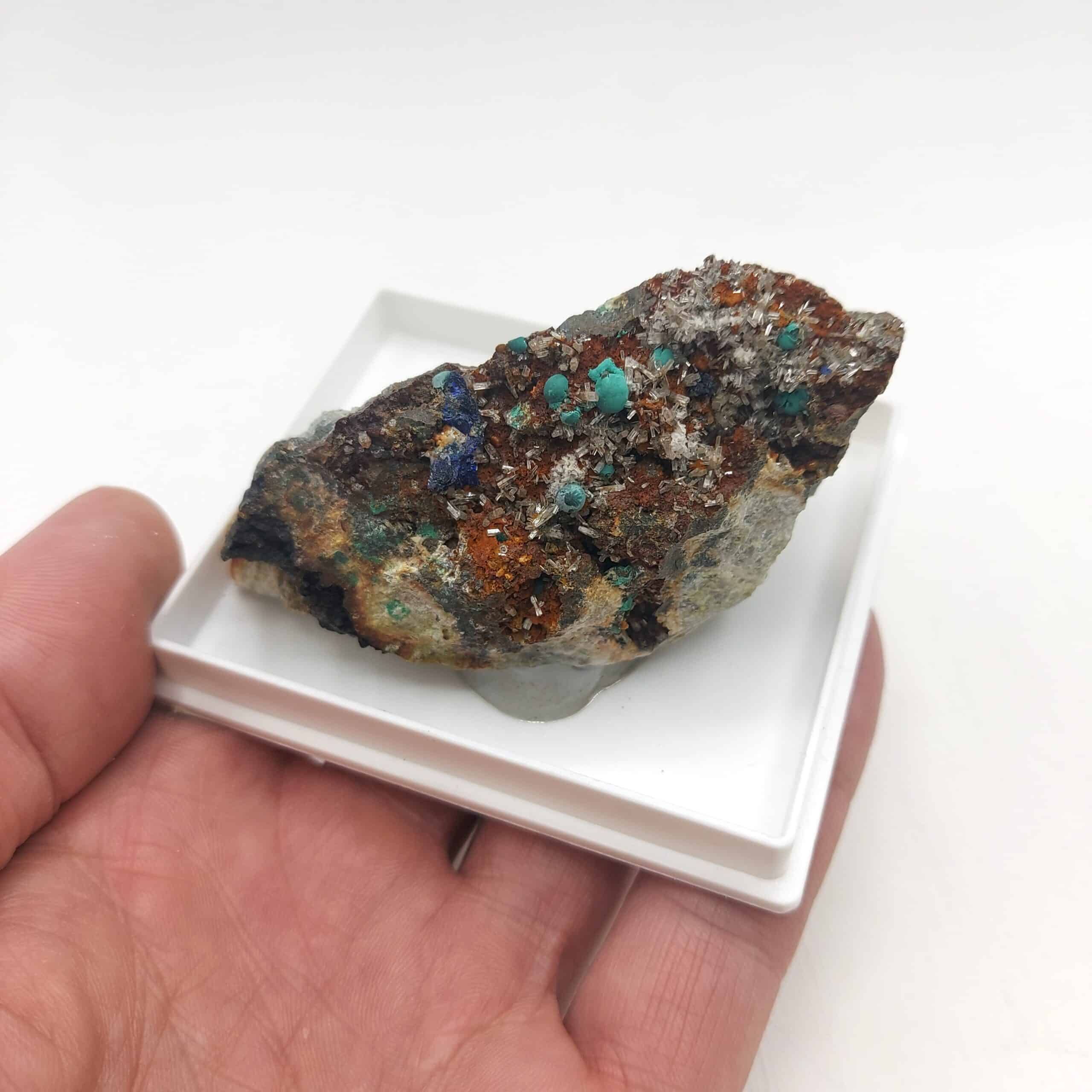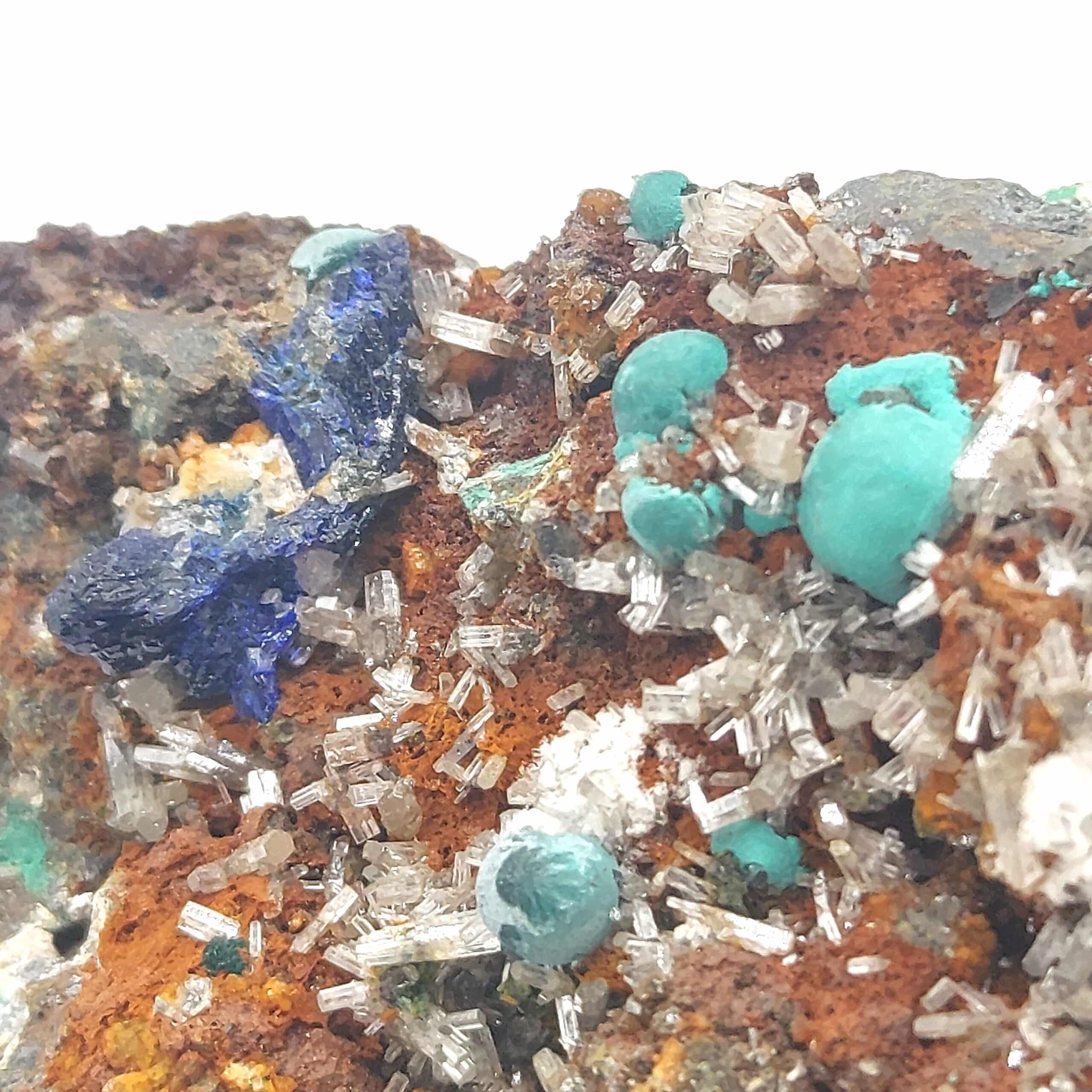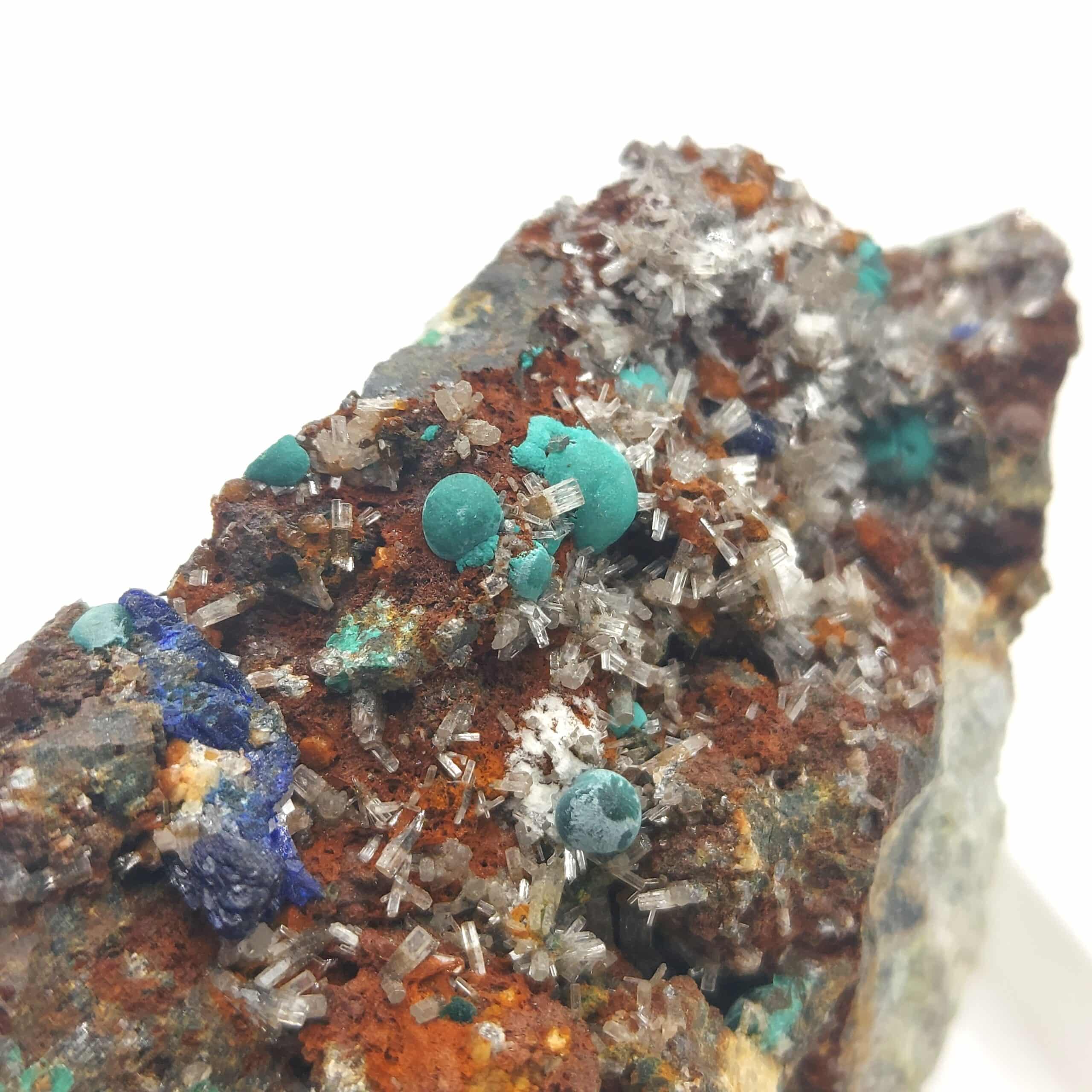 Association peu courante d’azurite bleue, de malachite botryoïdale, de Mimétite et de Dundasite en provenance de la mine du Mas Dieu au Nord d’Alès dans dans le Gard.