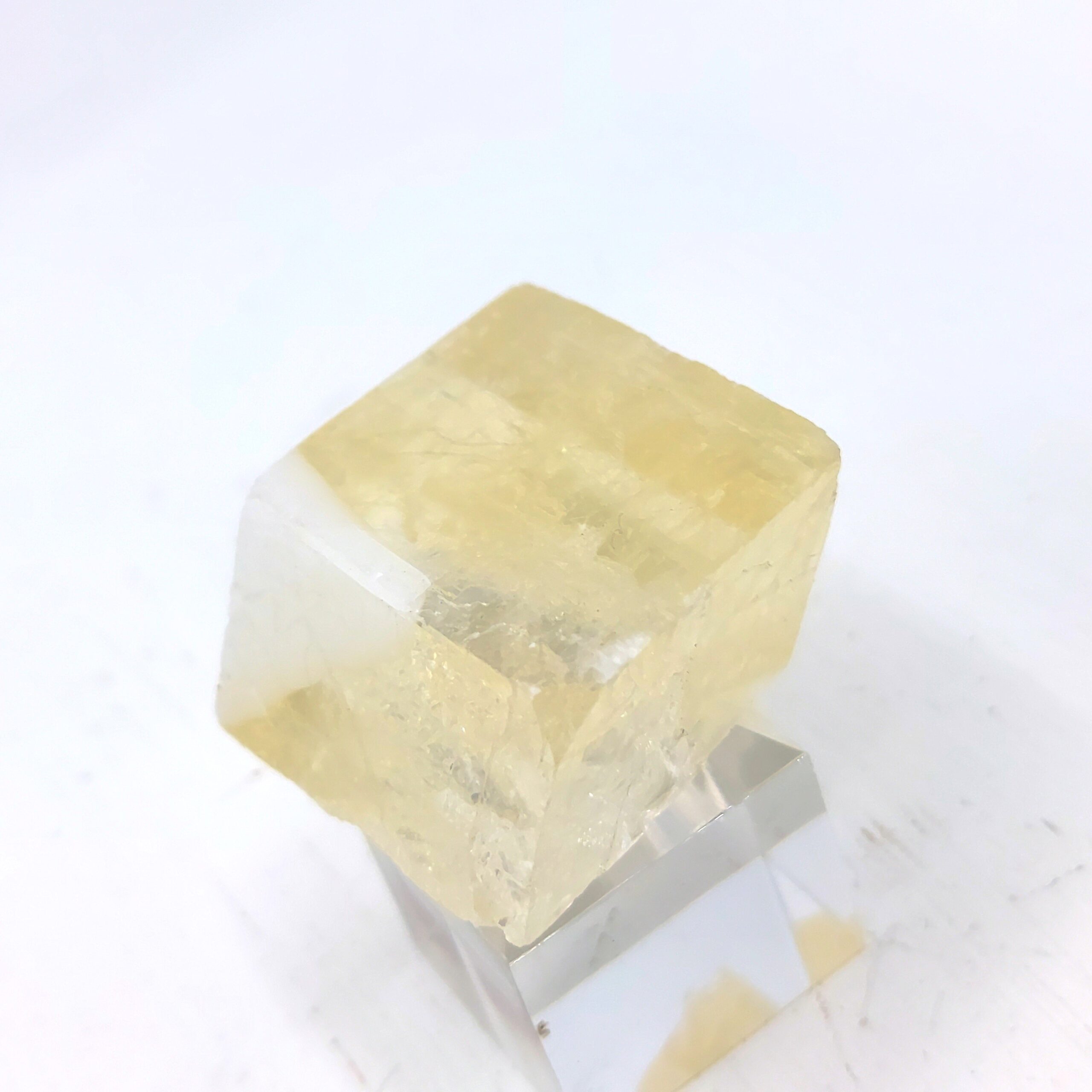 Prisme de calcite optique transparente jaune, obtenu par clivage,  en provenance d’Inde.