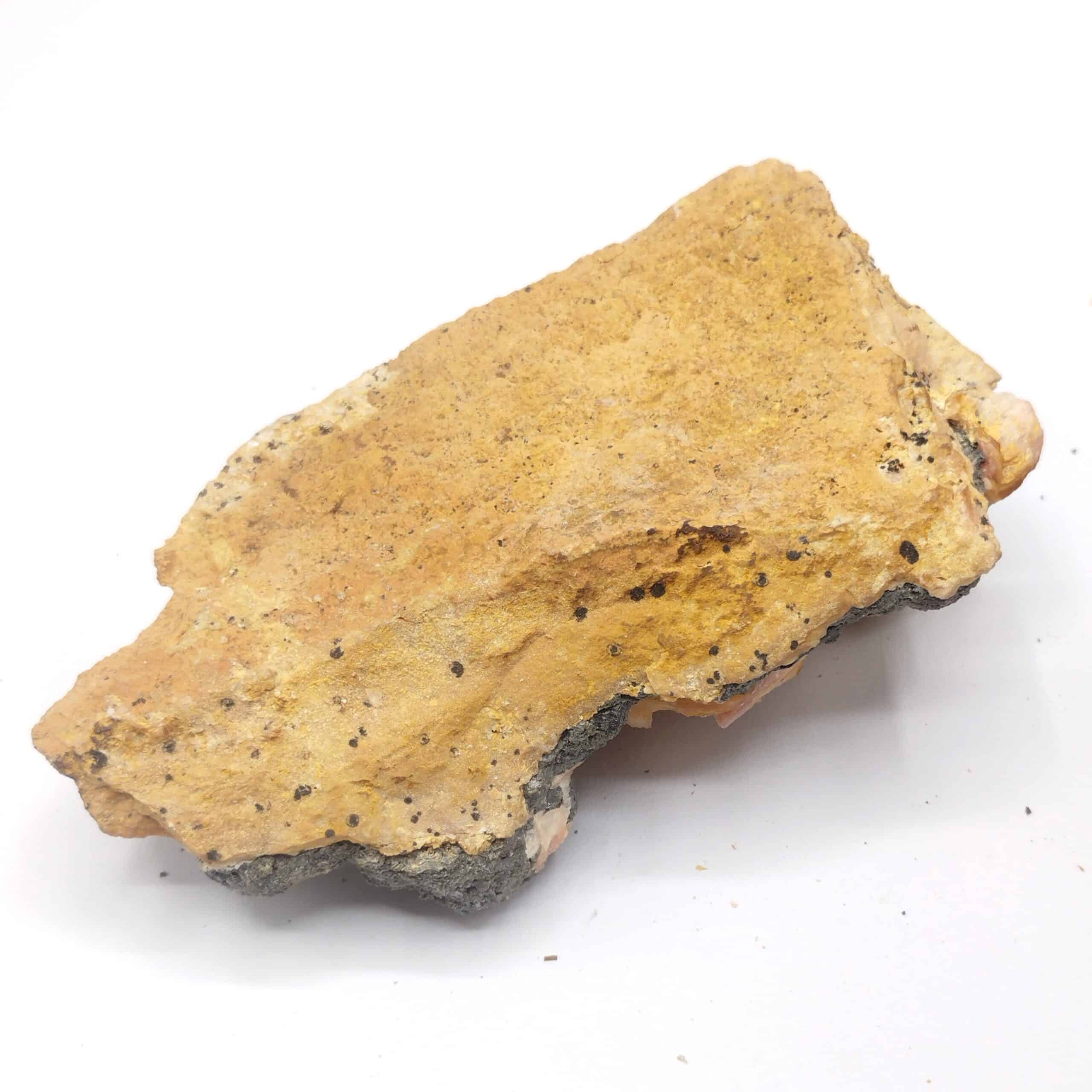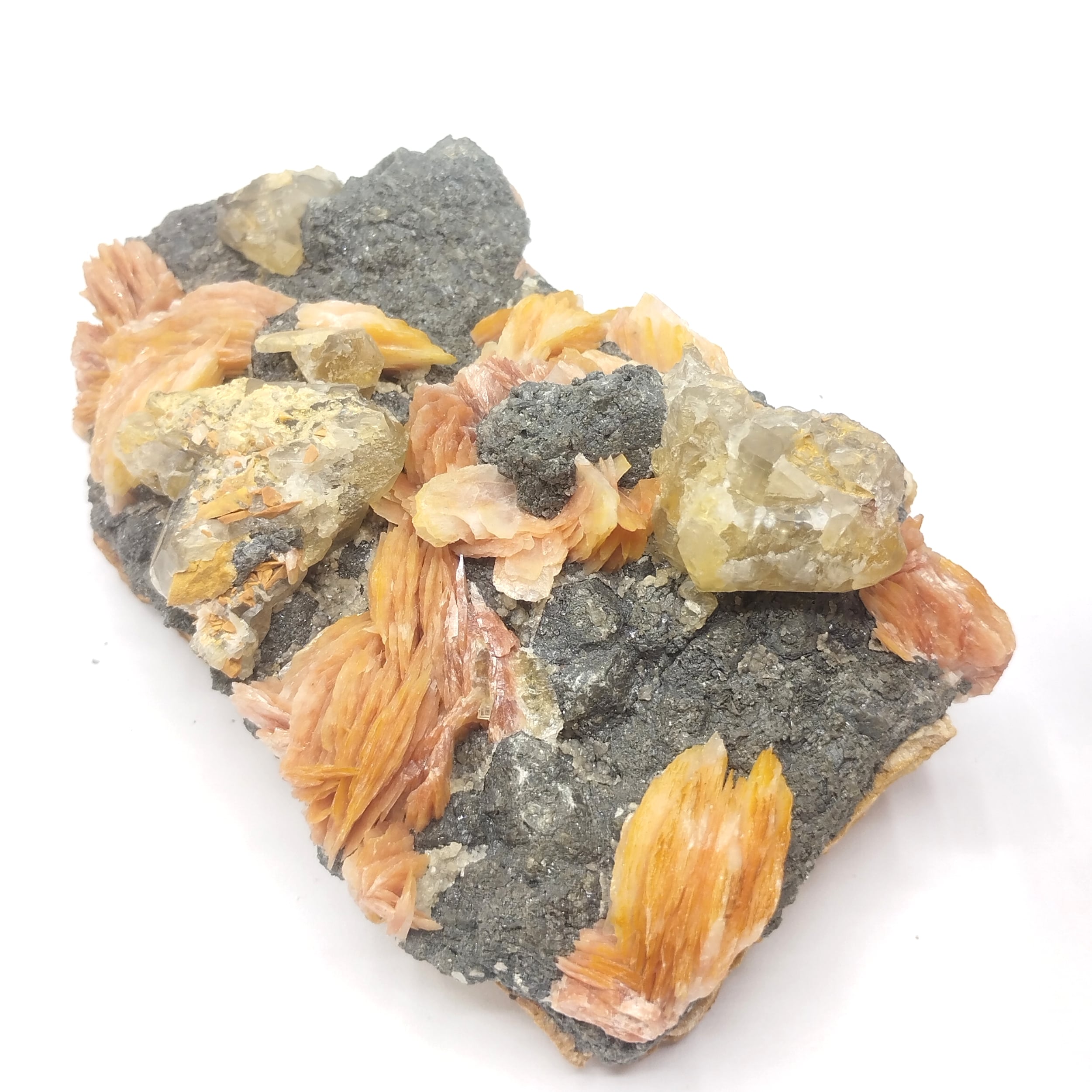 Bons cristaux de cérusite jaune et baryte orangée sur cérusite noire en provenance de la région de Mibladen au Maroc.