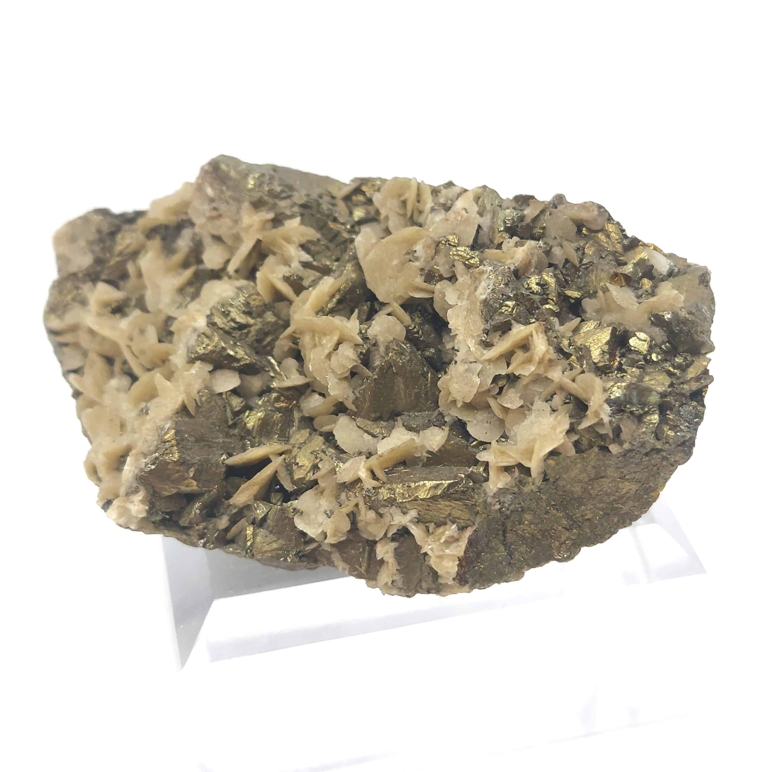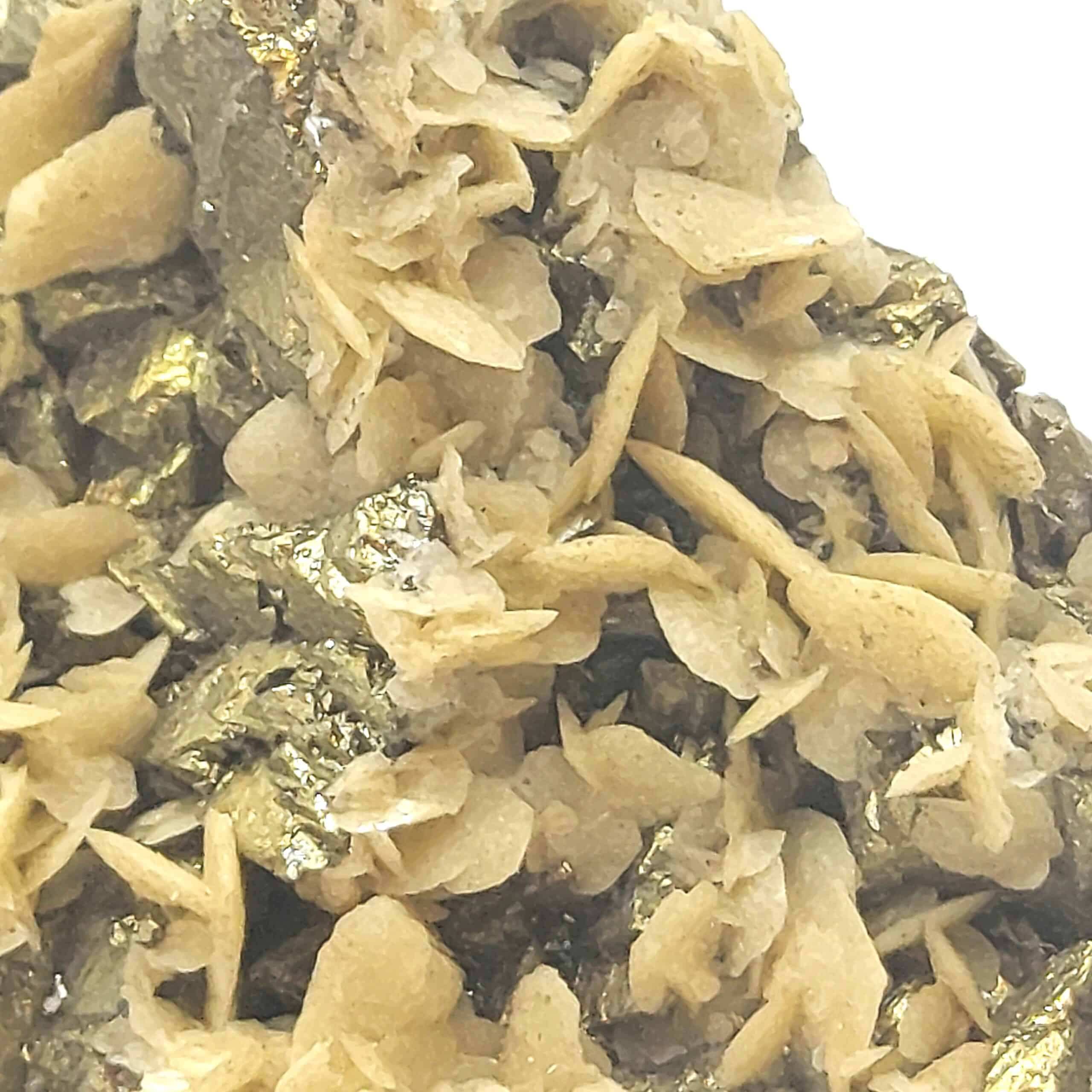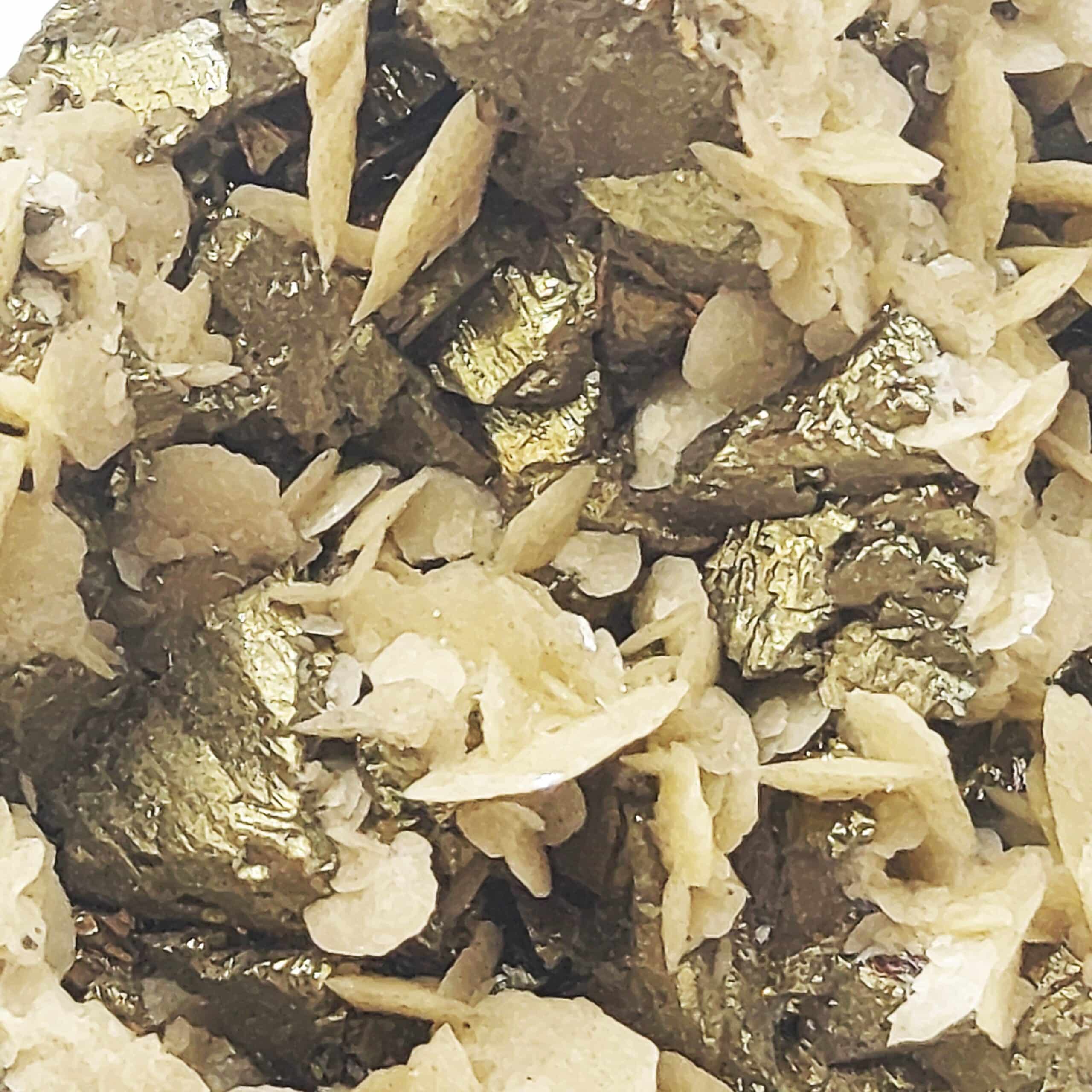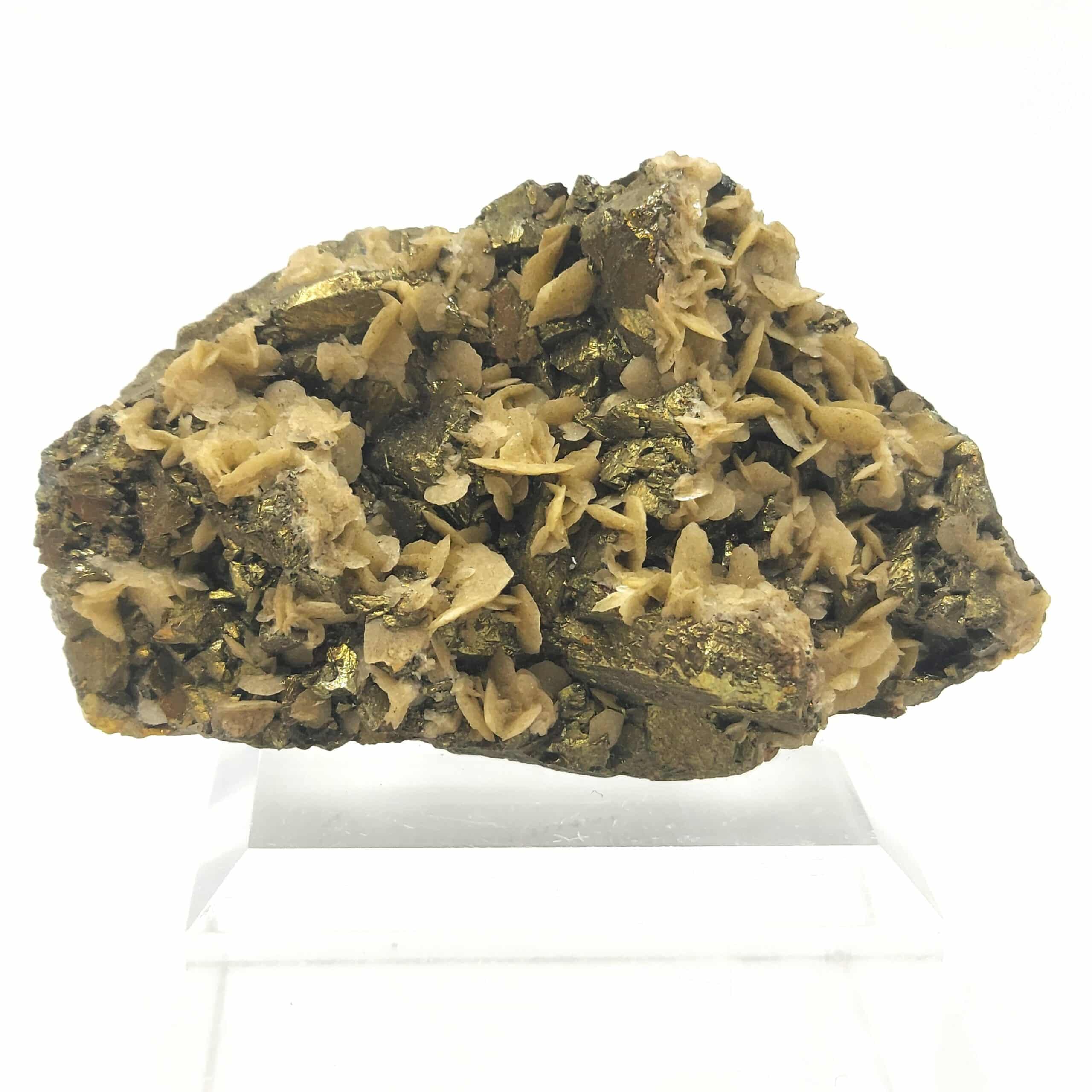 Chalcopyrite dorée, brillante, partiellement recouverte de cristaux de Sidérose en pétales de la mine de Saint Sylvestre à Urbeis, dans le département du Bas-Rhin, en Alsace.