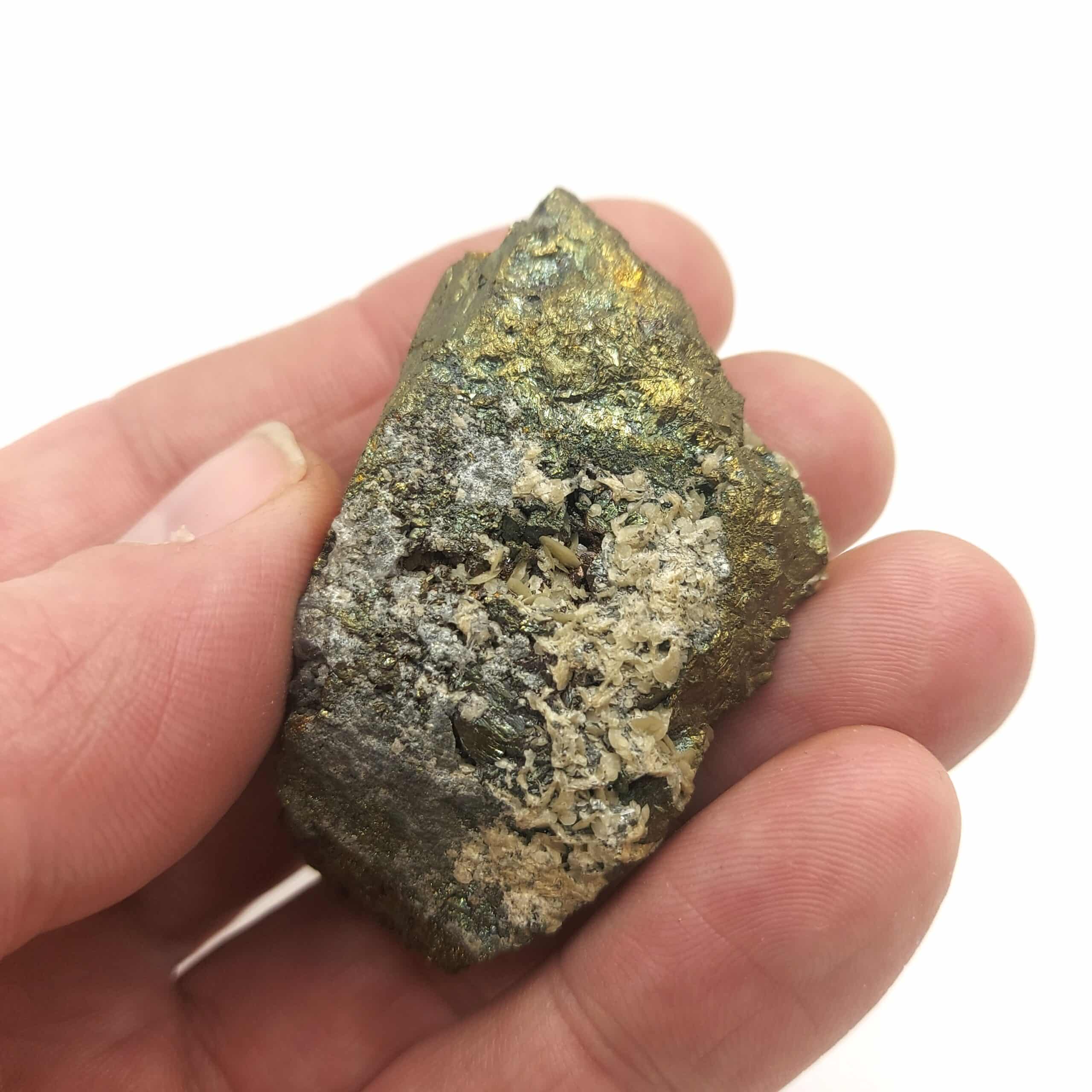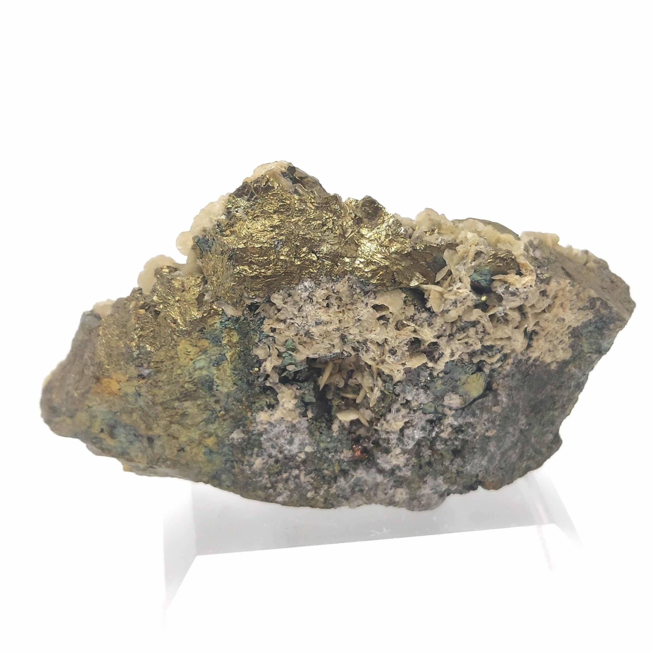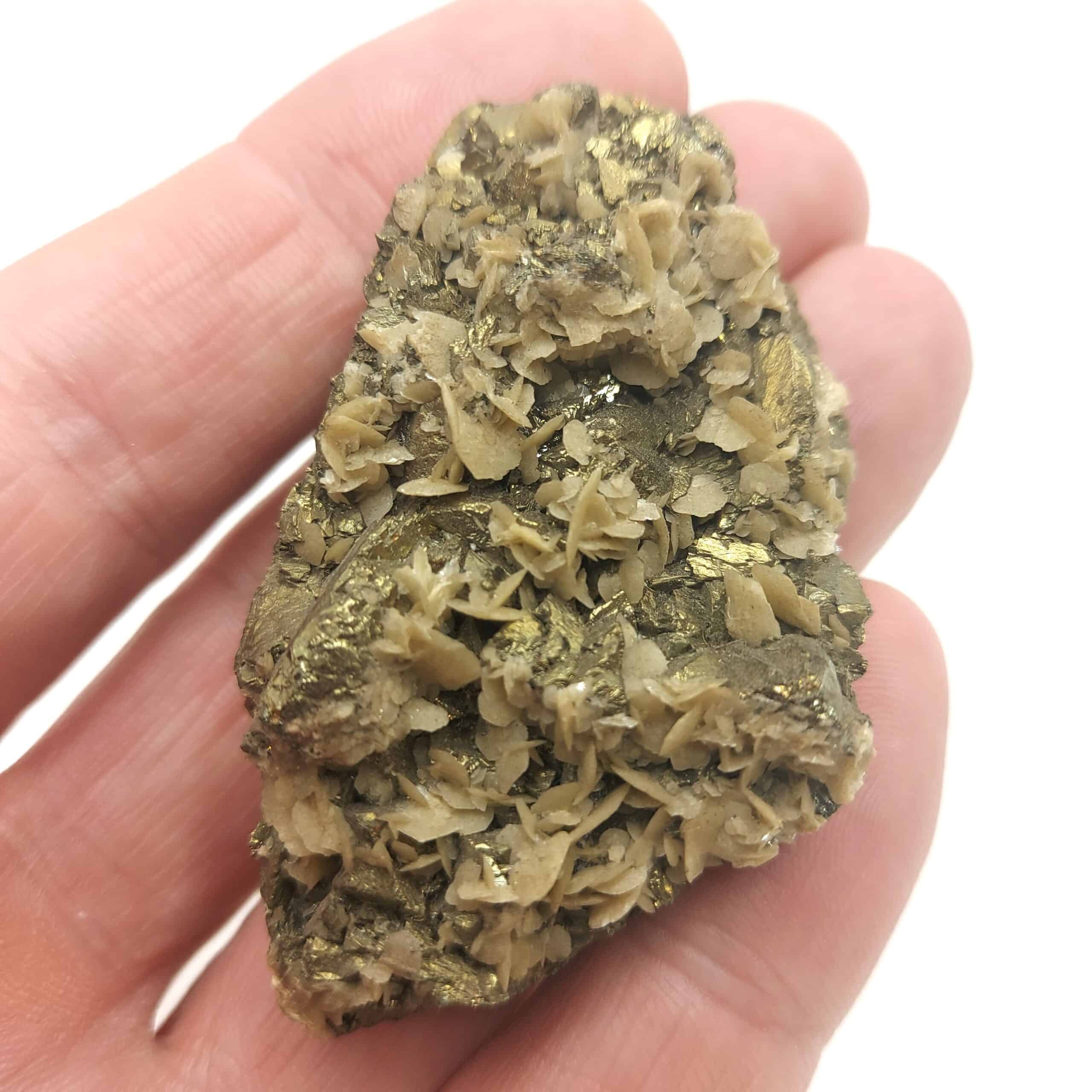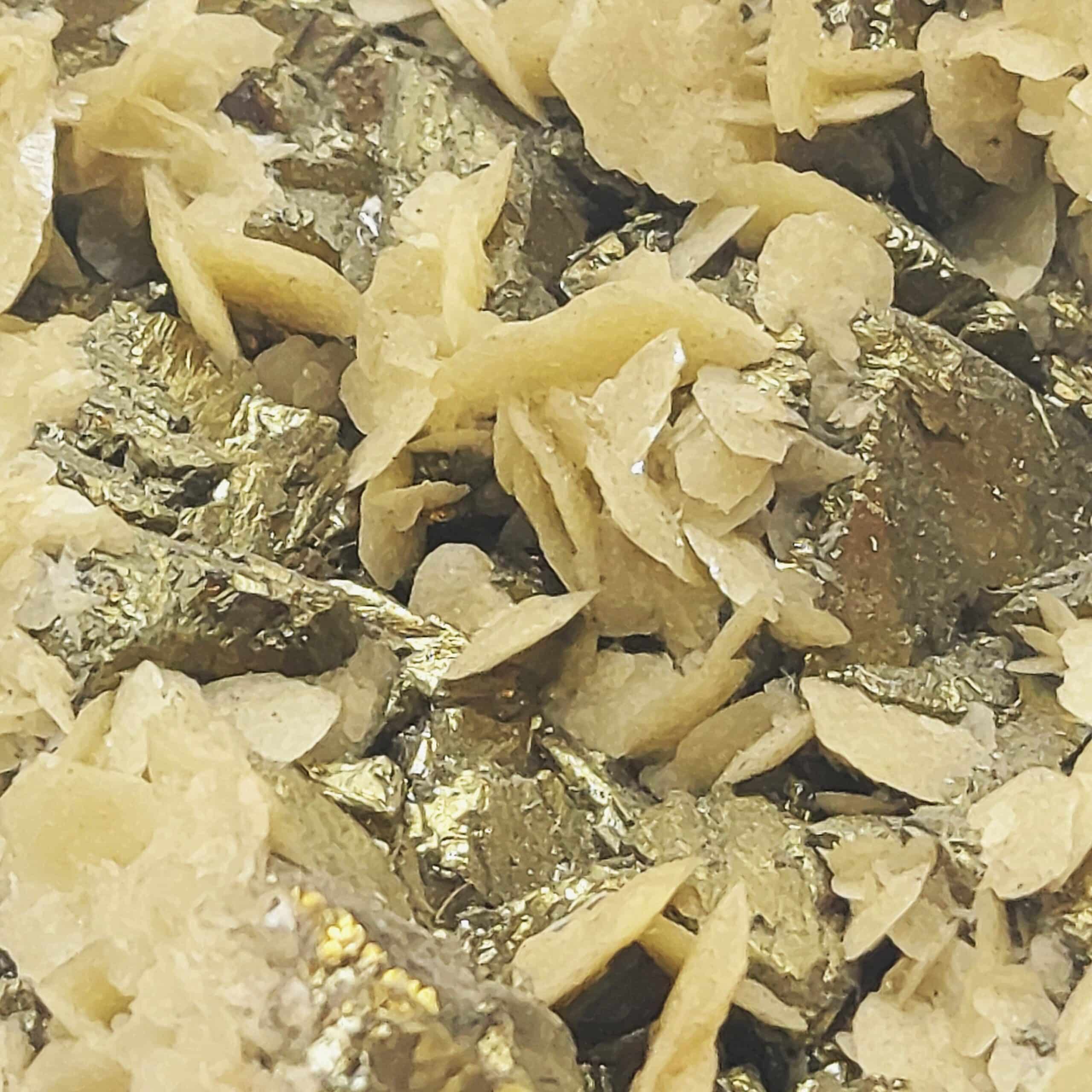 Chalcopyrite dorée, brillante, partiellement recouverte de cristaux de Sidérose en pétales de la mine de Saint Sylvestre à Urbeis, dans le département du Bas-Rhin, en Alsace.