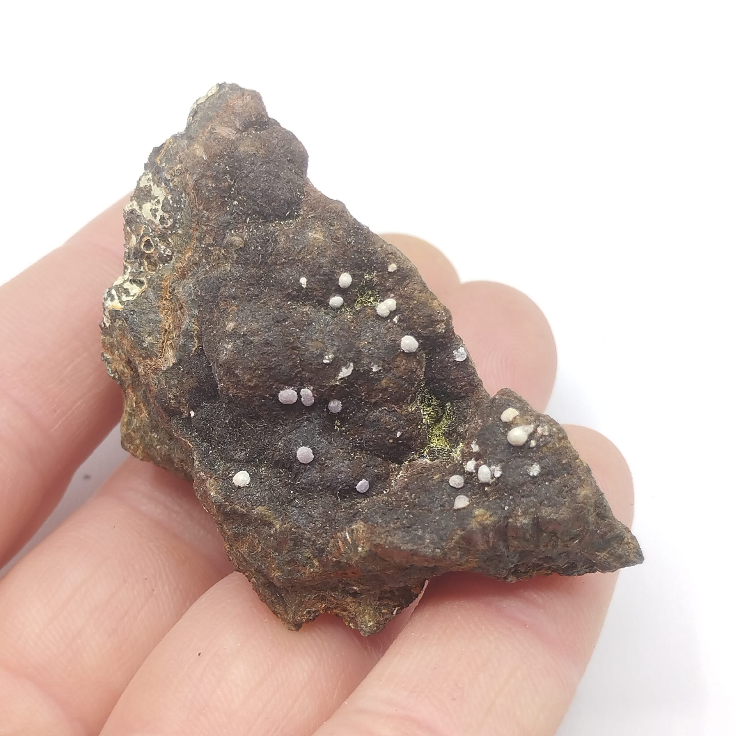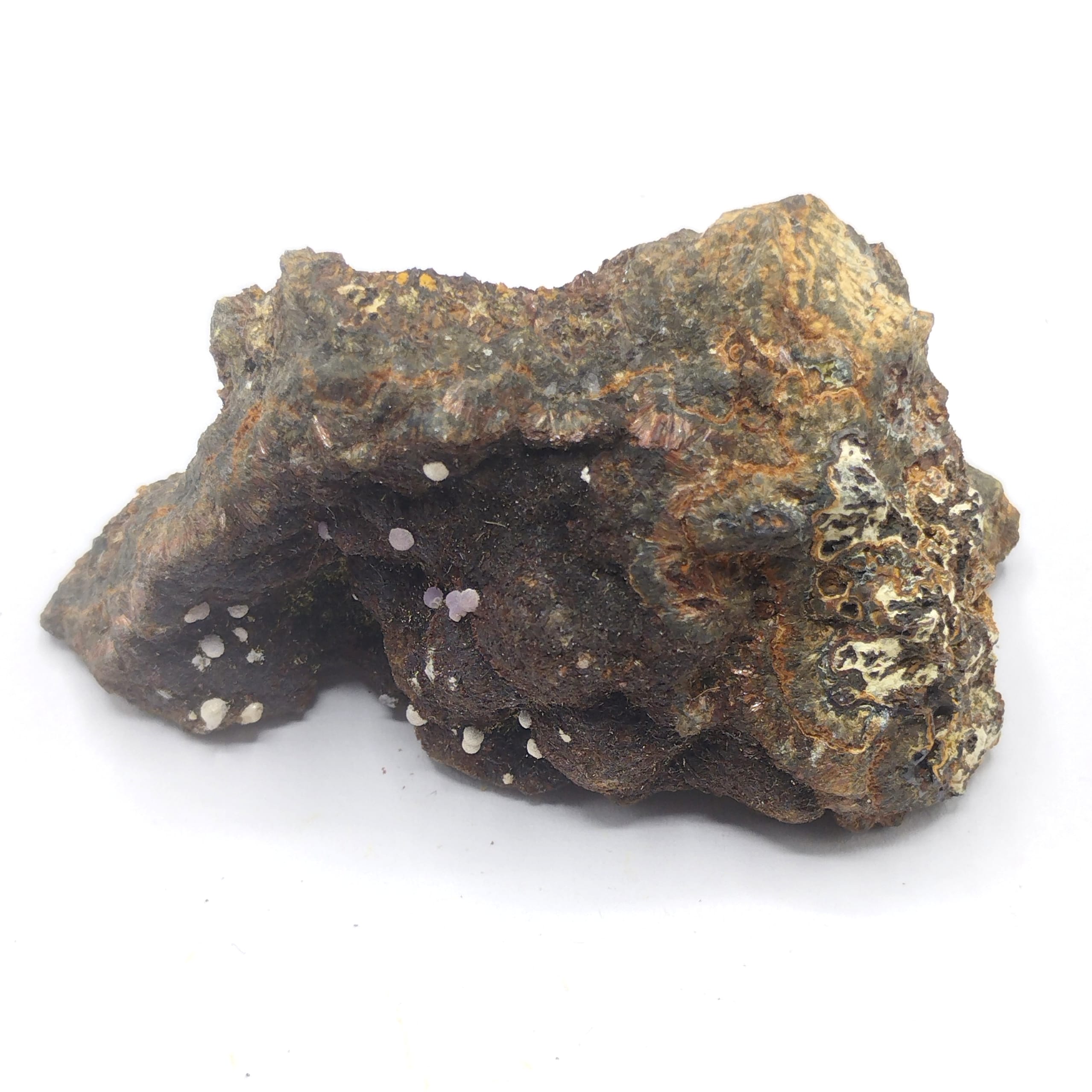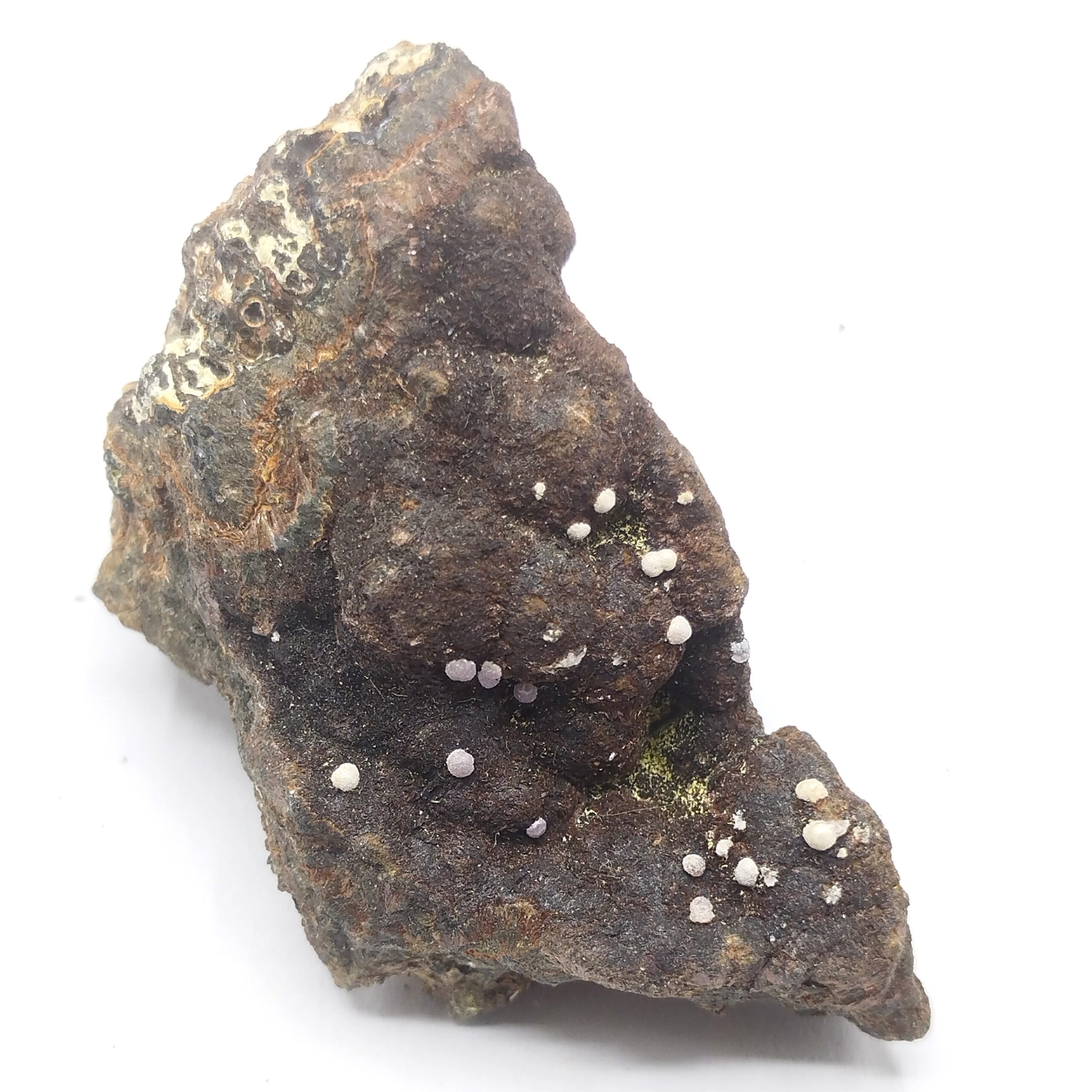 Sphères blanches de cristaux aciculaires de churchite (riche en Yttrium) sur une matrice de limonite/goethite en association avec de la béraunite (rouge?) en provenance de l’Alabama aux USA.