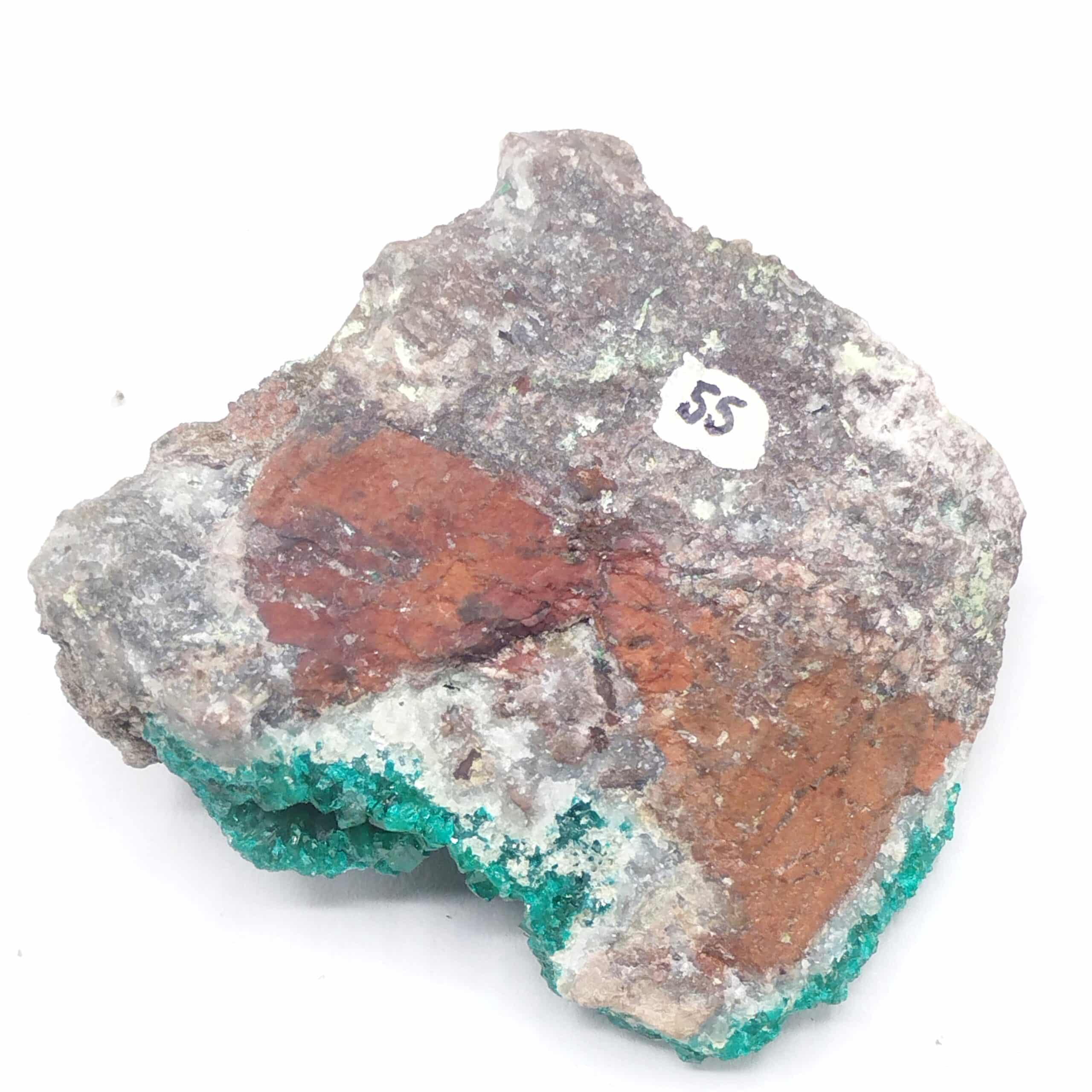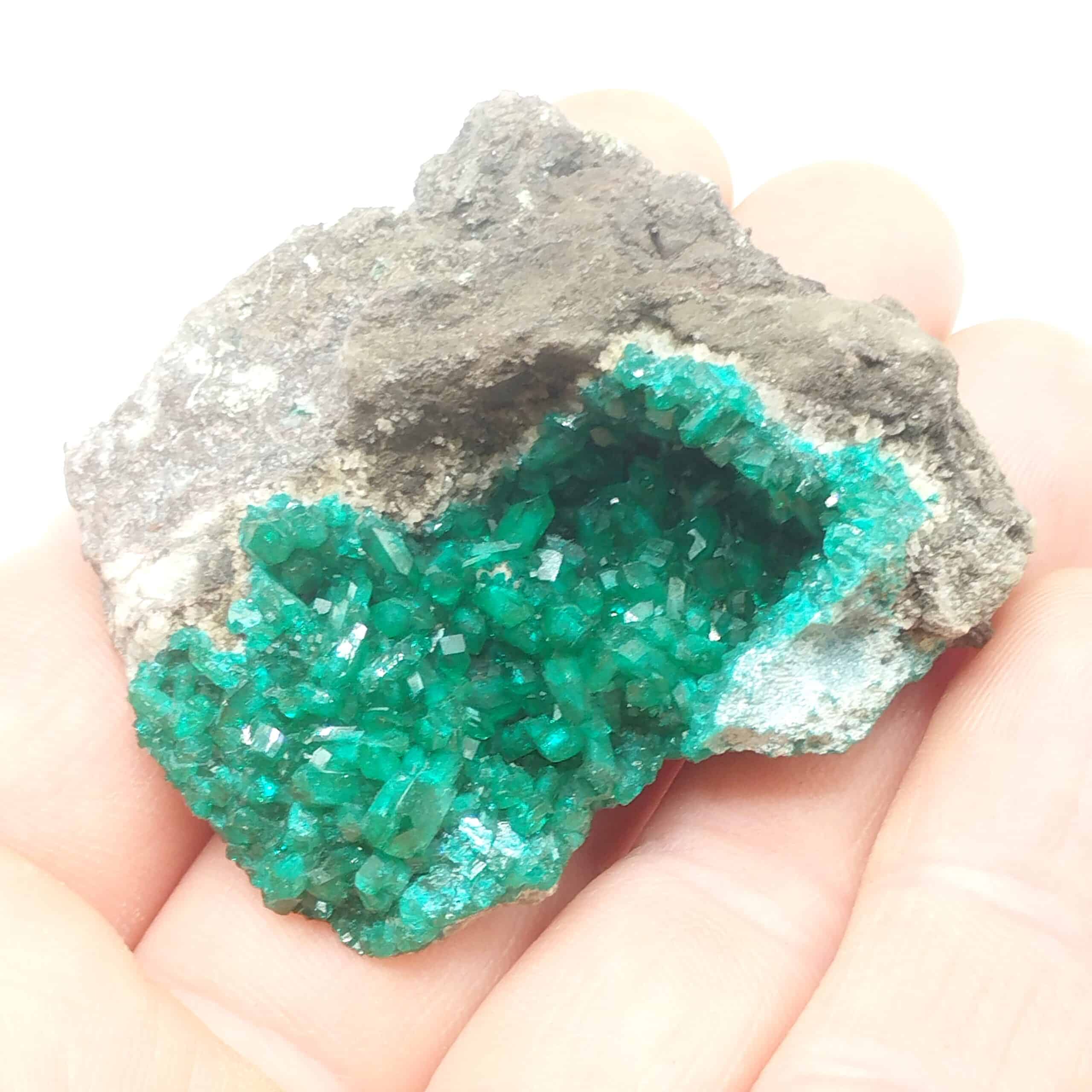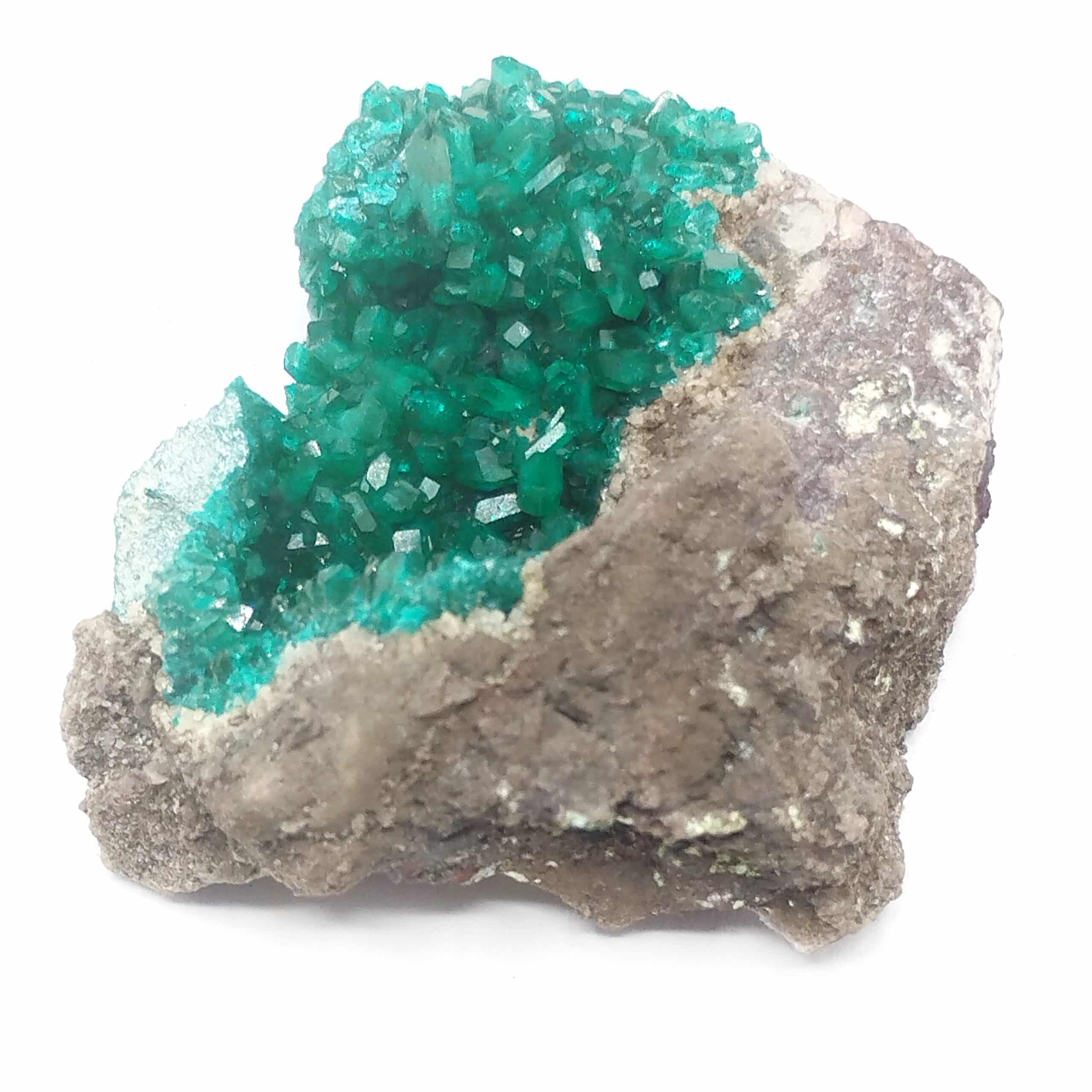 Cristaux de dioptase d’un magnifique vert éclatant sur gangue en provenance de la région de Mindouli au Congo.