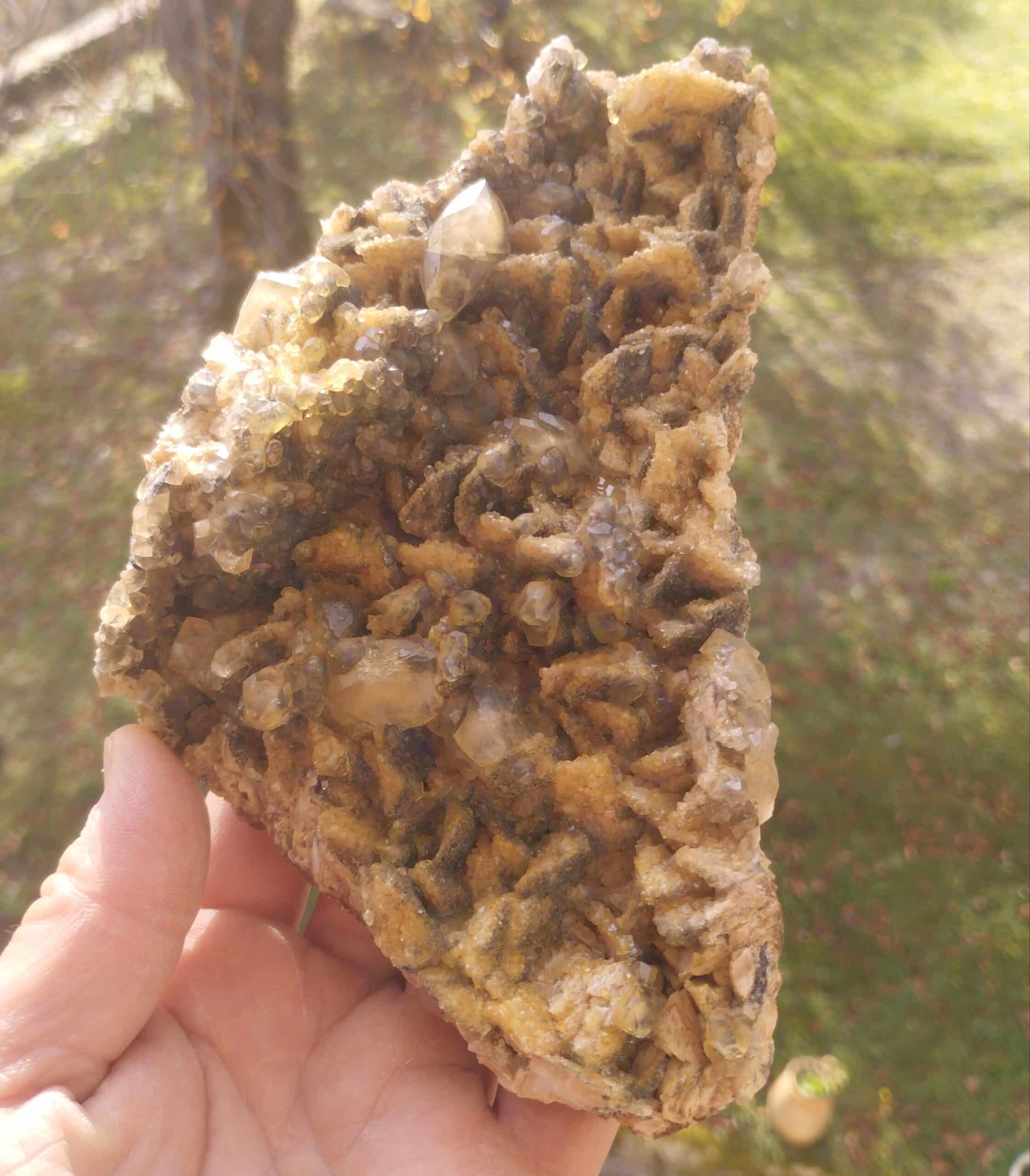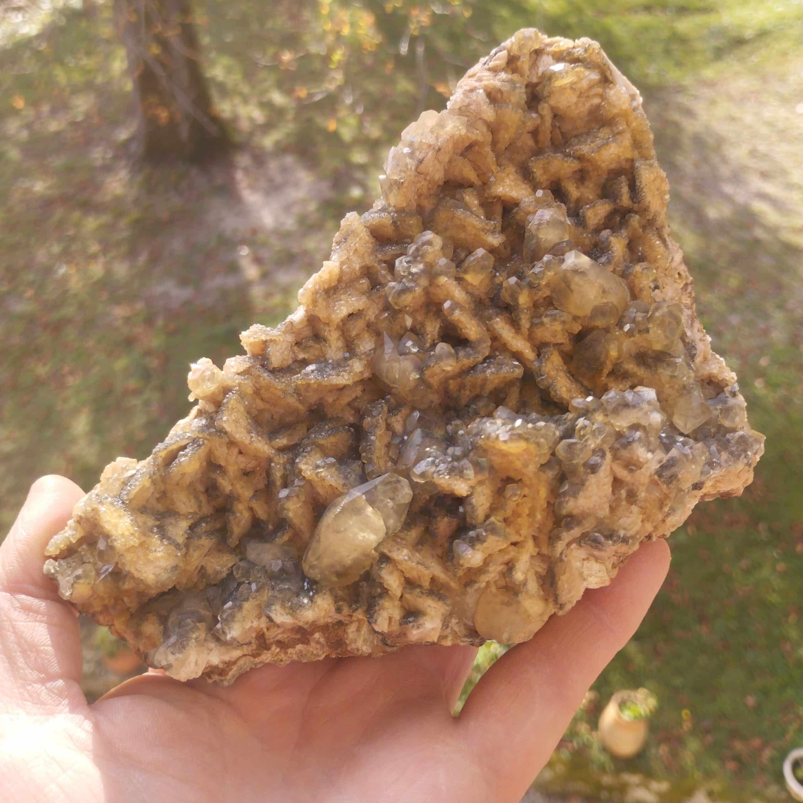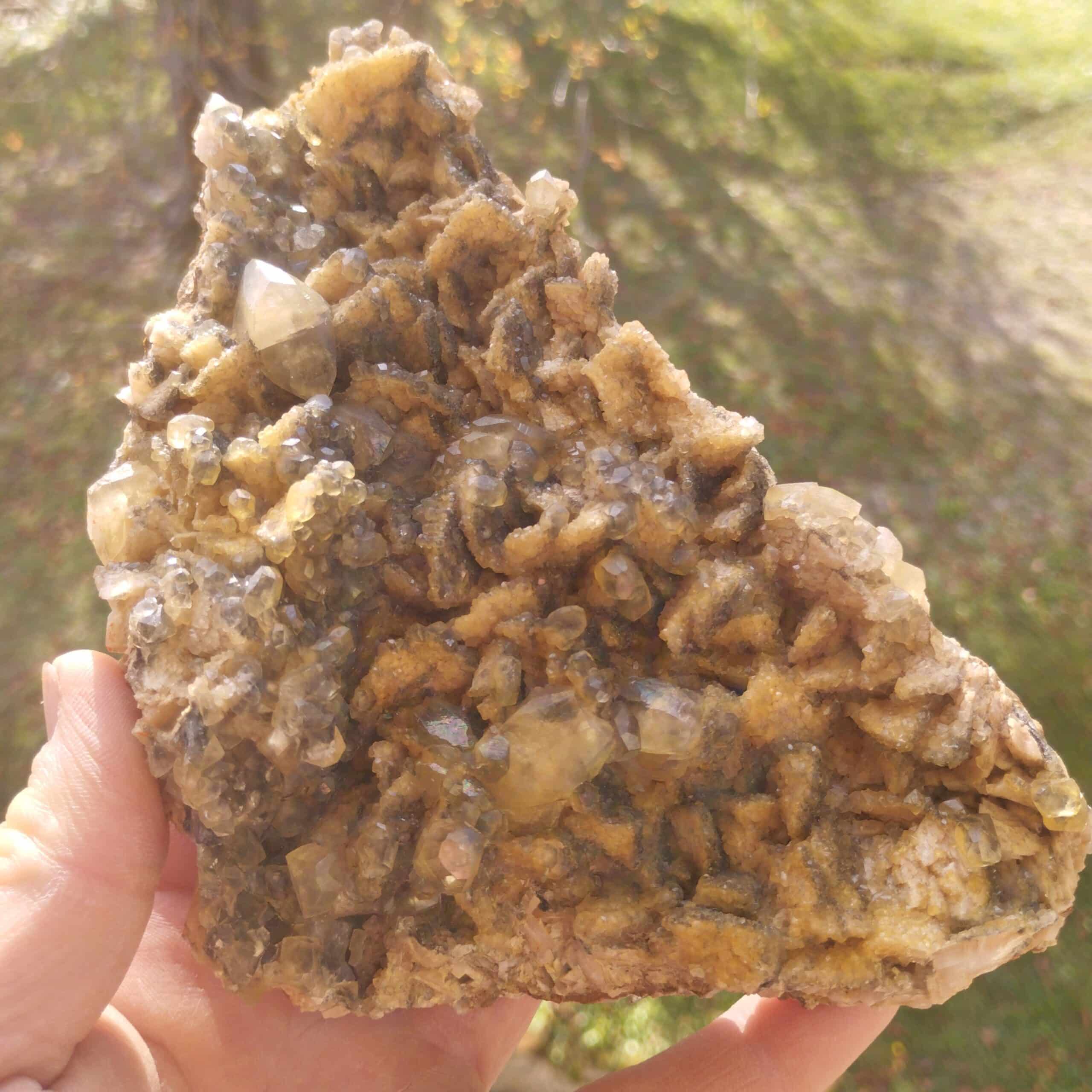 Grand spécimen de cristaux de calcite sur dolomite présentant des inclusions noires de bitume.