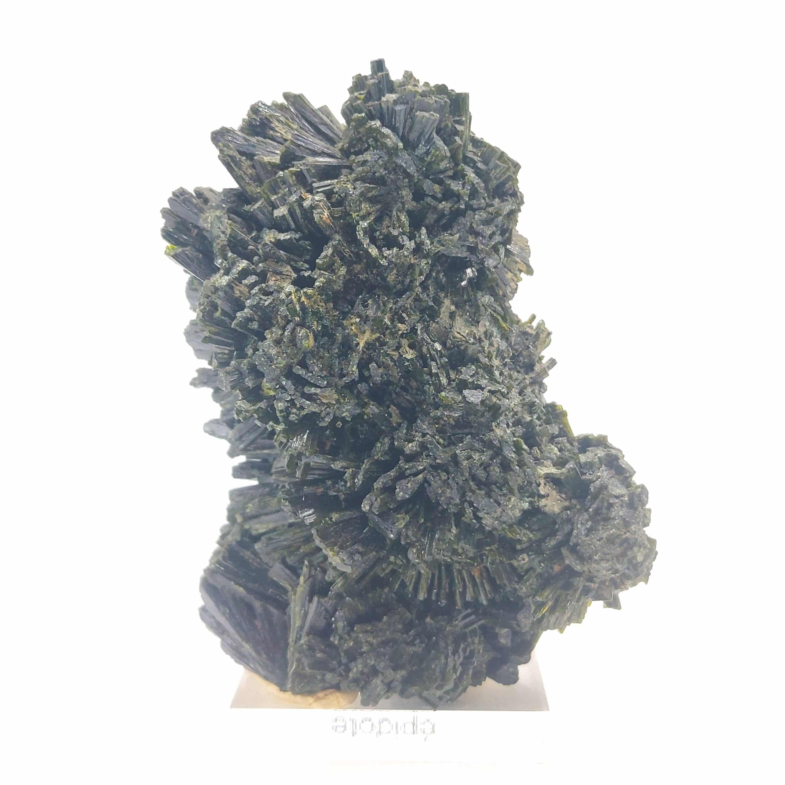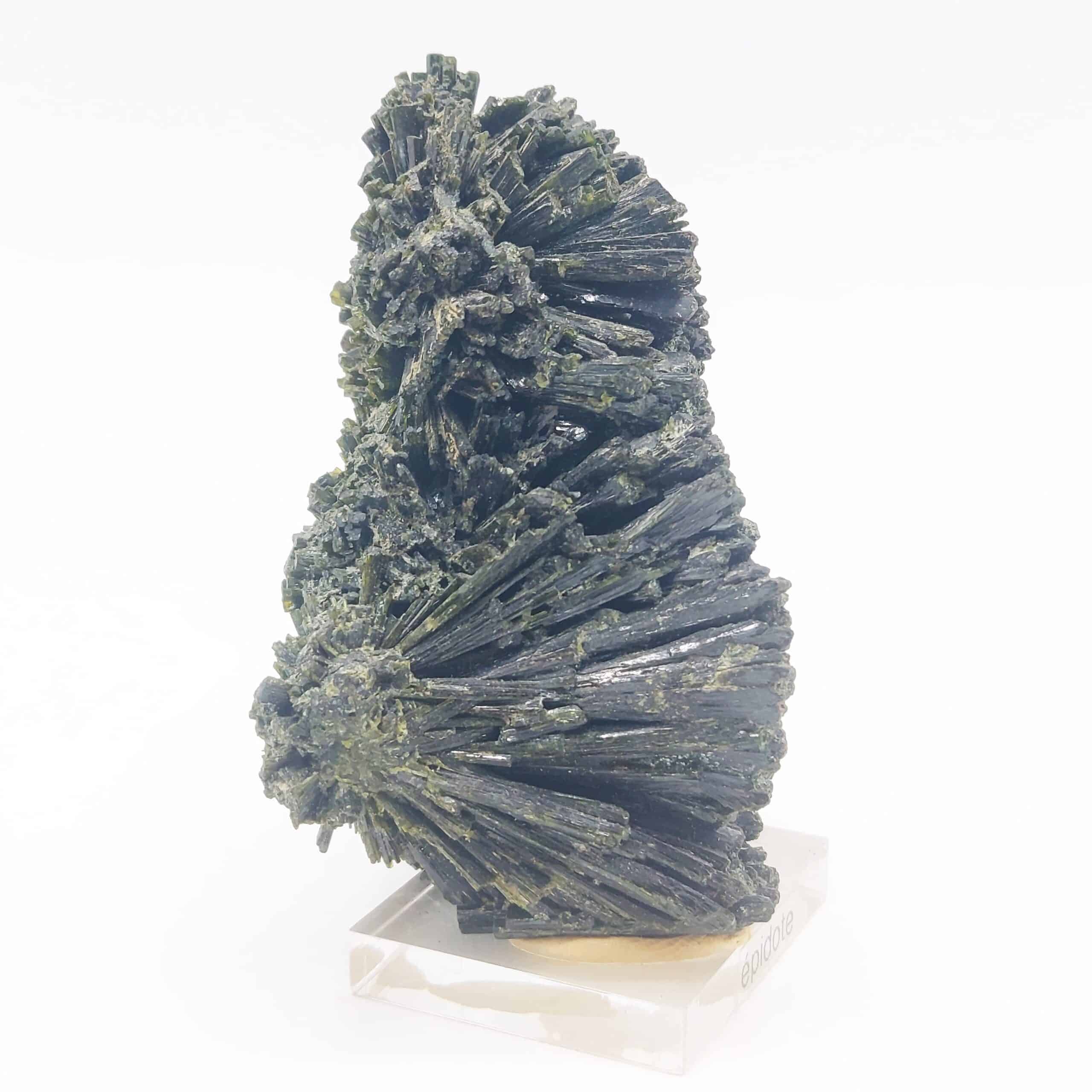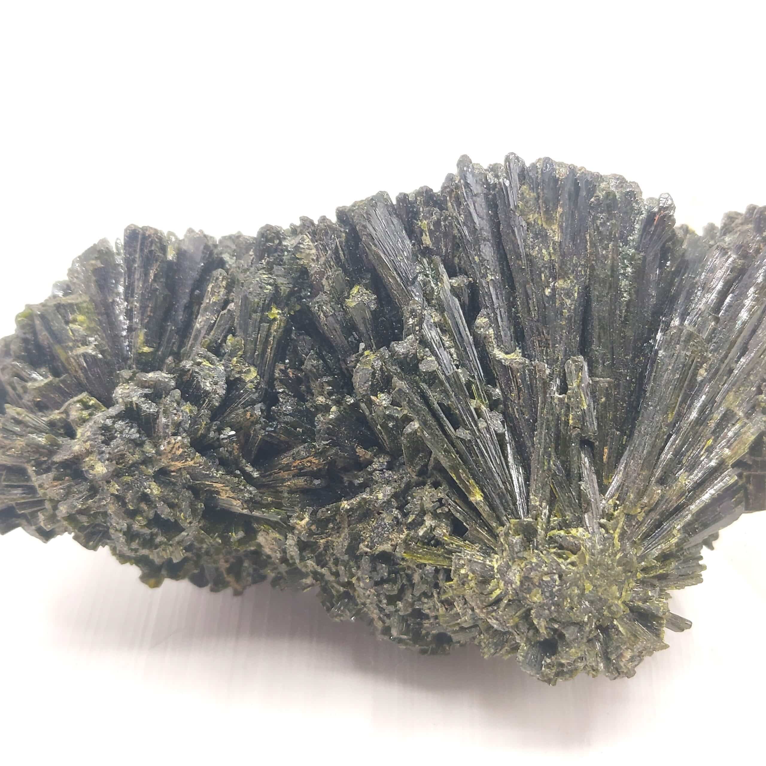 Amas de cristaux prismatiques allongés, d’un vert profond, densément imbriqués, formant un agrégat sculptural et rayonnant, typique de l’épidote de cette région, en provenance de Madagascar.