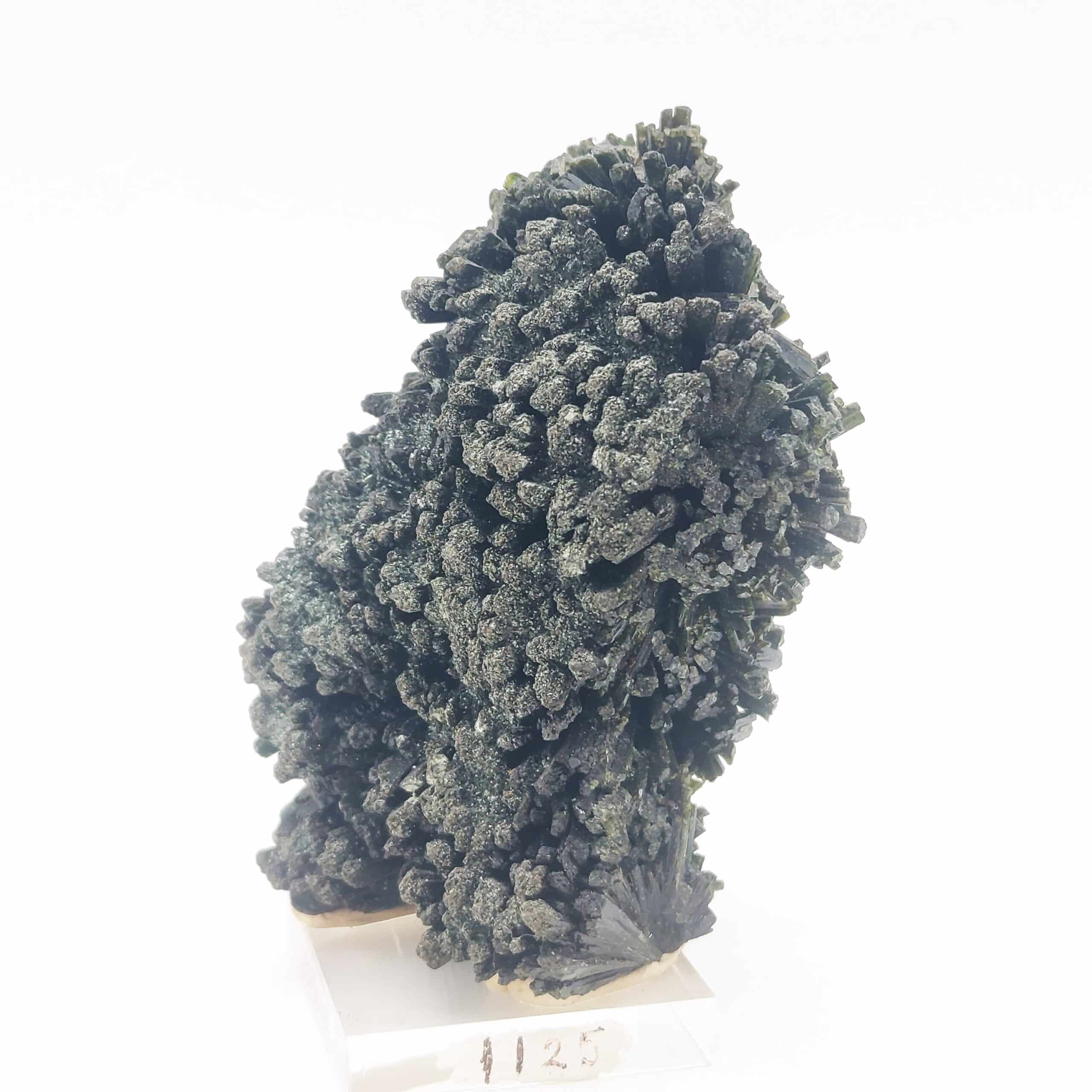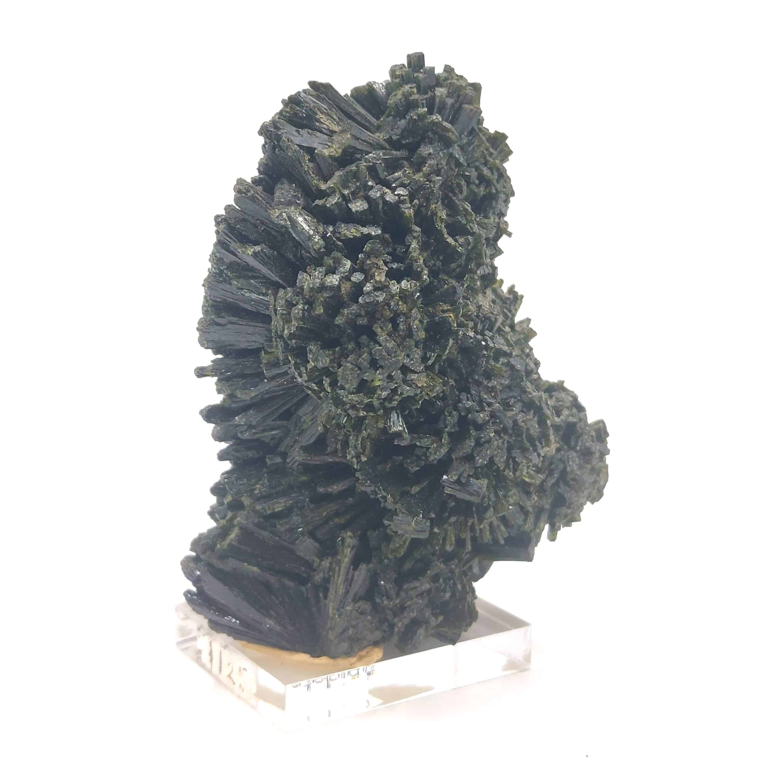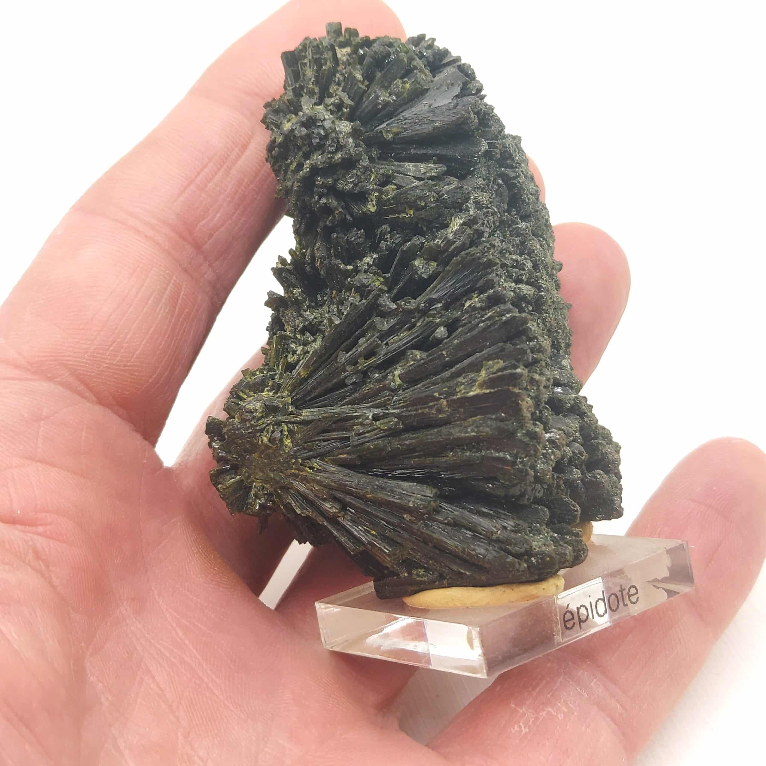 Amas de cristaux prismatiques allongés, d’un vert profond, densément imbriqués, formant un agrégat sculptural et rayonnant, typique de l’épidote de cette région, en provenance de Madagascar.