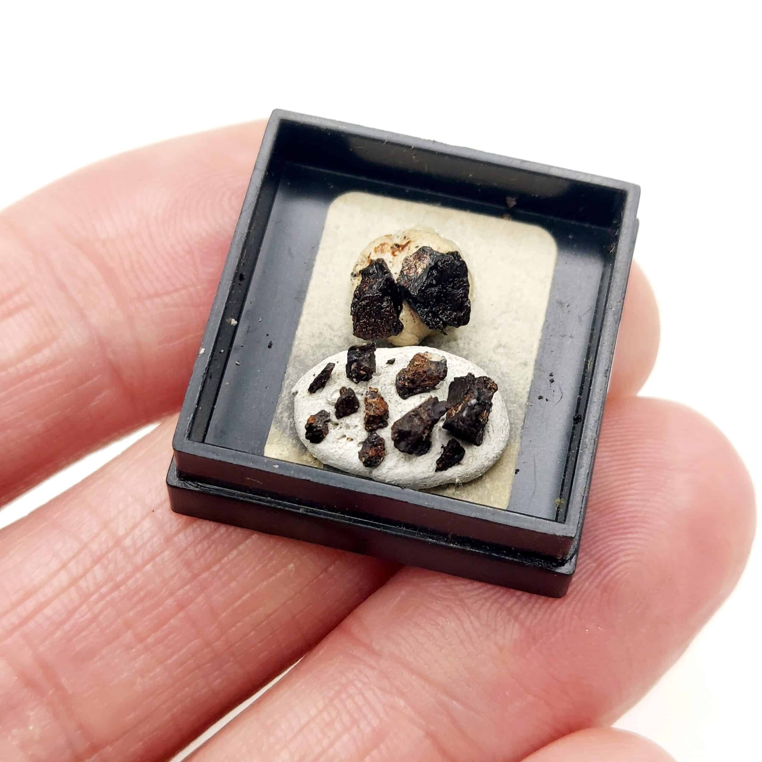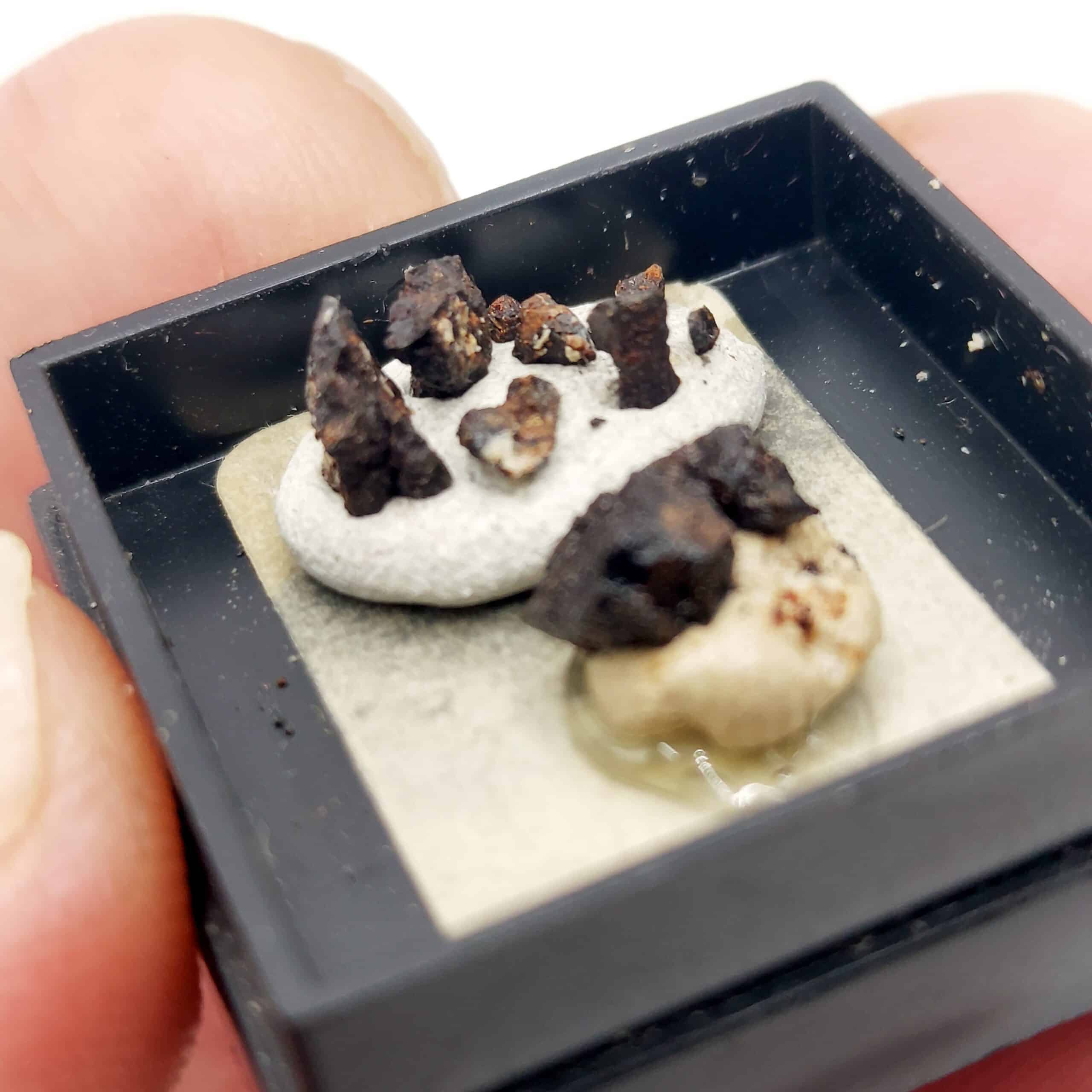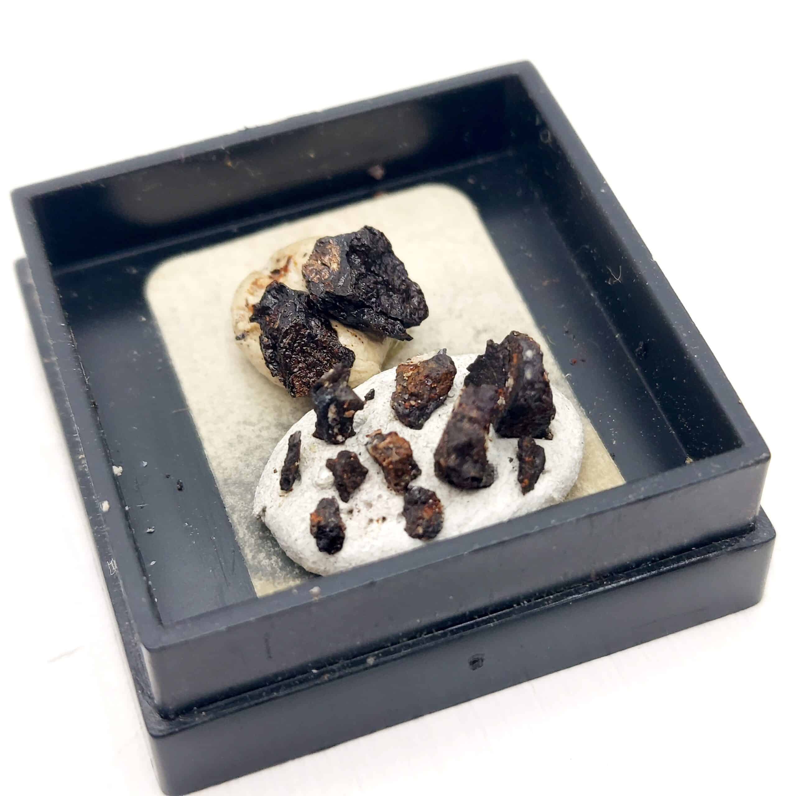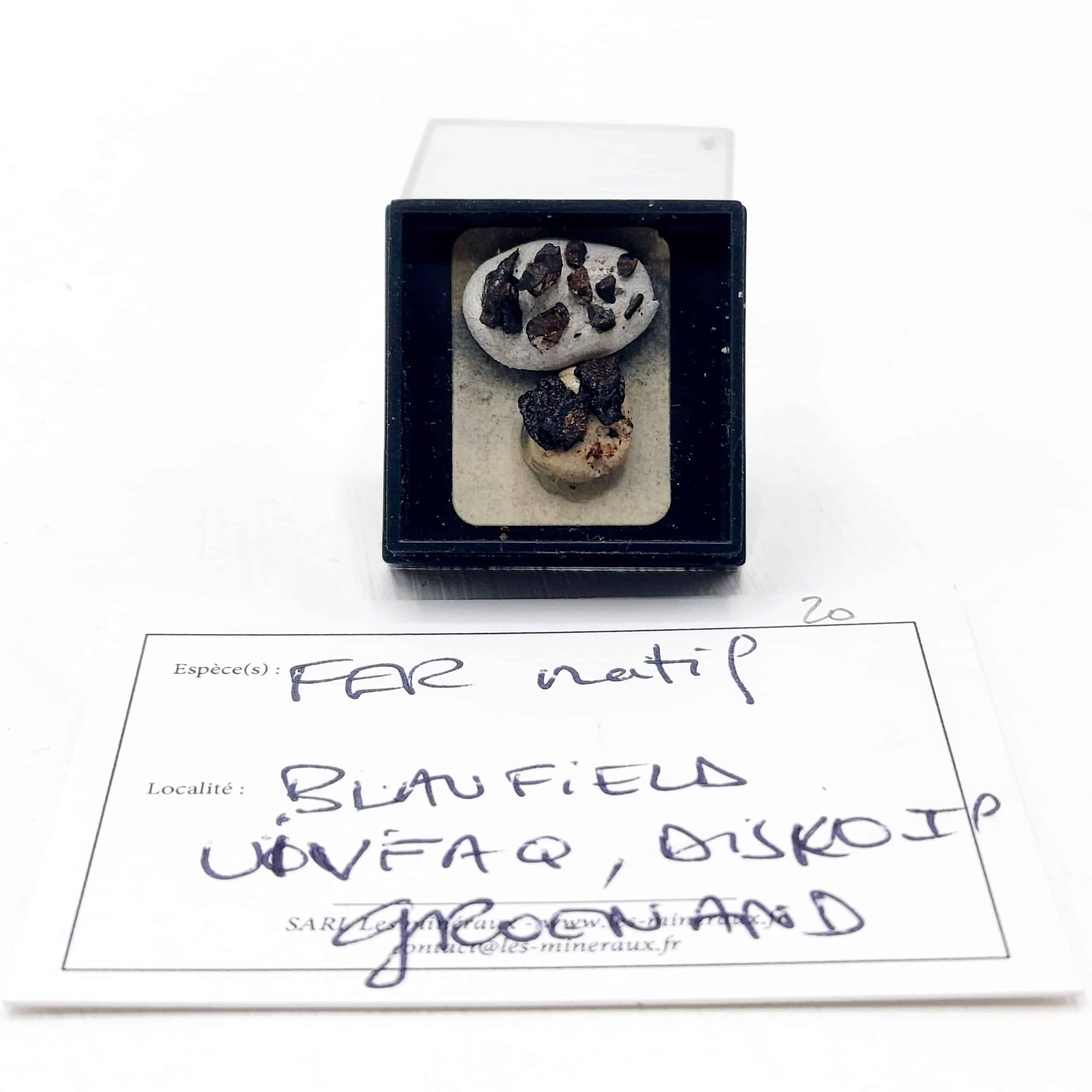 Le fer natif est EXTRÊMEMENT RARE dans les roches ignées, bien qu’il constitue la majeure partie du noyau terrestre. Il s’agit ici de petits fragments individuels en provenance de Uivfaq, île de Disko, Qeqertalik, Groenland.