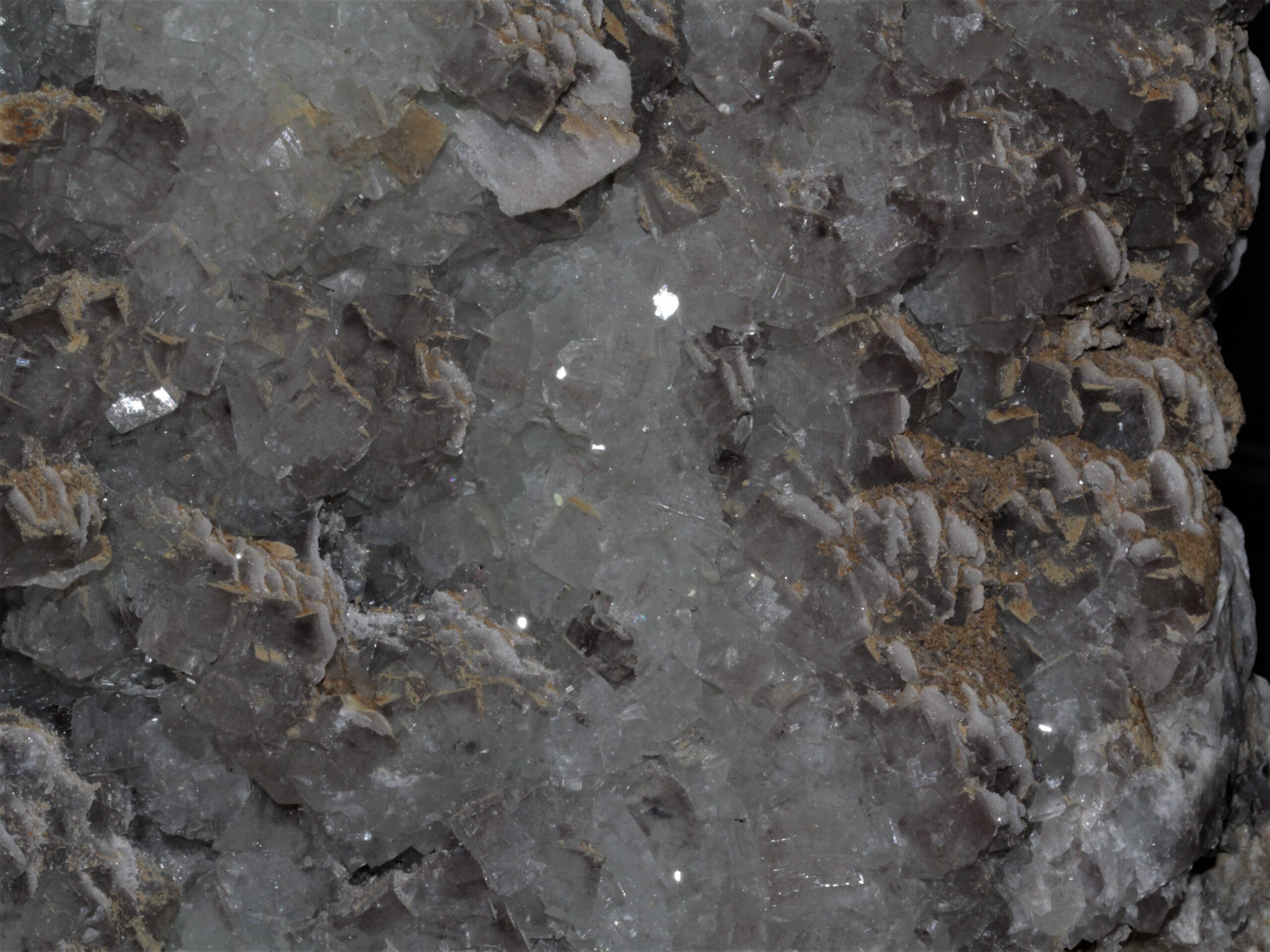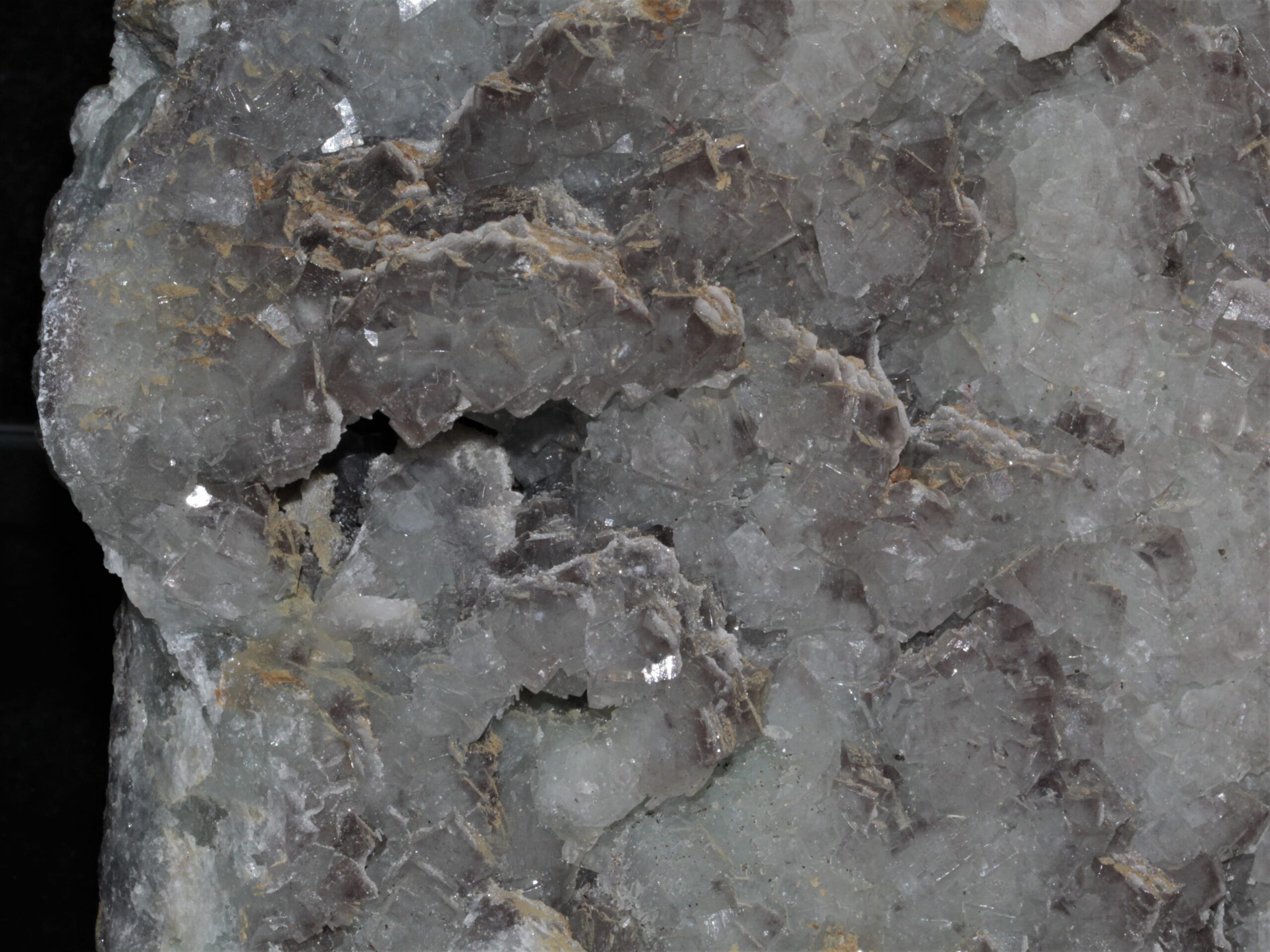 Grand spécimen de fluorite légèrement bleutée à vert d’eau, les cristaux sont principalement cubiques, et de multiple petites géodes agrémentent l’échantillon. La fluorite est en association à la barytine ici en petites tablettes regroupées en coulées.