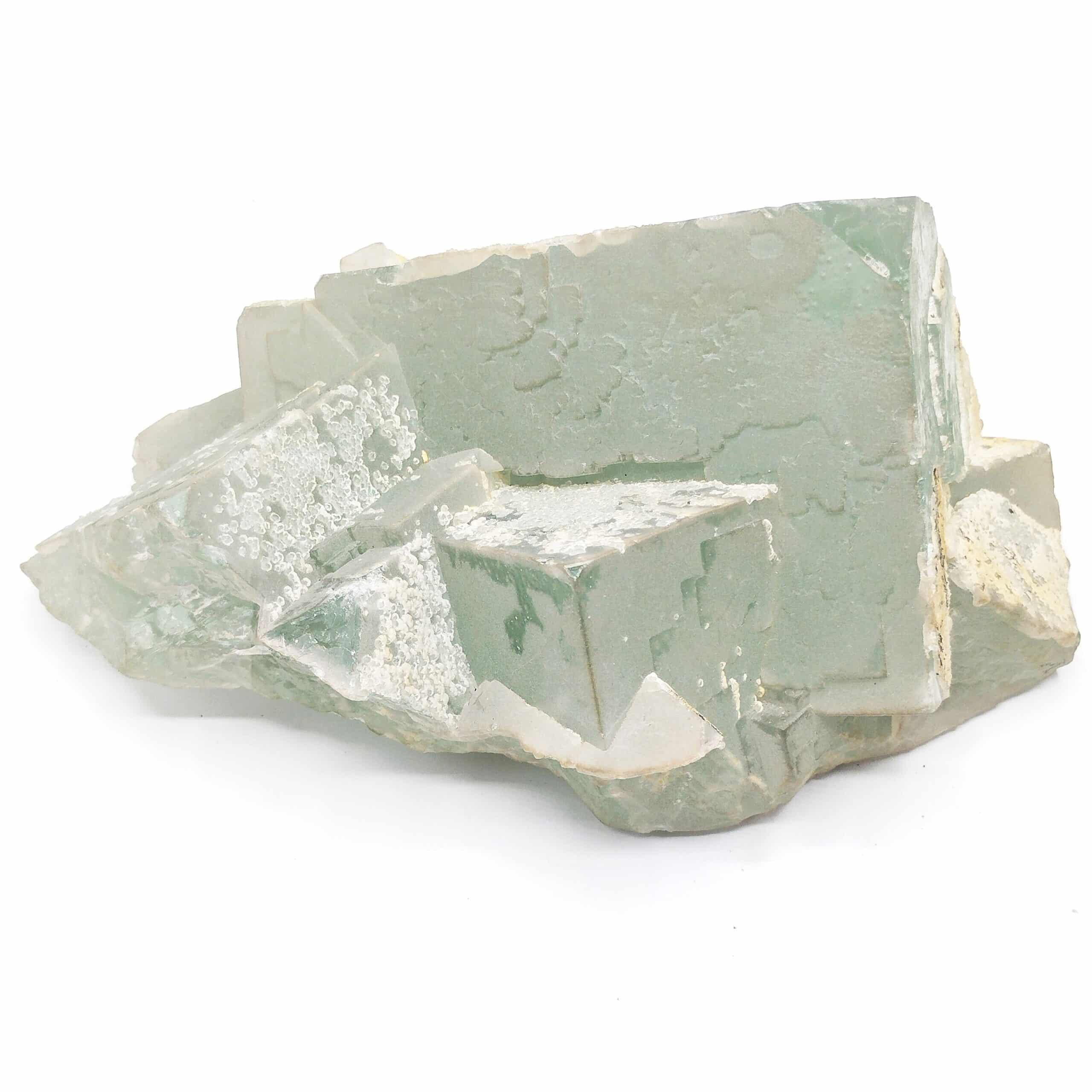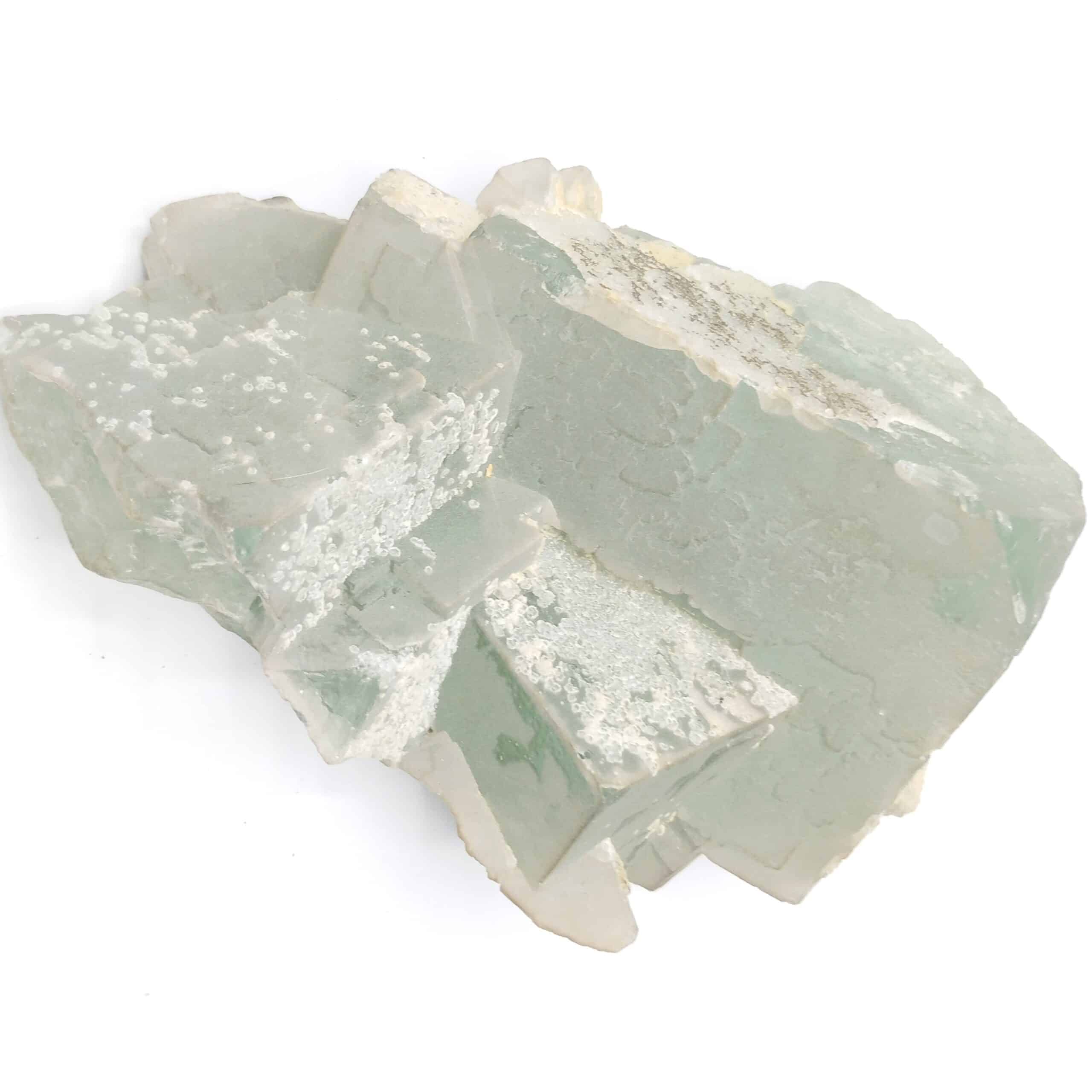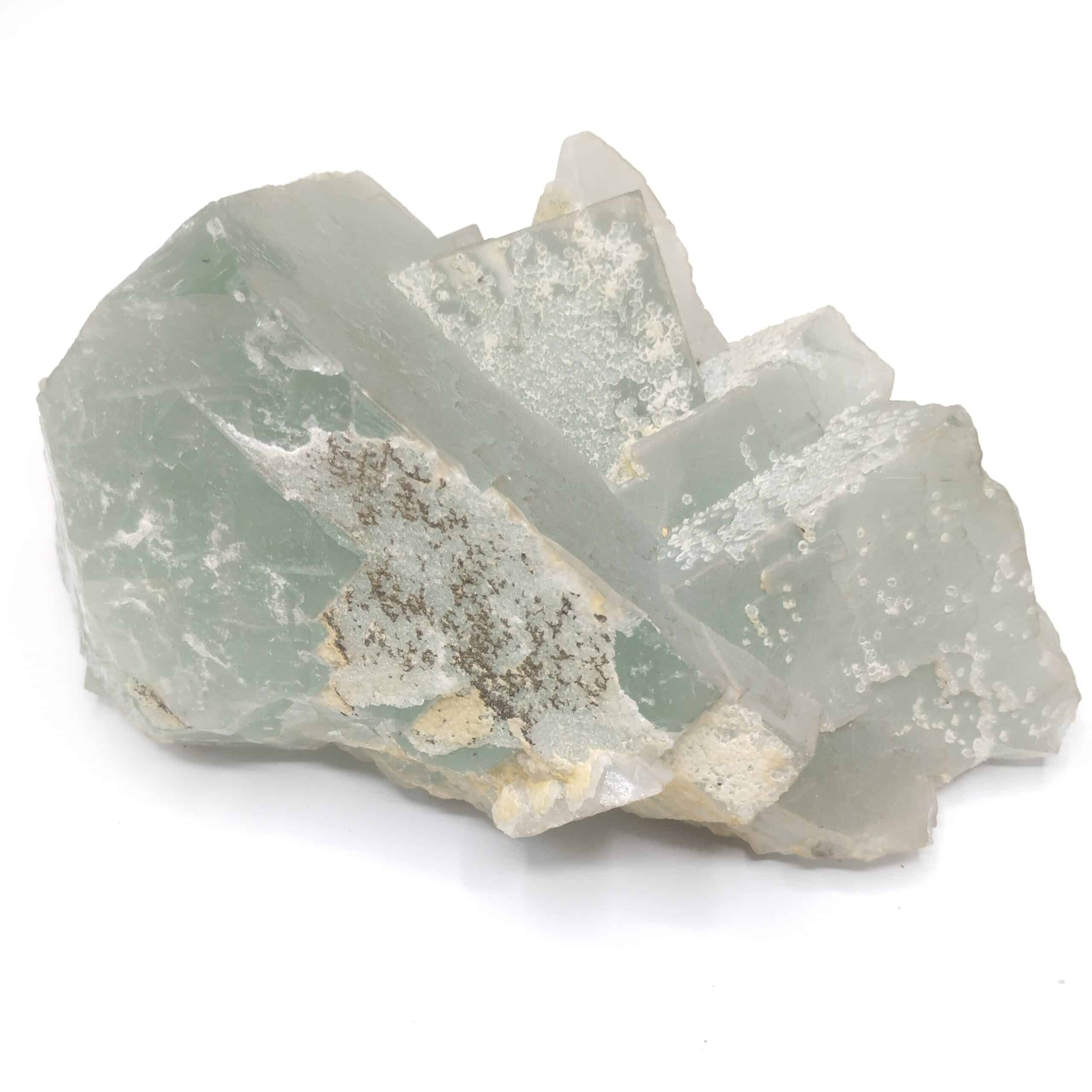 Groupe de très grands cristaux de fluorite bleu-vert, parfois recouverts de fins cristaux de quartz en provenance de l’ancienne mine de Chavaniac-Lafayette en Haute Loire.