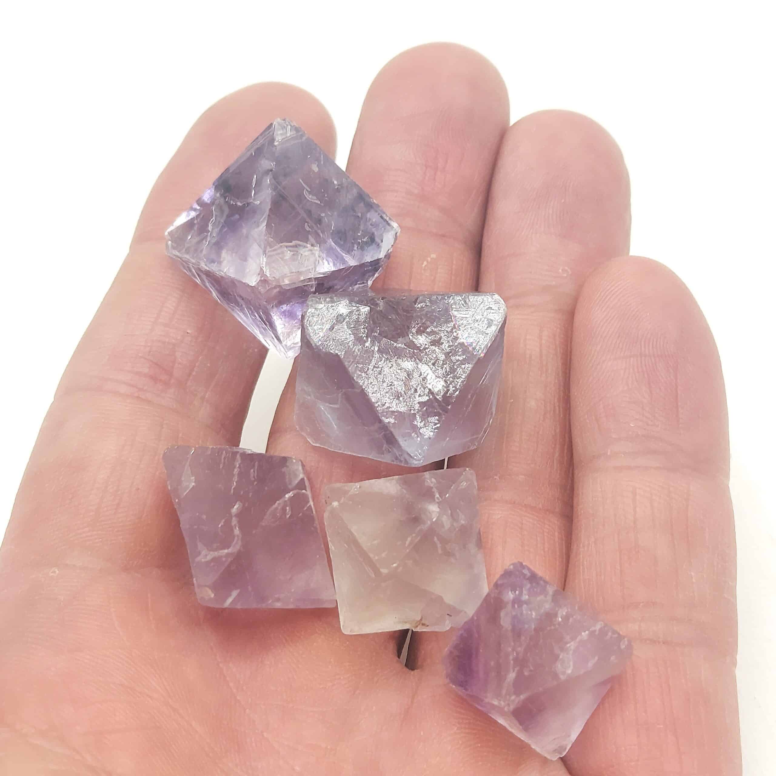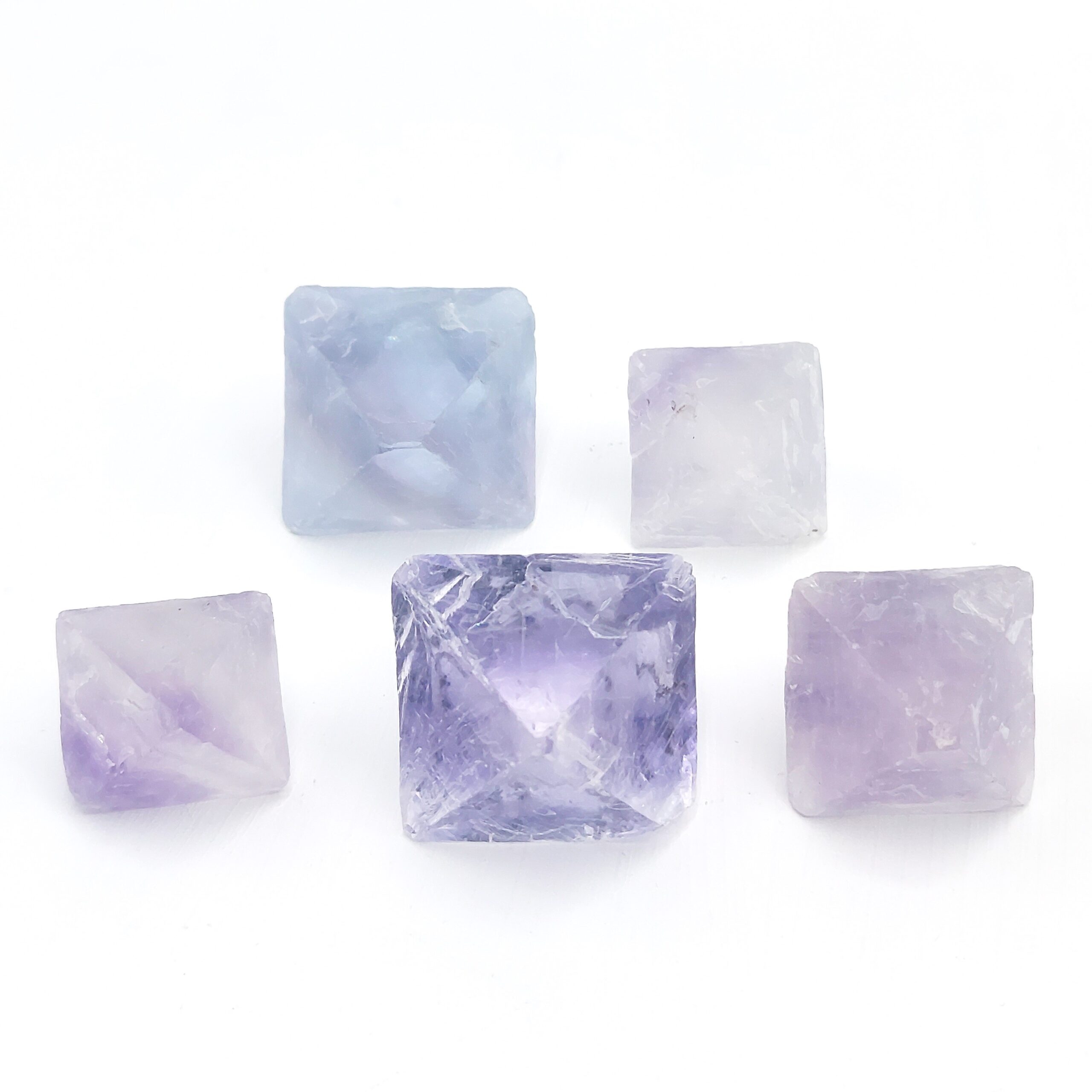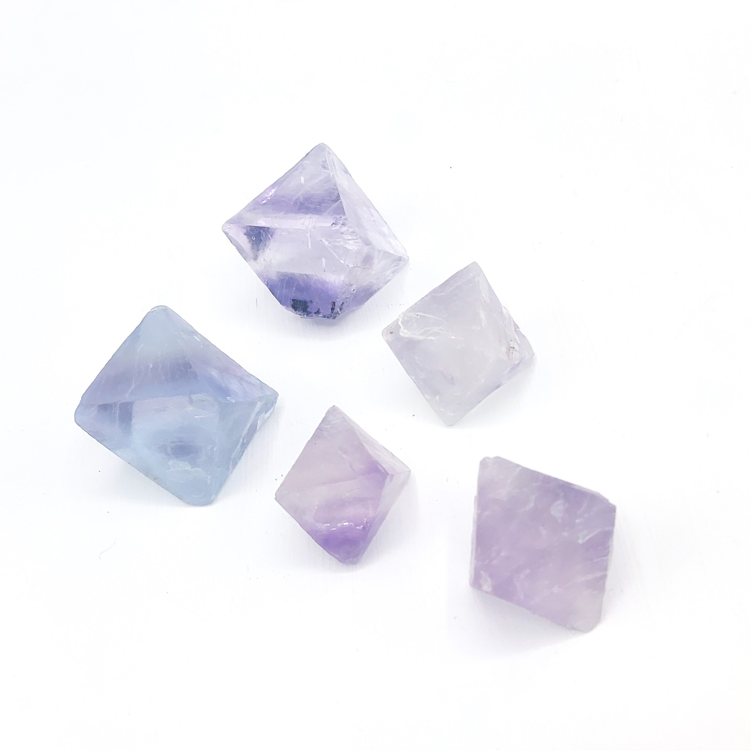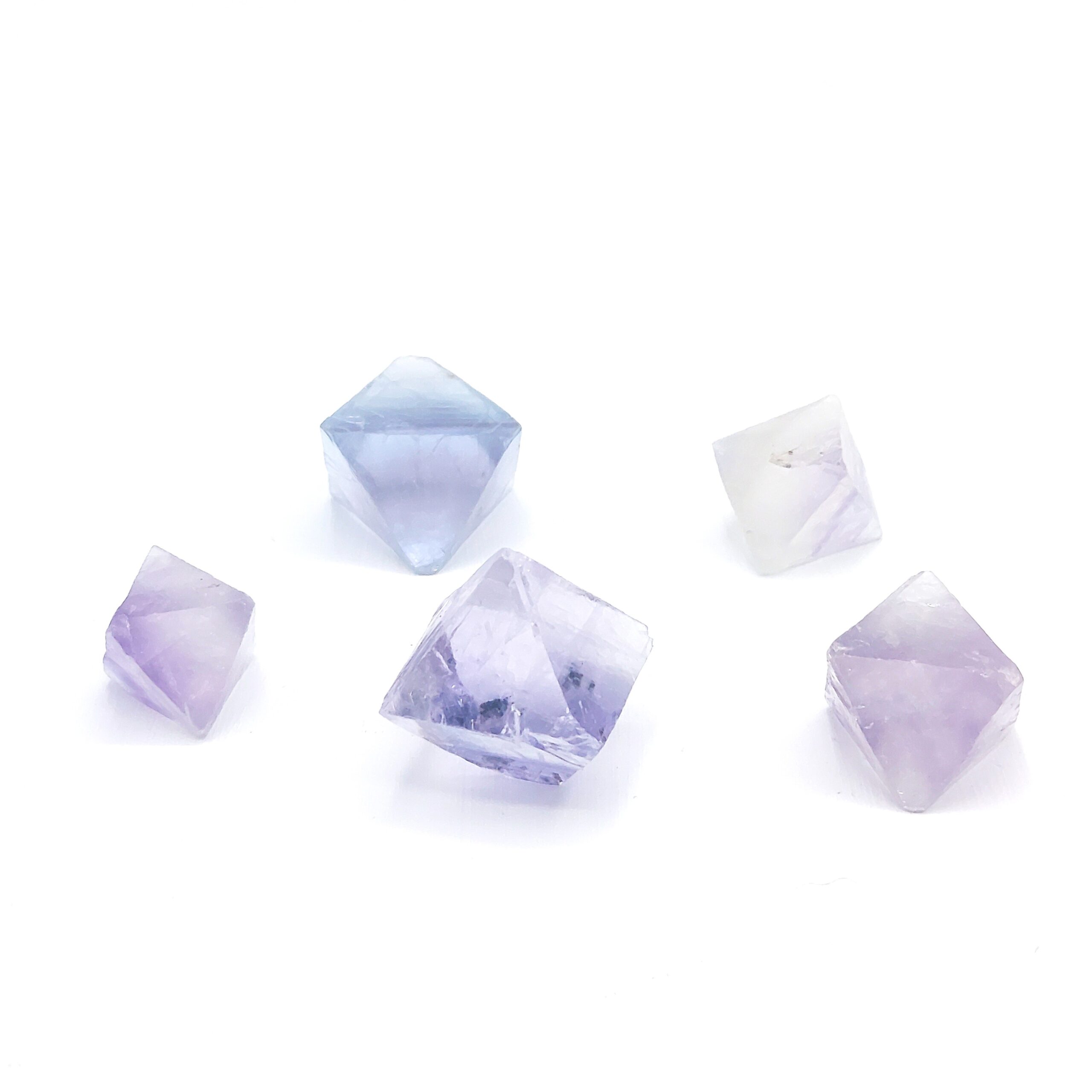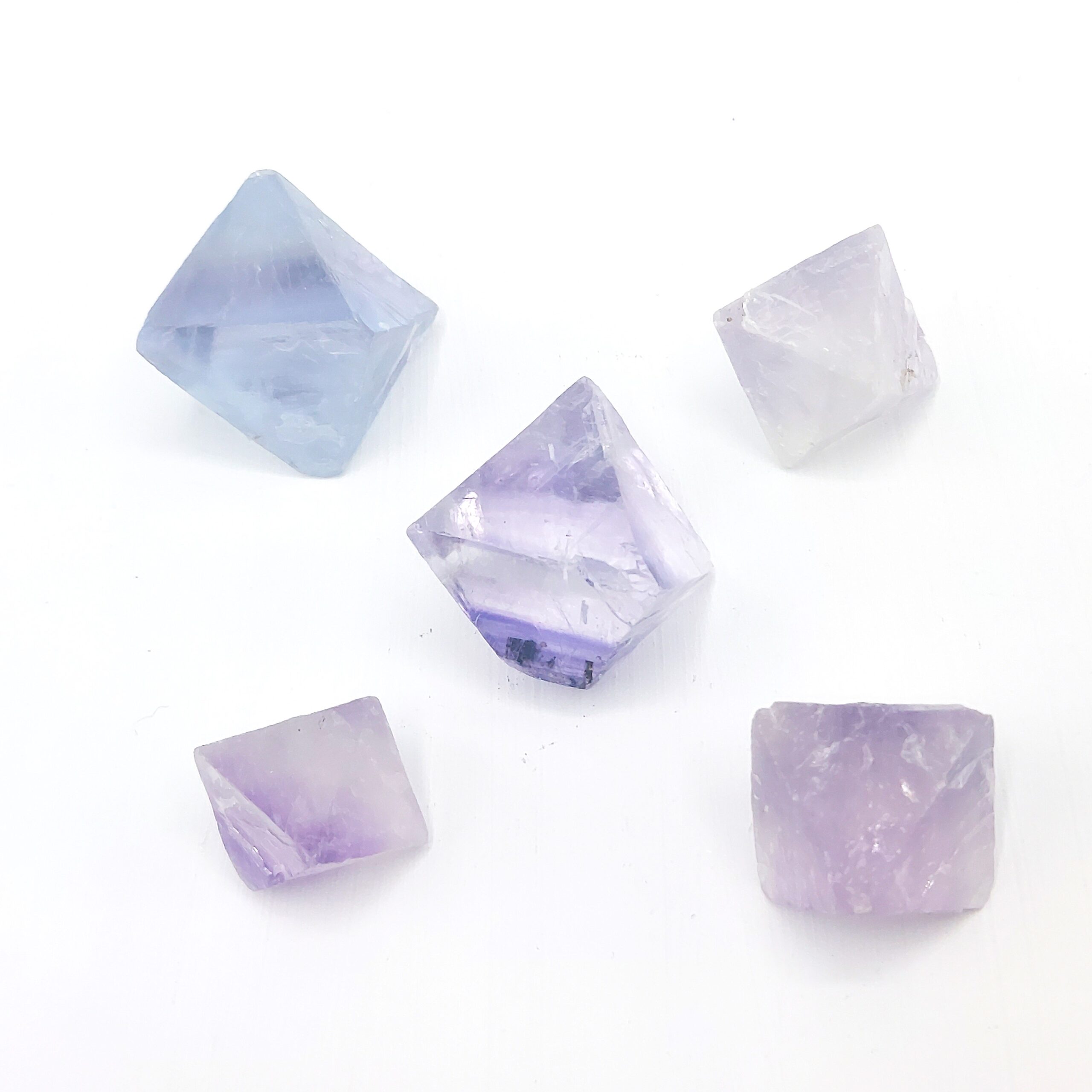 Cinq jolis cristaux de fluorite mauve à bleu, obtenus par clivage, d’une provenance inconnue.