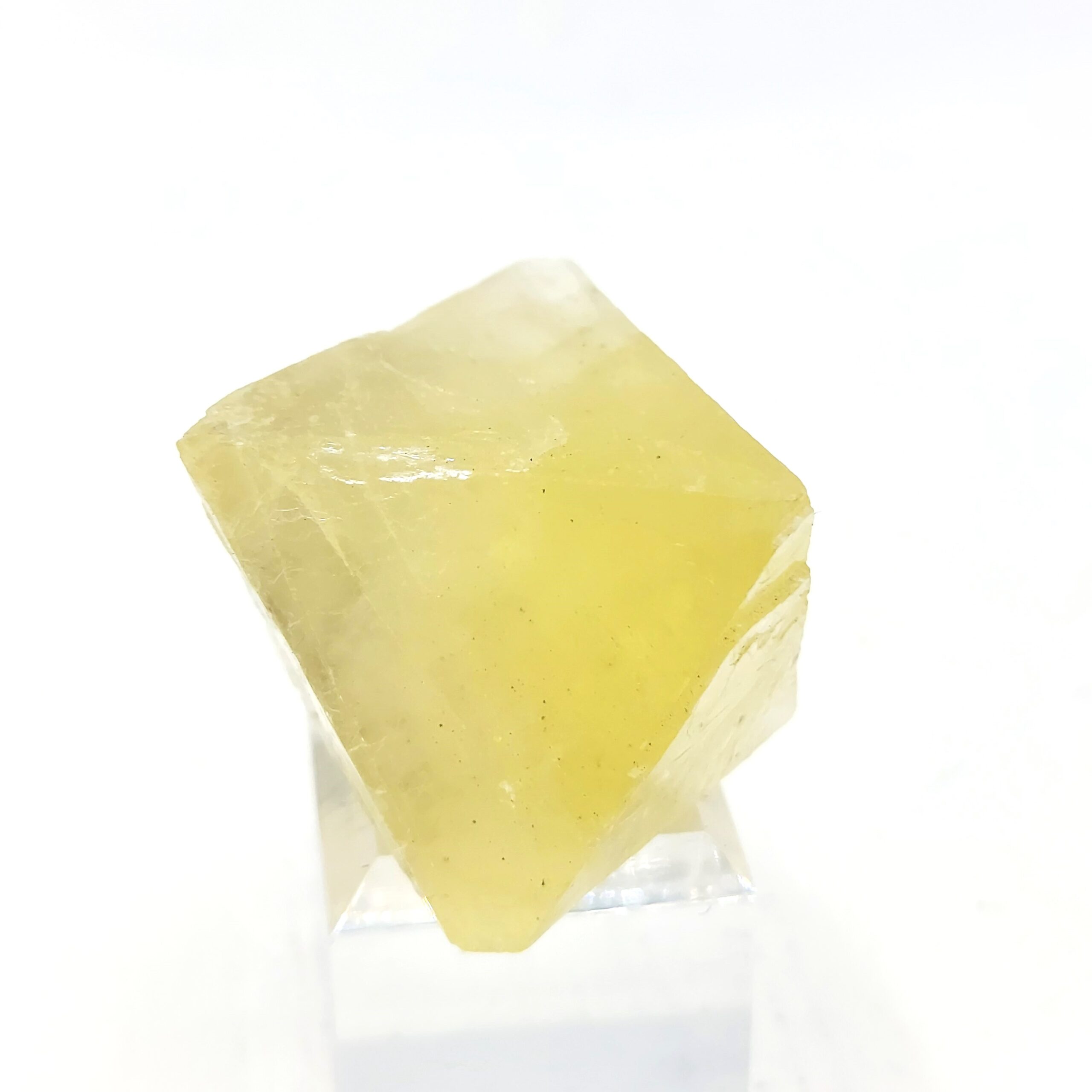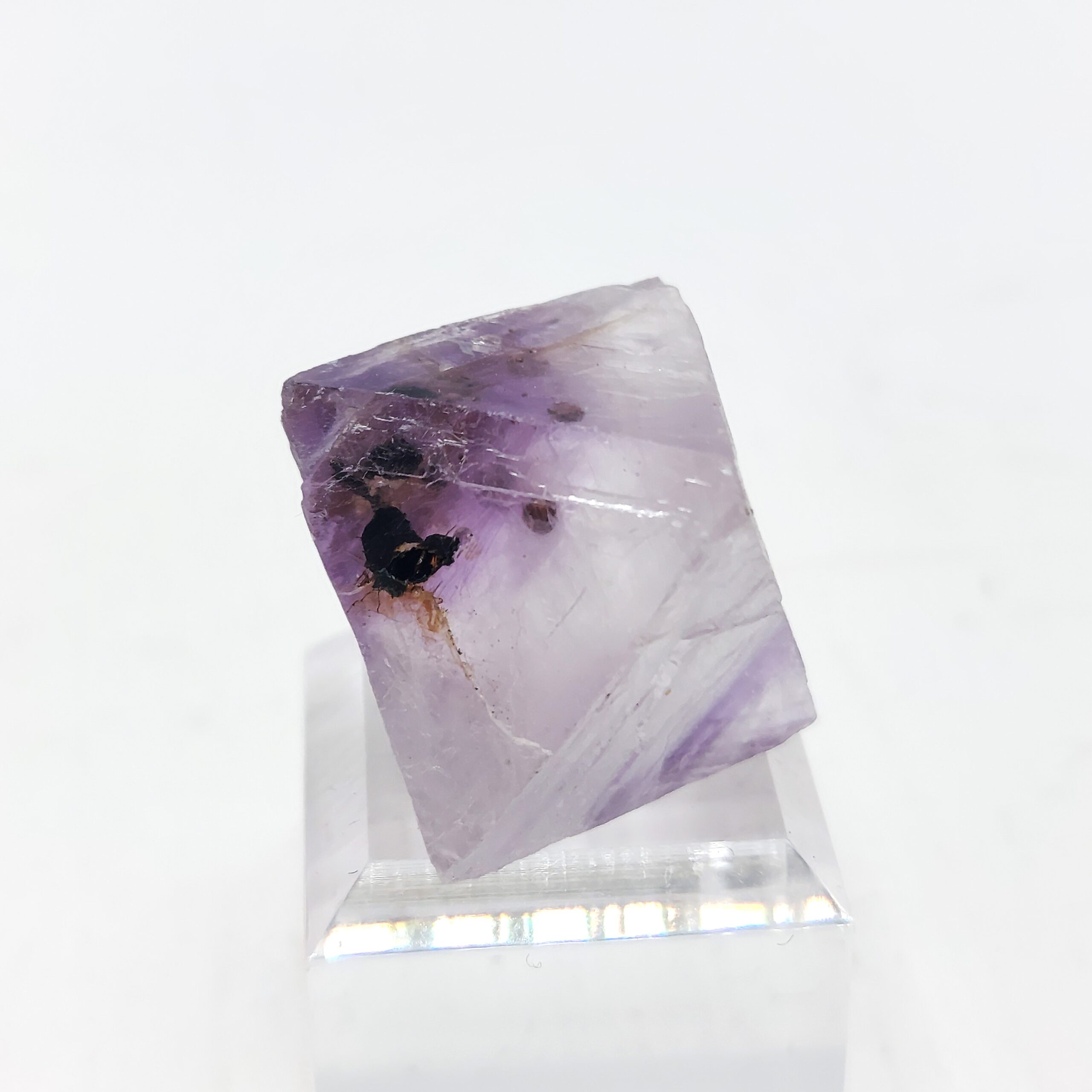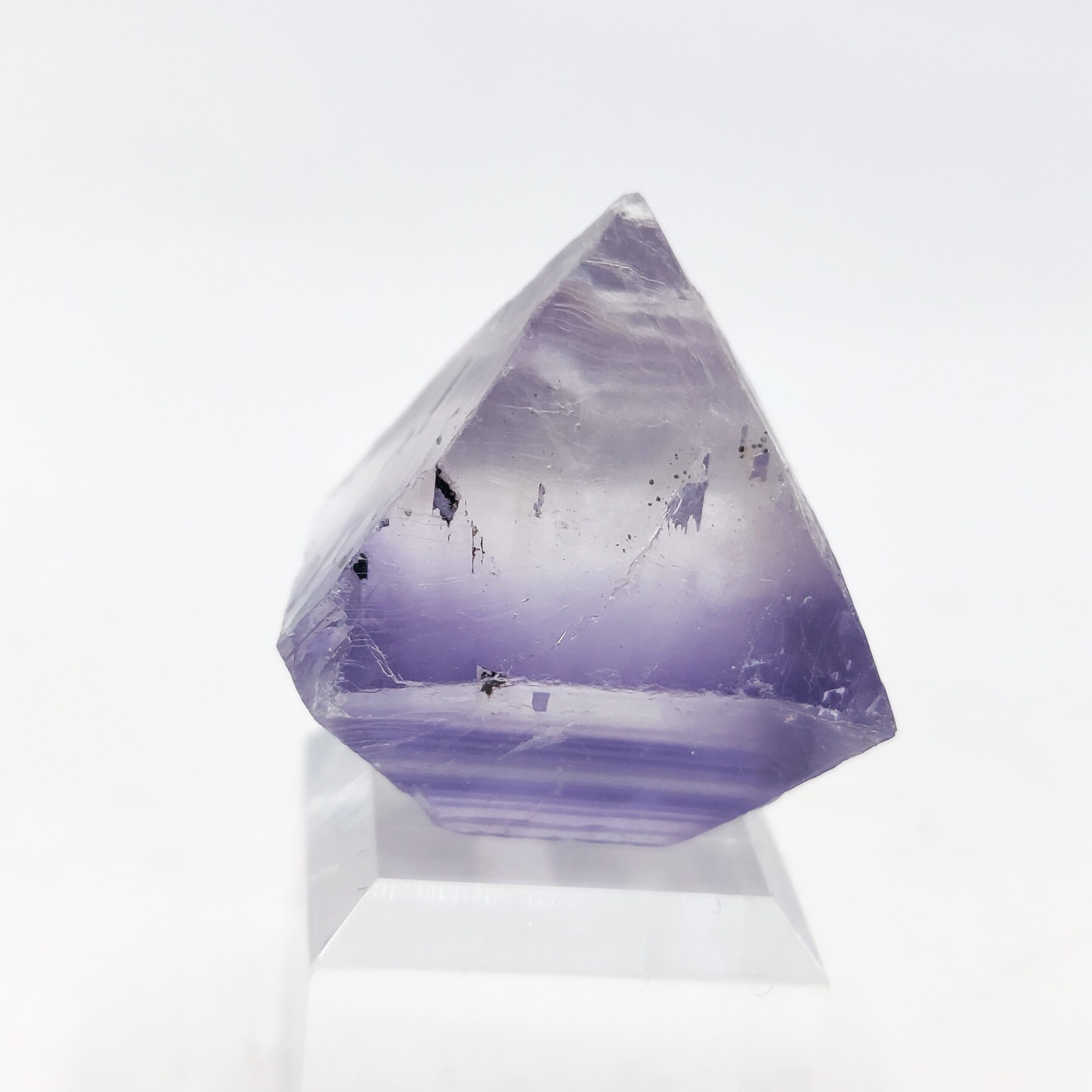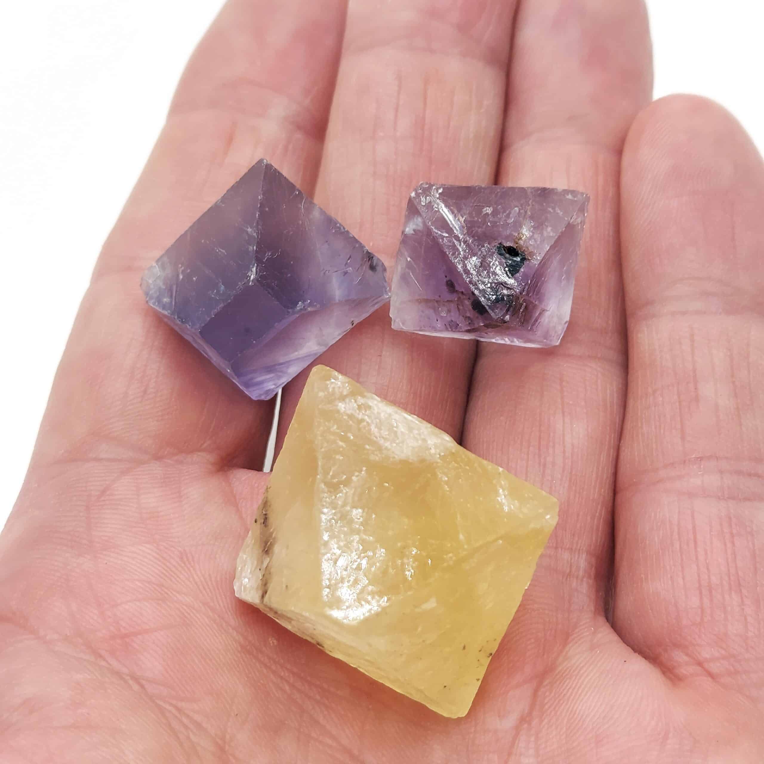 Trois jolis cristaux de fluorite mauve et jaune, obtenus par clivage, d’une provenance inconnue.