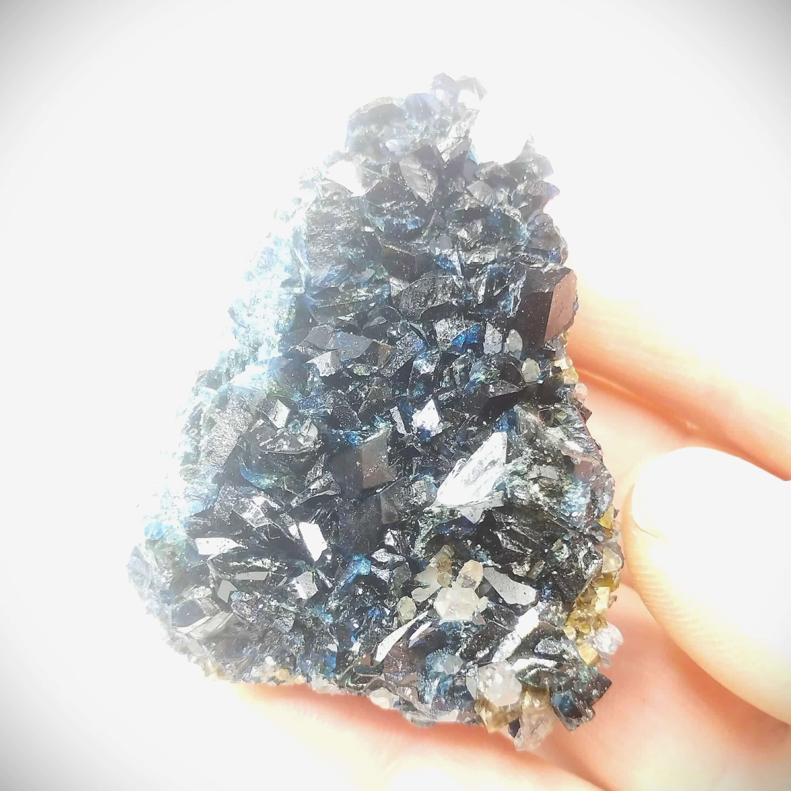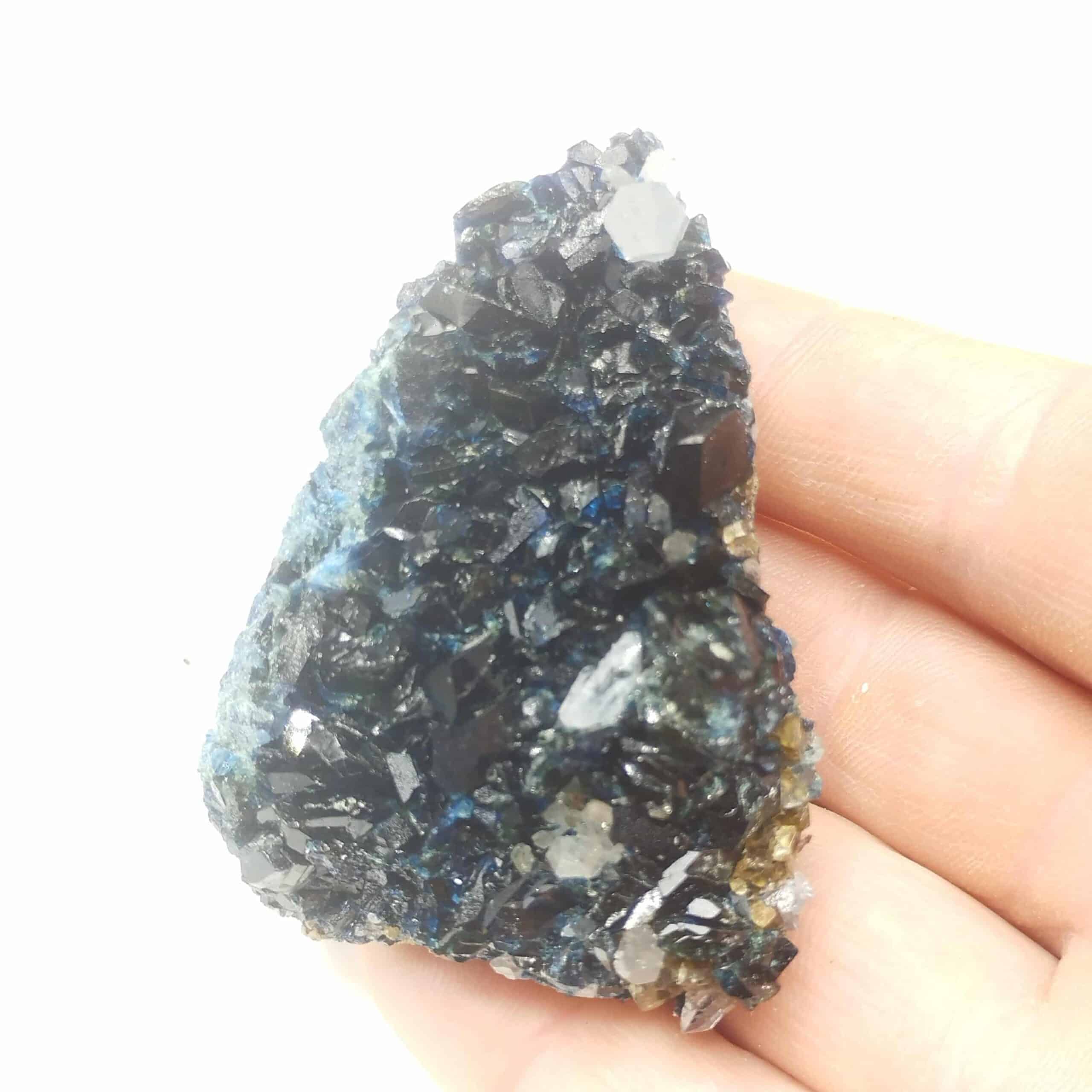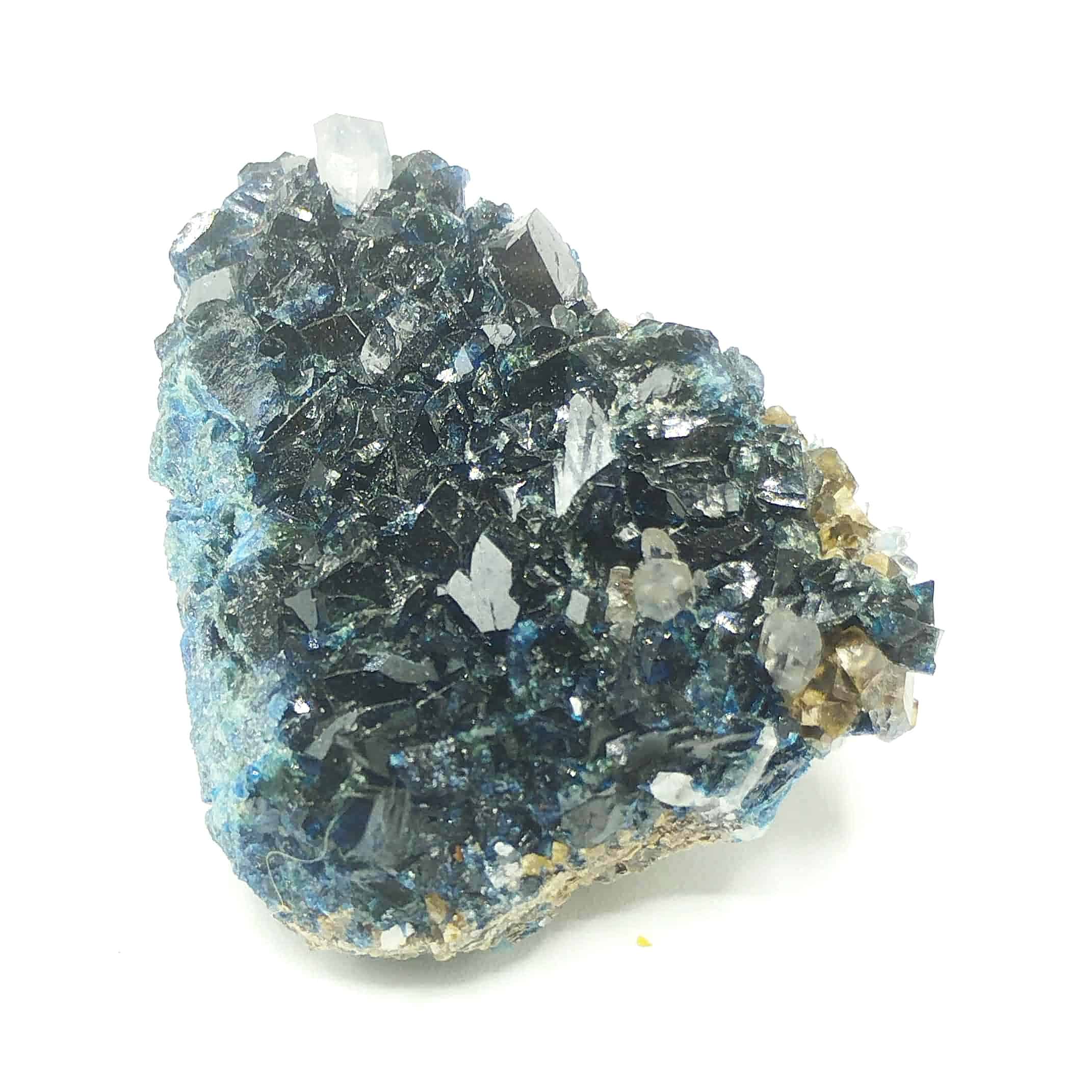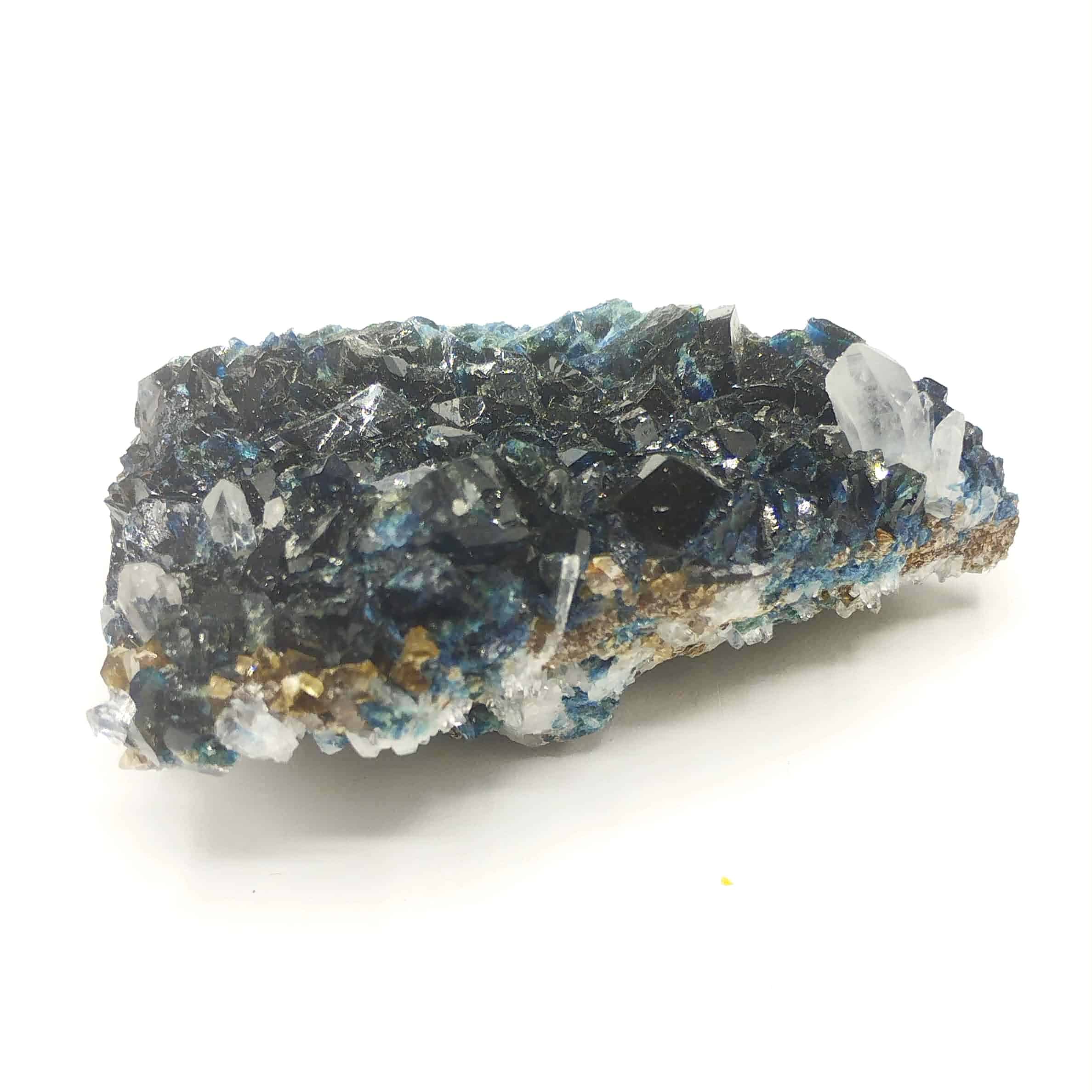 Superbe spécimen de cristaux de lazulite bleus, wardite jaune et quartz en prismes hyalins. Les cristaux de lazulite sont de belle taille et assez intacts.
