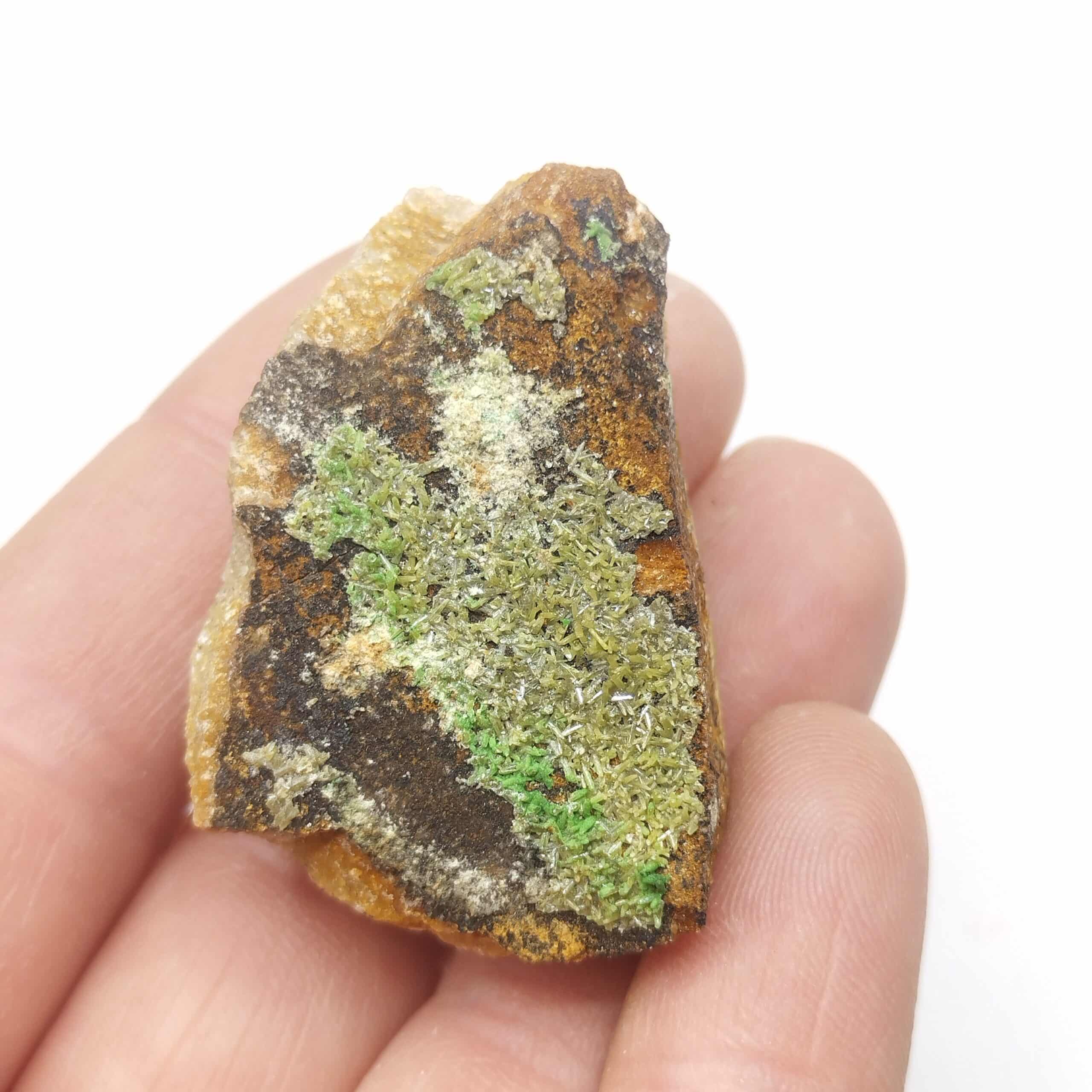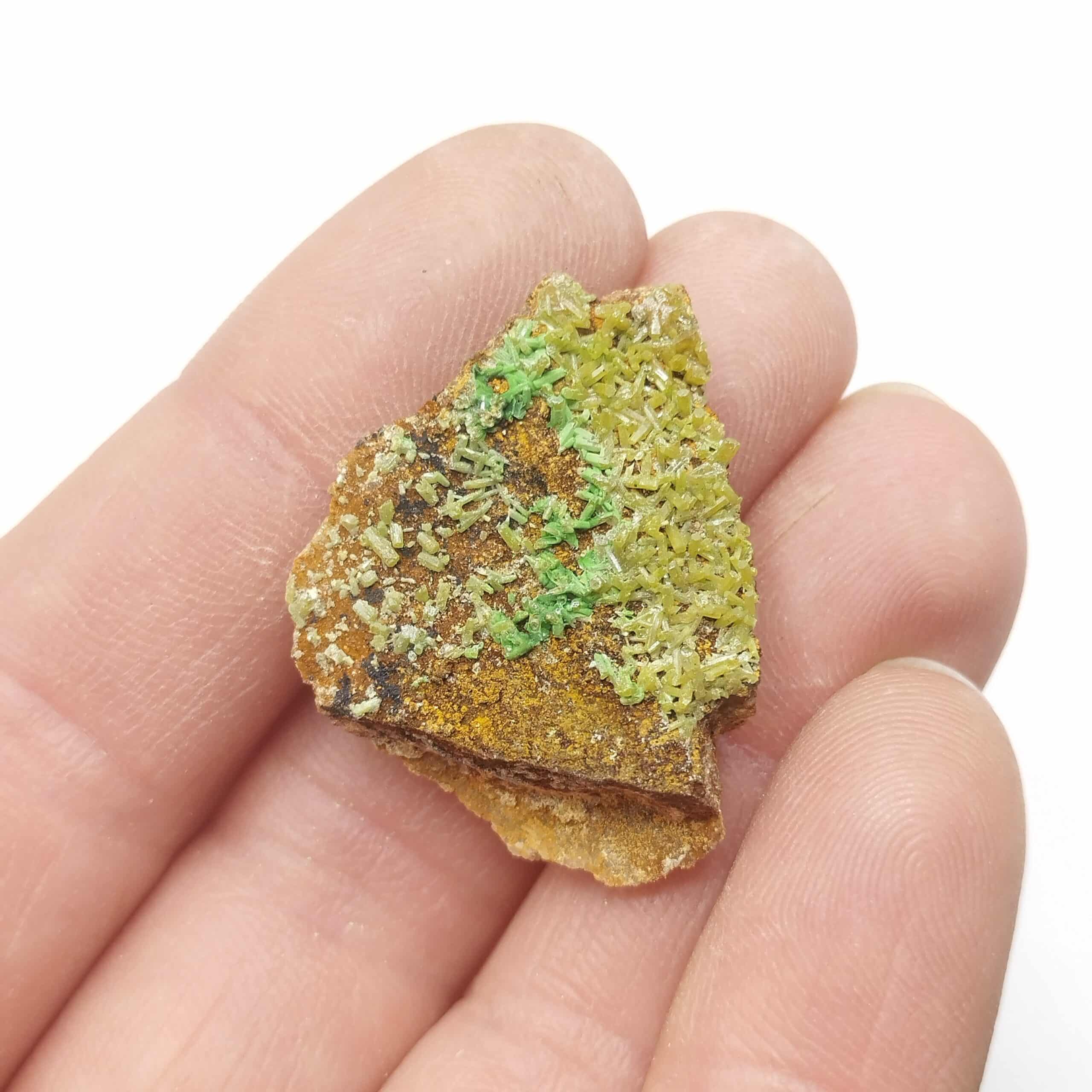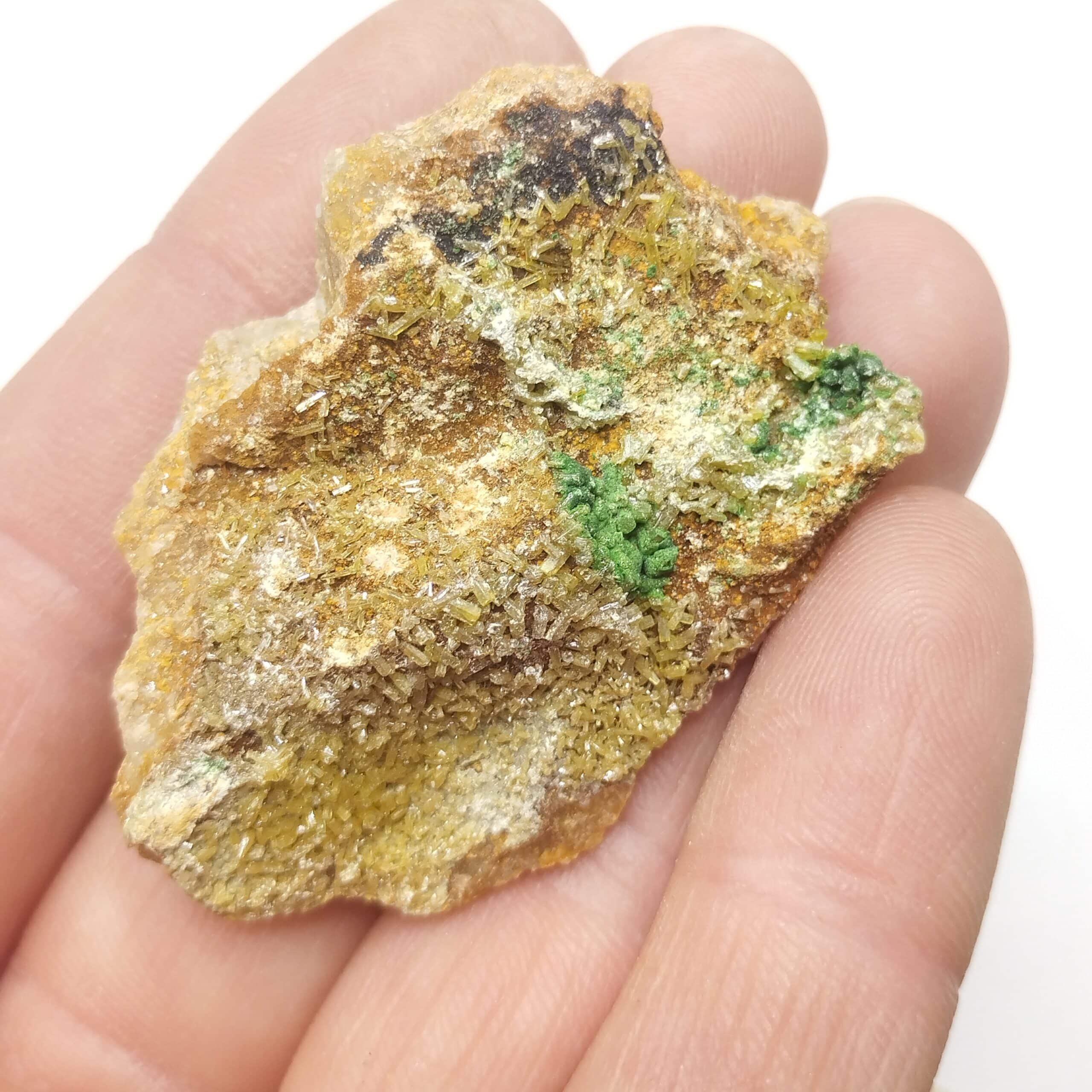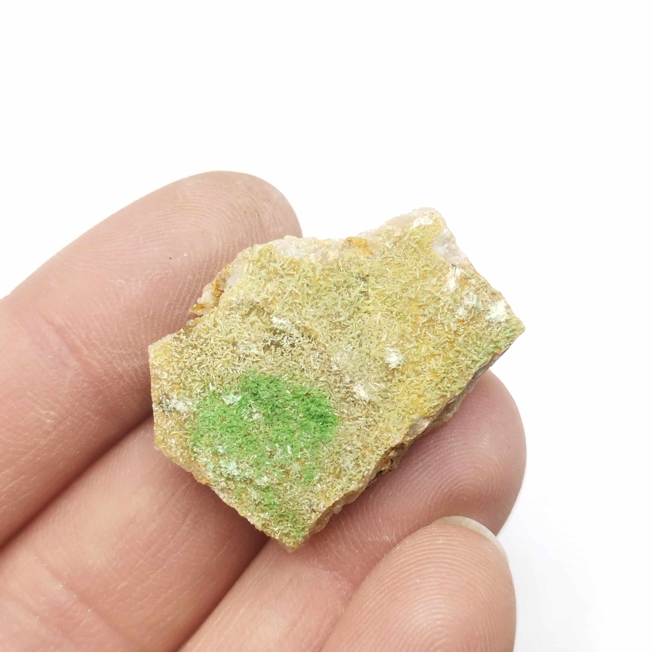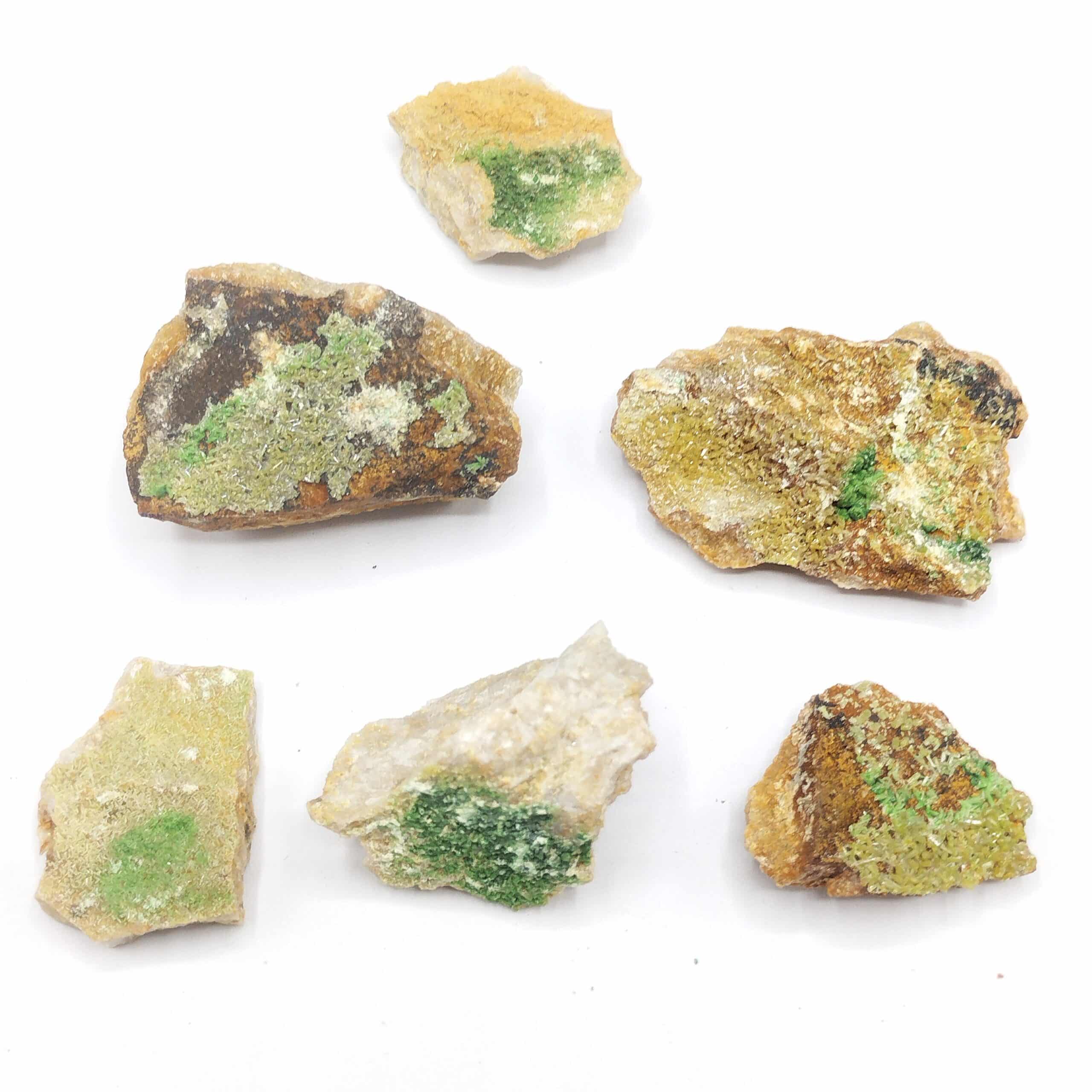 Lot de six spécimens présentant de fins cristaux de mimétite et bayldonite verte sur gangue siliceuse. Joli contraste, belle qualité.
