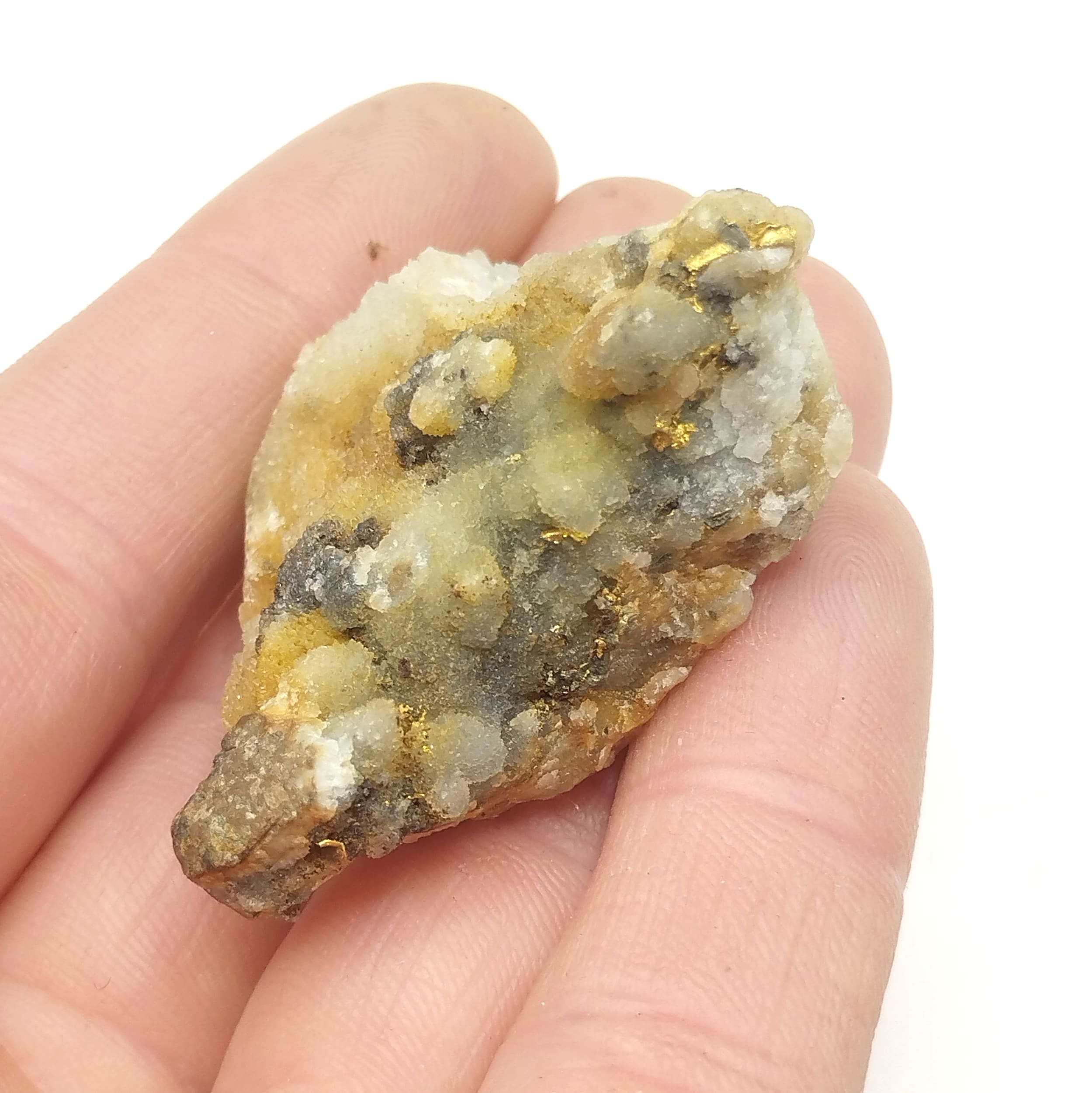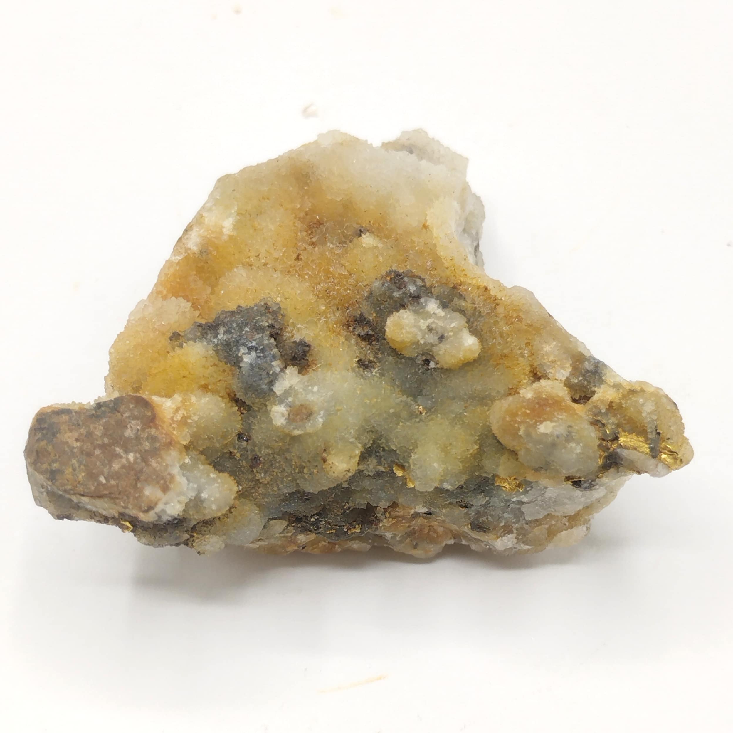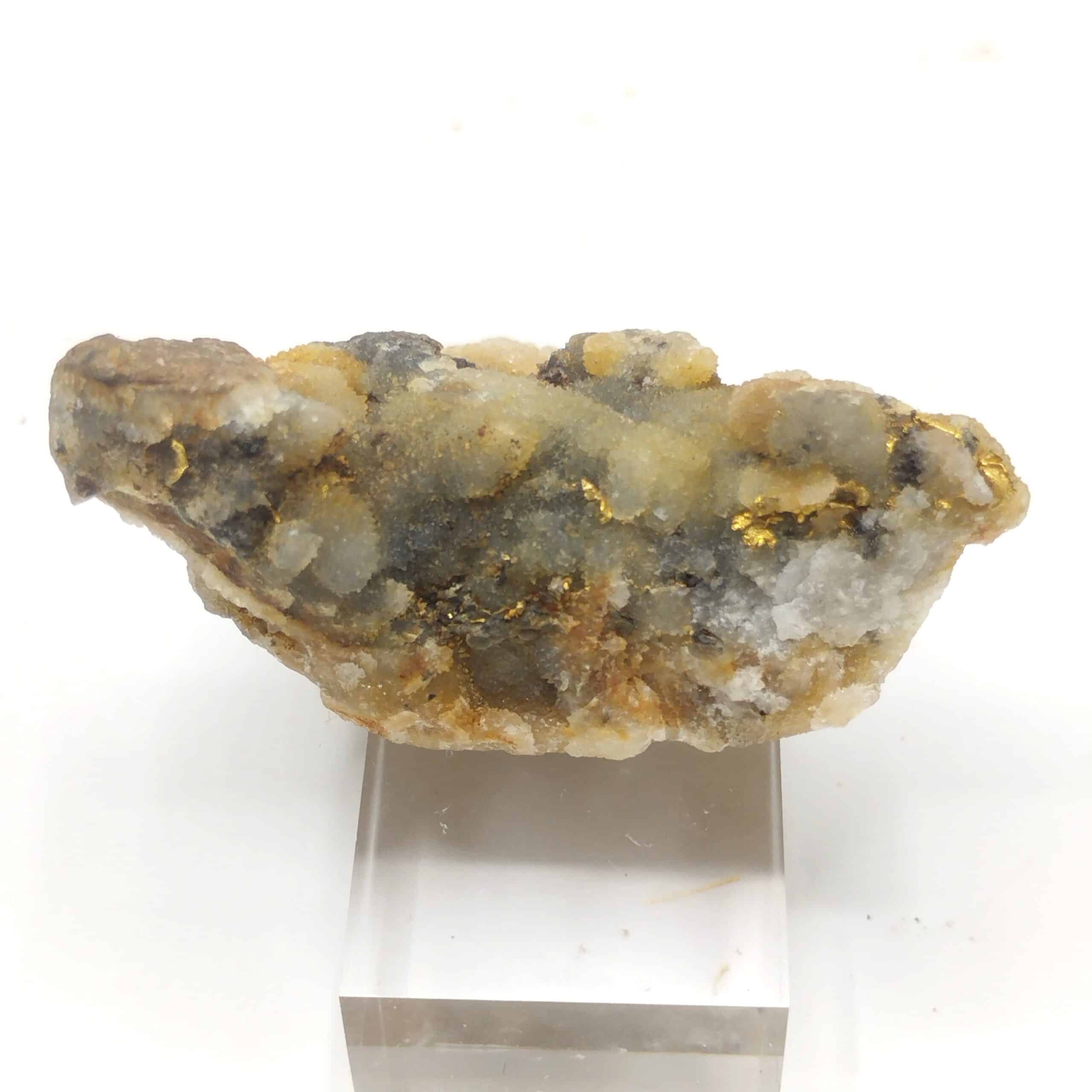 Cristaux d’or natif sur quartz et calcédoine, espèces minérales en provenance de la mine d’or de Roșia Montană en Roumanie, gîte aurifère appelé en allemand Goldbach, en hongrois Verespatak et en latin Alburnus Maior. Cette localité minière est située en transylvanie.