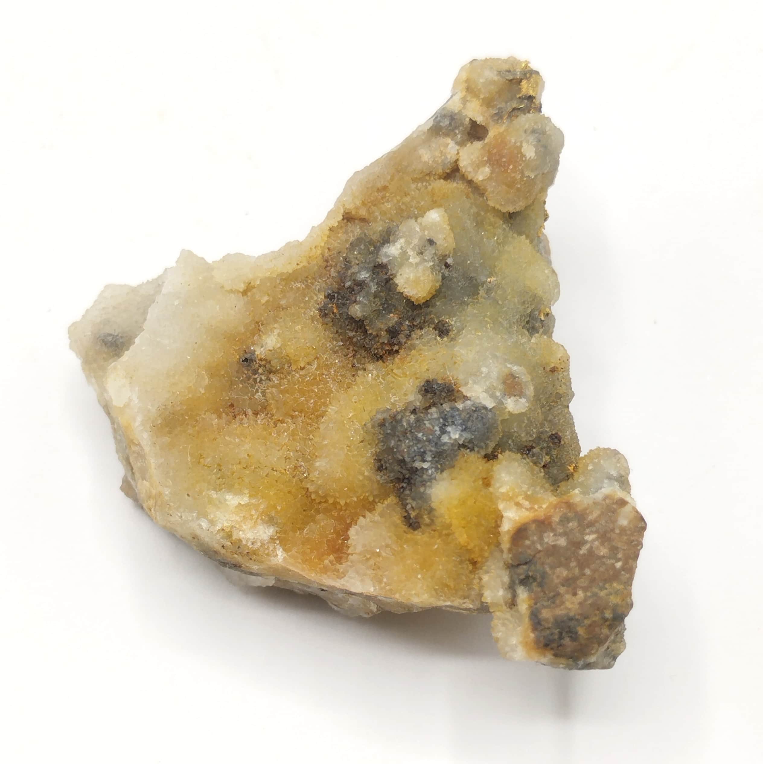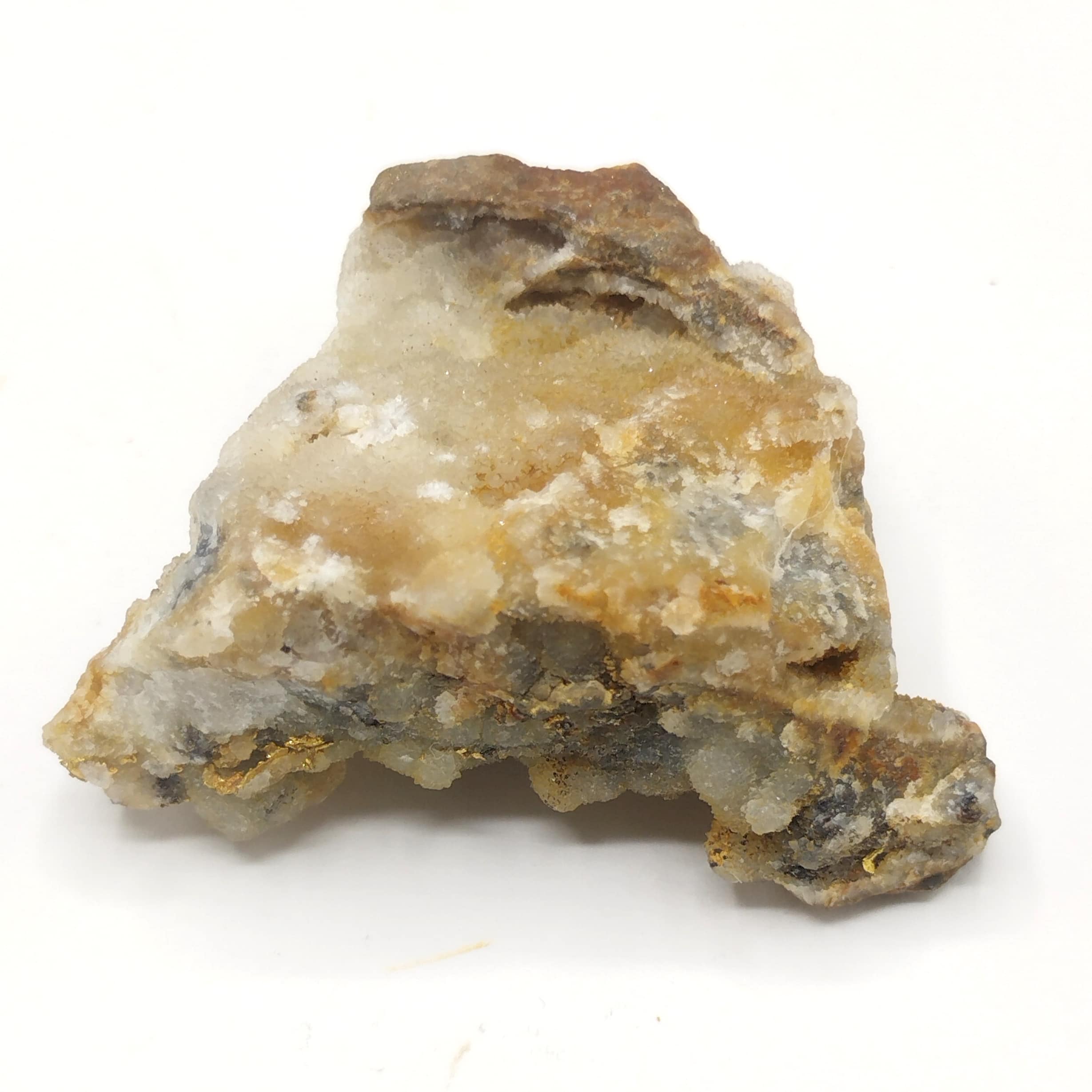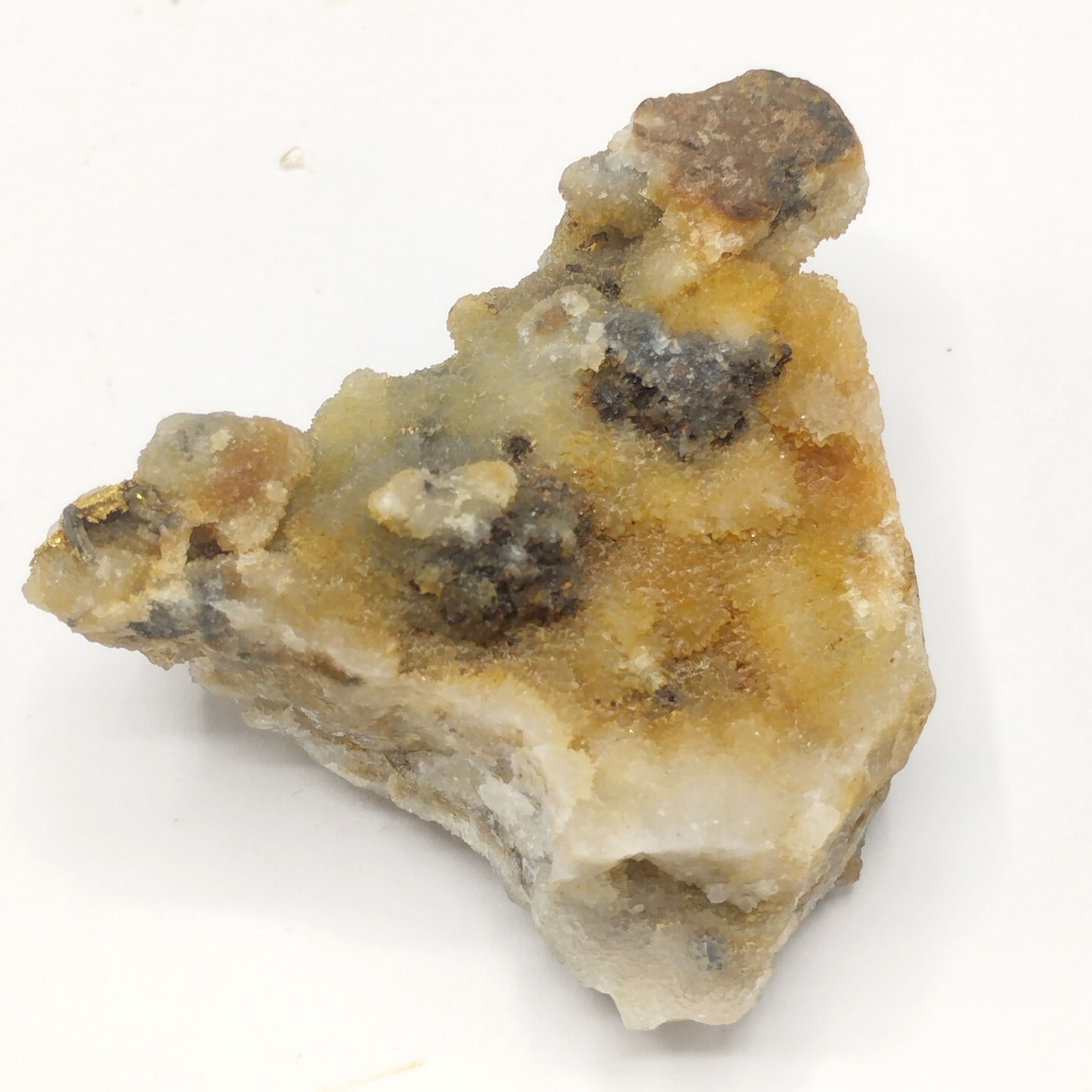 Cristaux d’or natif sur quartz et calcédoine, espèces minérales en provenance de la mine d’or de Roșia Montană en Roumanie, gîte aurifère appelé en allemand Goldbach, en hongrois Verespatak et en latin Alburnus Maior. Cette localité minière est située en transylvanie.