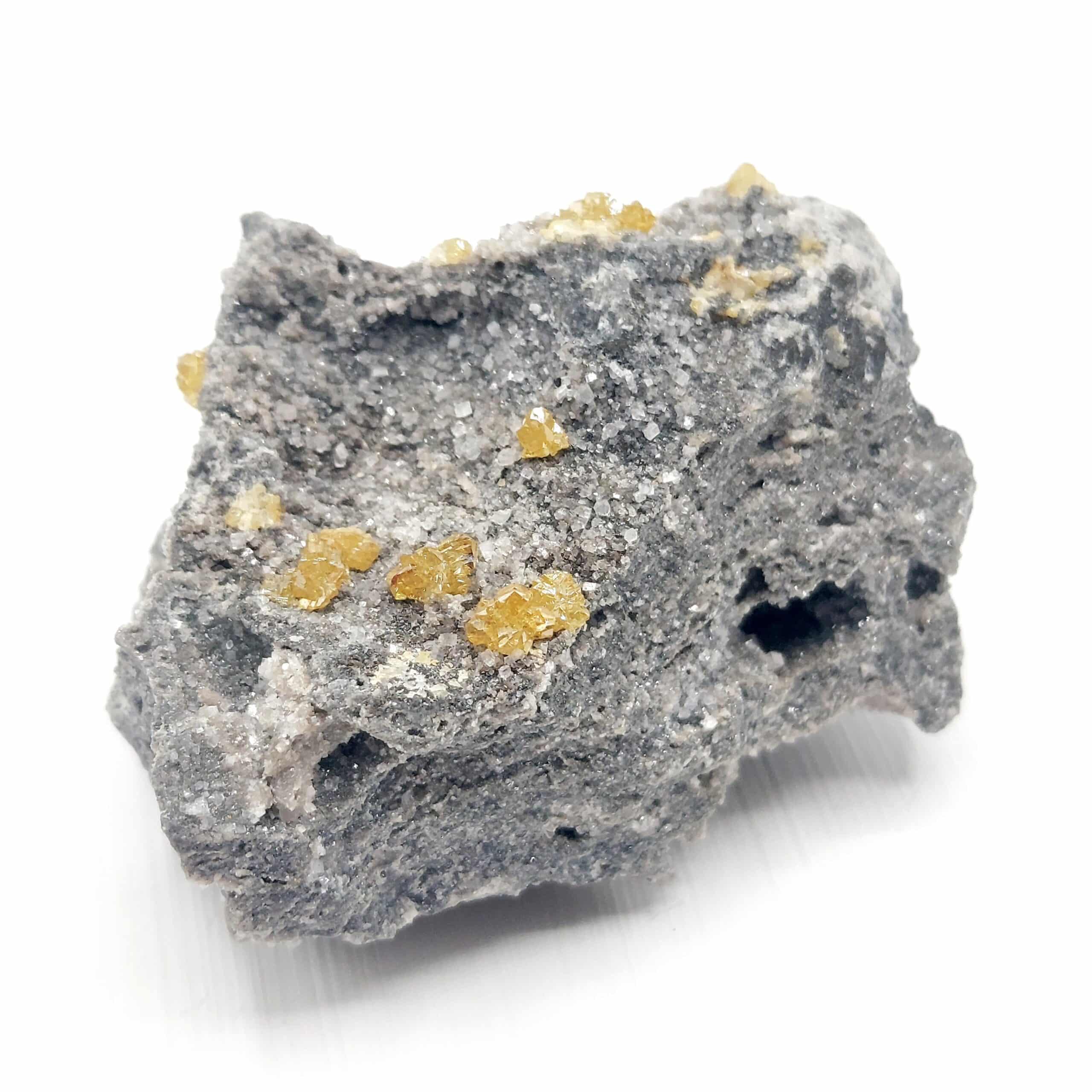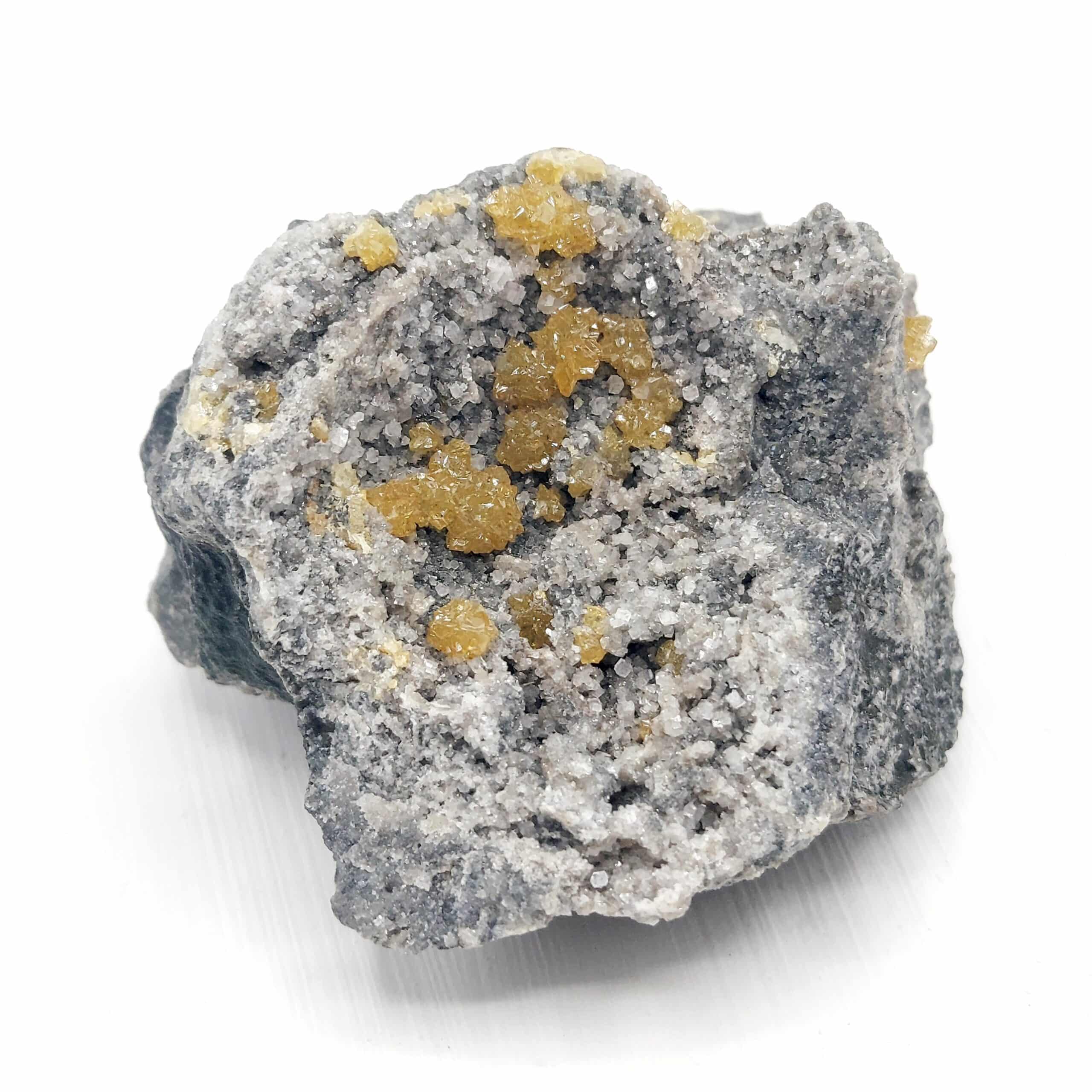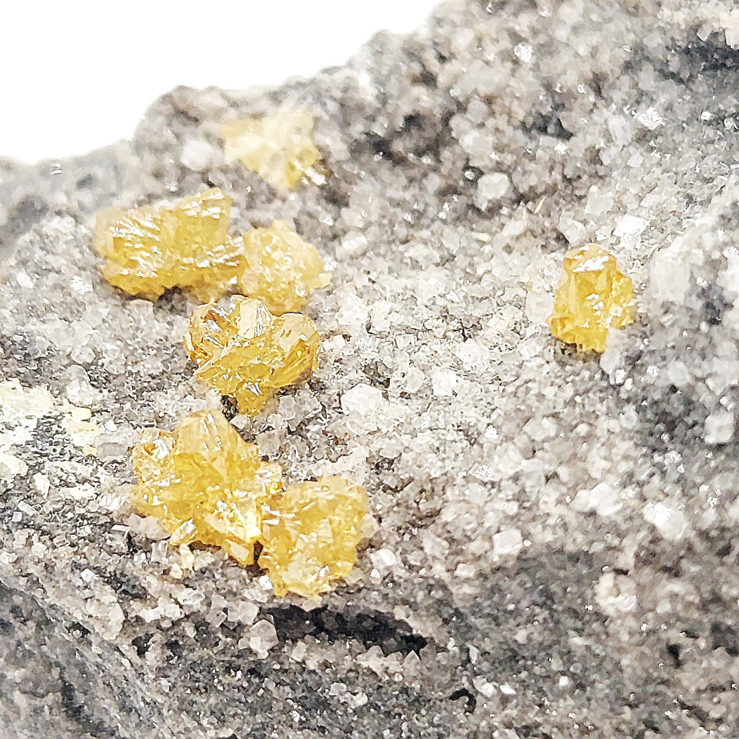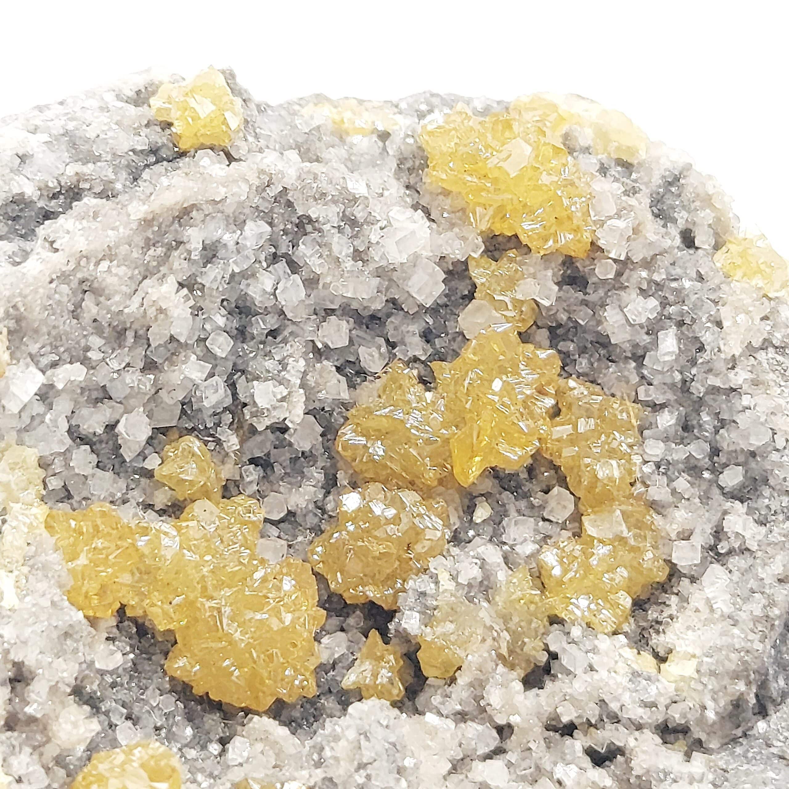 Cristaux de sphalérite jaune orangée transparents, gemme, en agrégats arrondis sur une matrice dolomitique contenant des cristaux scintillants. Spécimen de sphalérite de la Carrière Holcim, Lockport, comté de Niagara, New York, États-Unis.