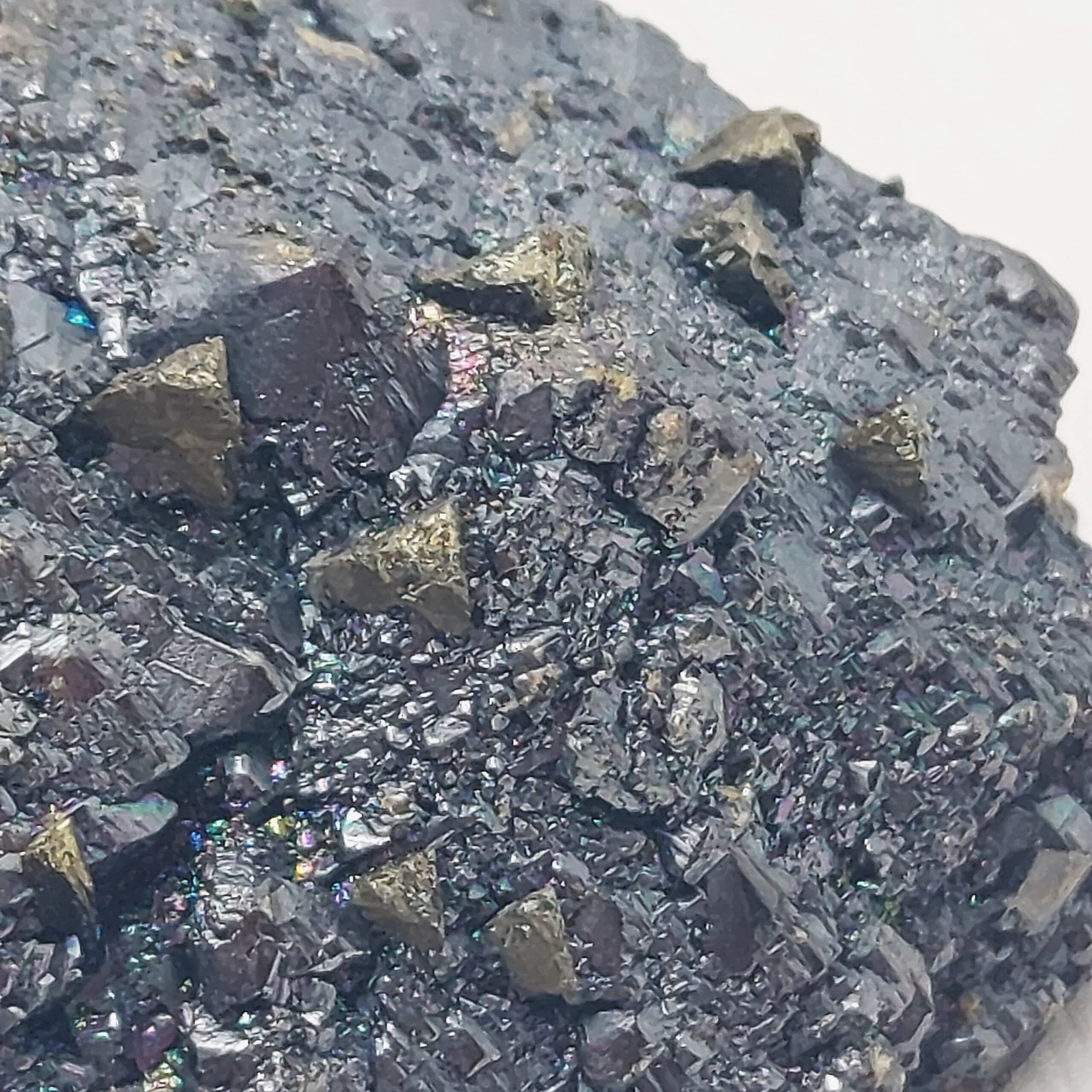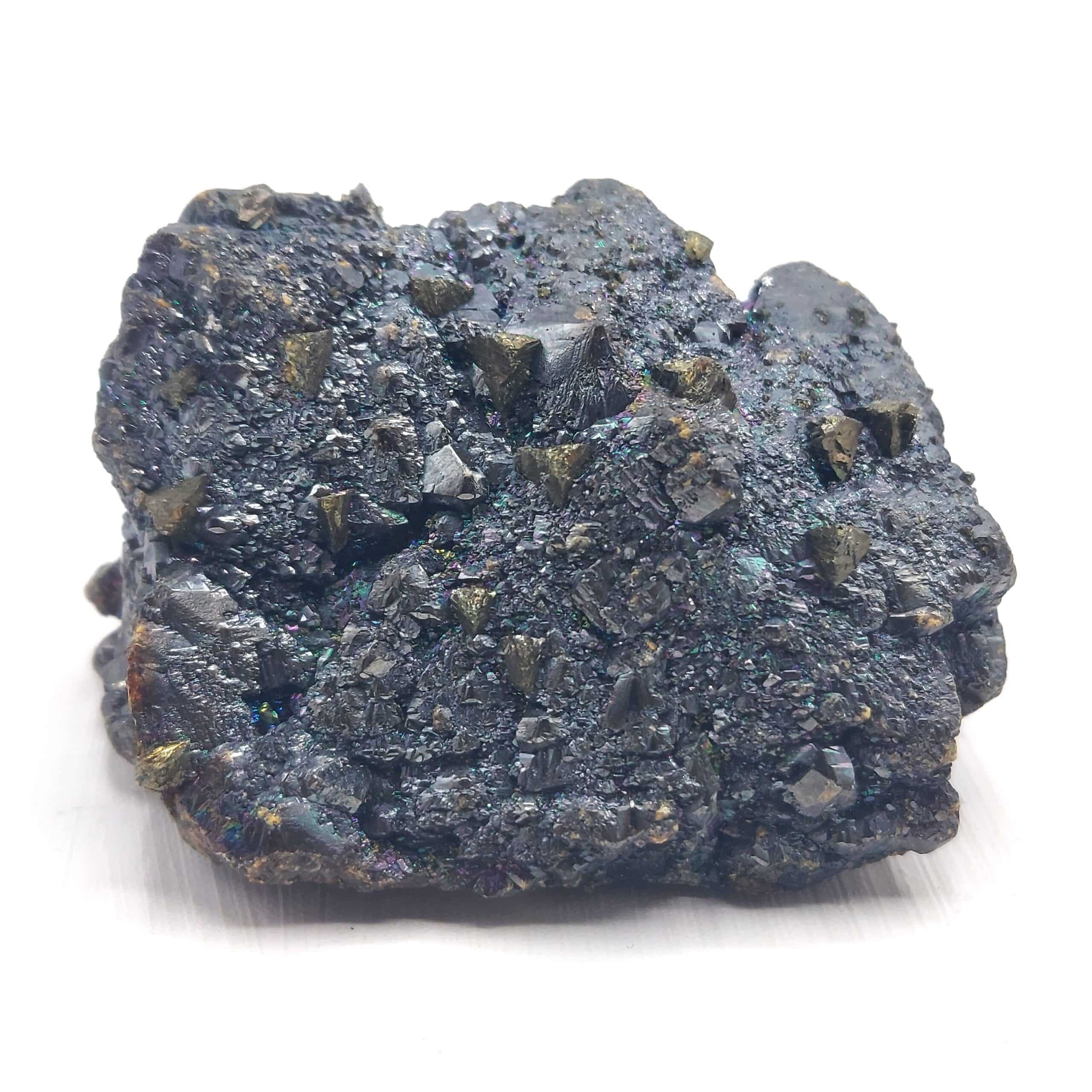 Cristaux de sphalérite brun vitreux avec irisations, parsemés de petits cristaux pyramidaux de chalcopyrite dorée de la mine Eagle Picher, Oklahoma, États-Unis.