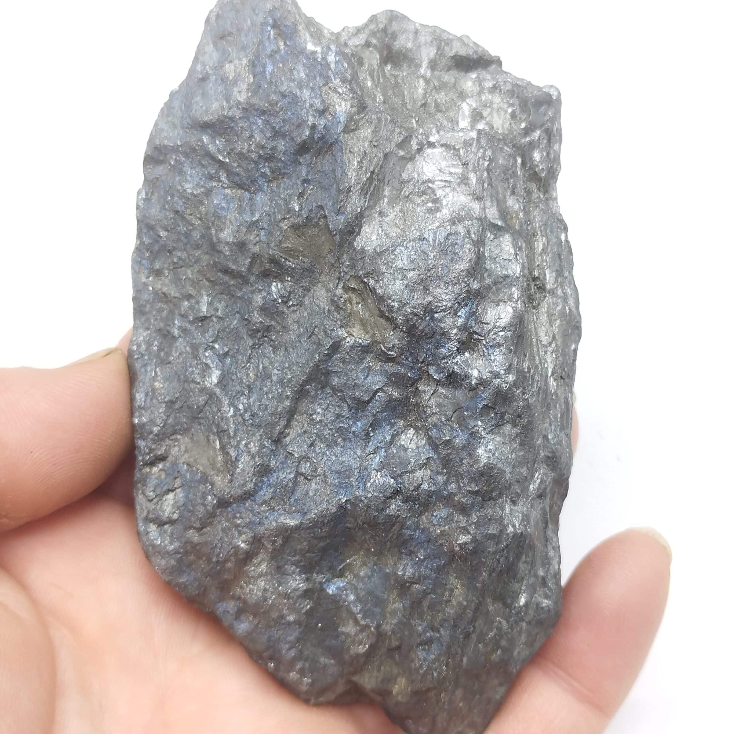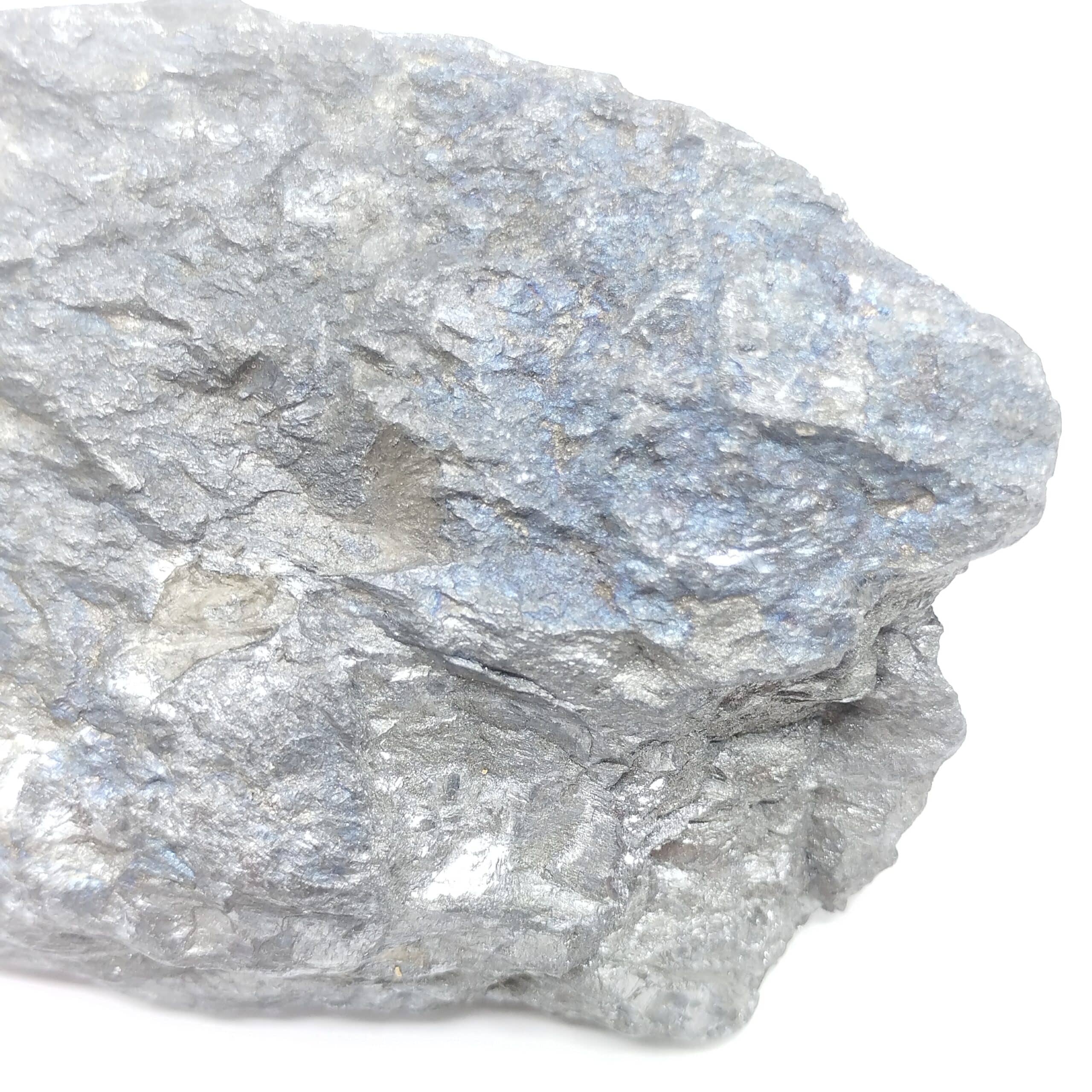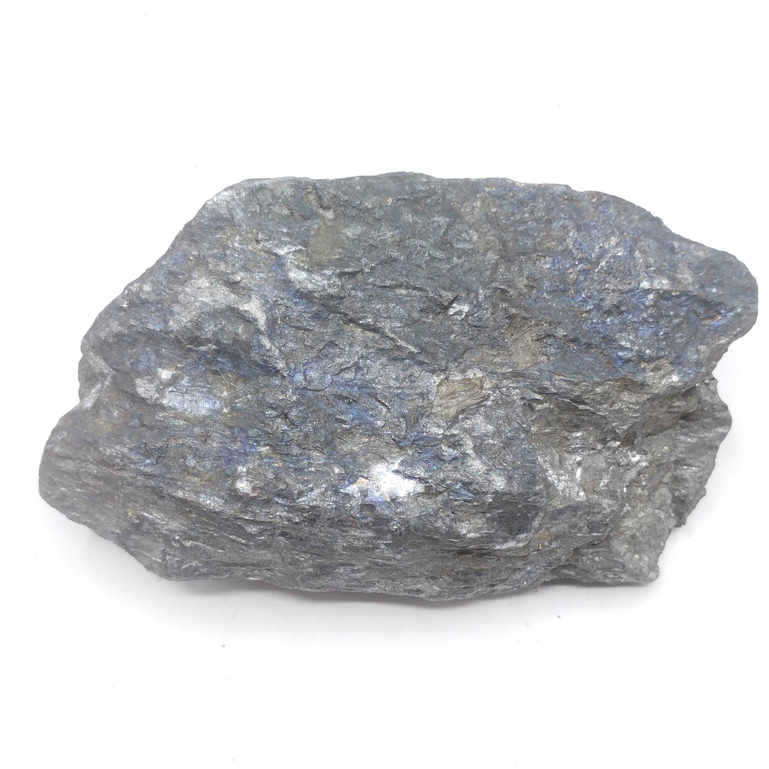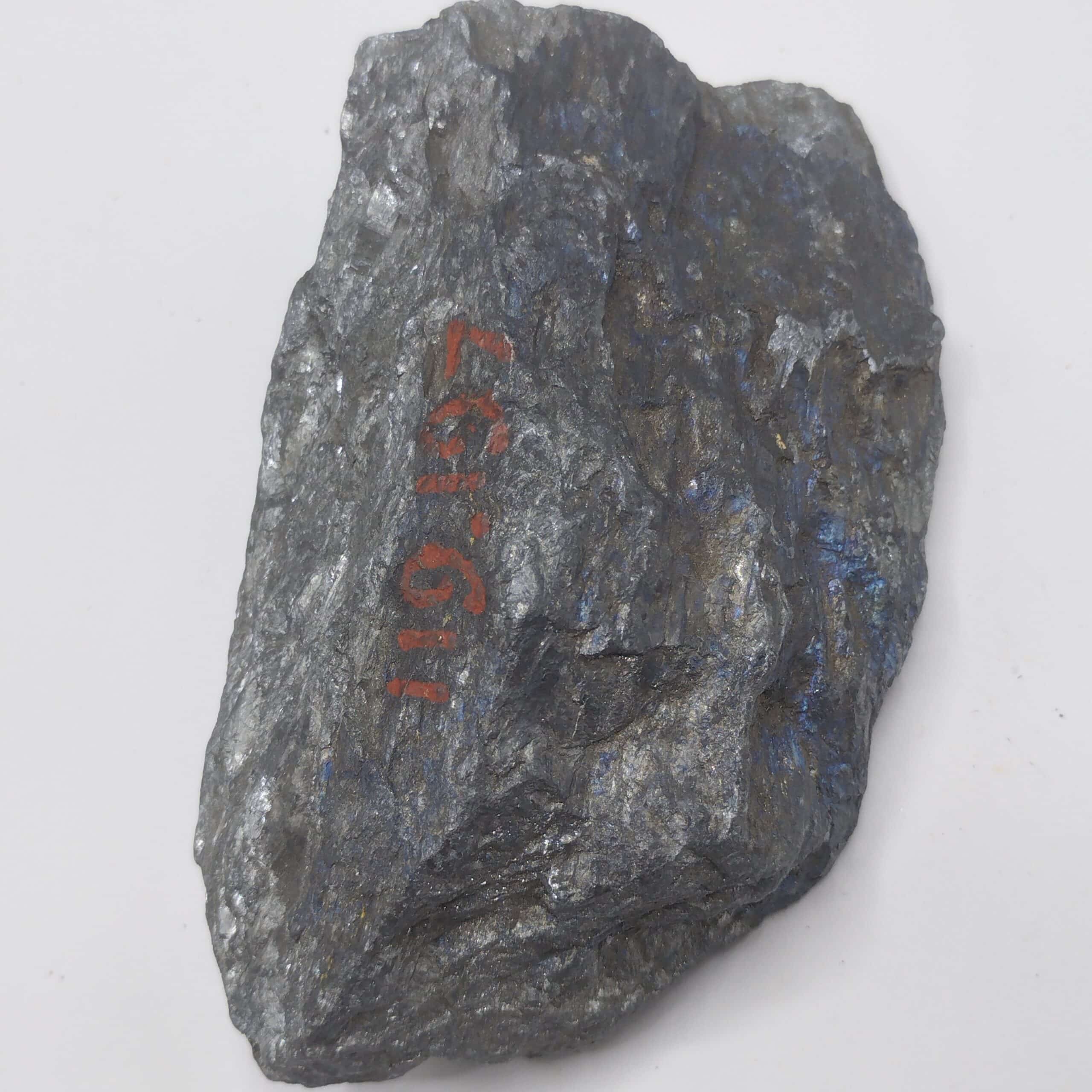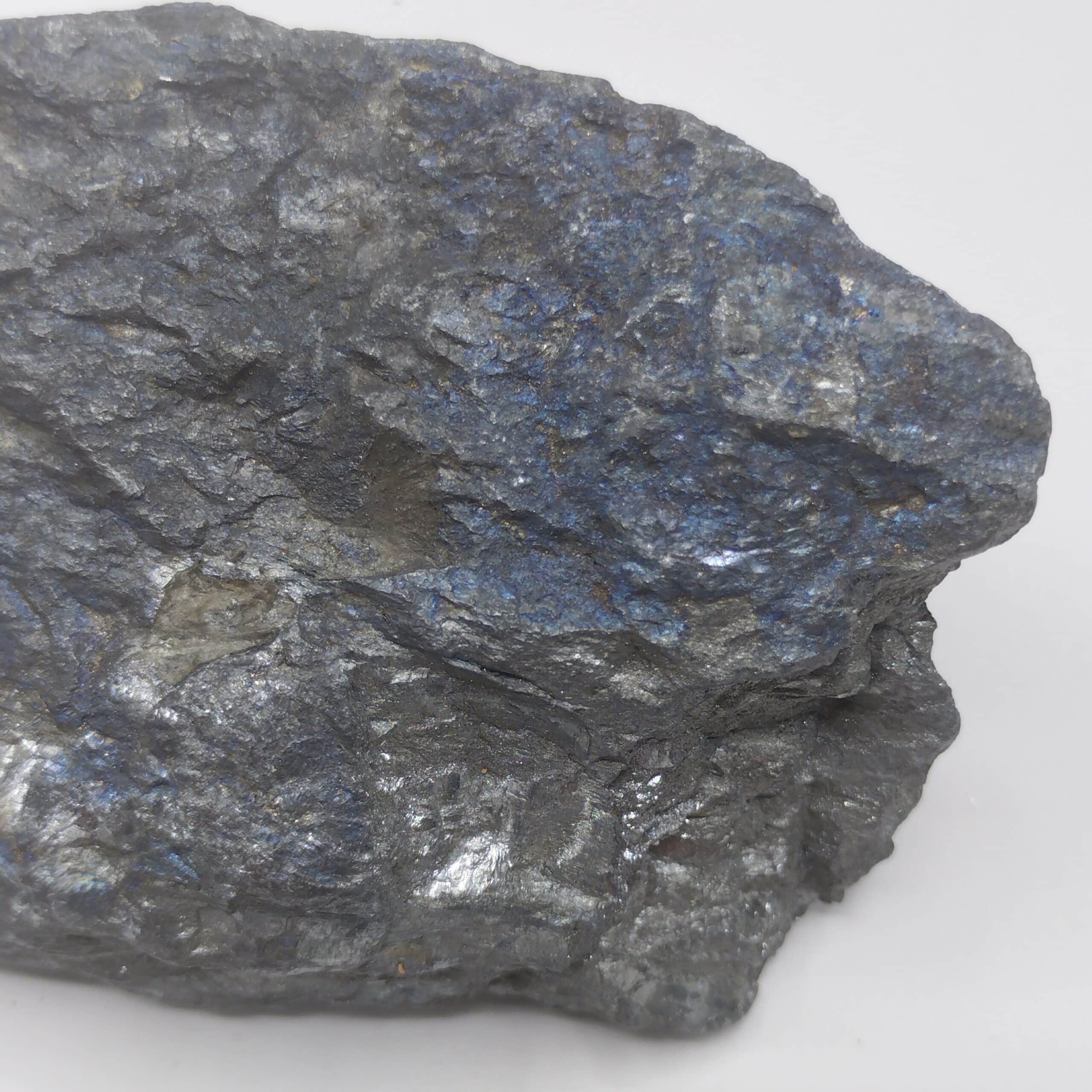 Grand spécimen de stibine partiellement cristallisé et présentant de belles irisations bleutées.