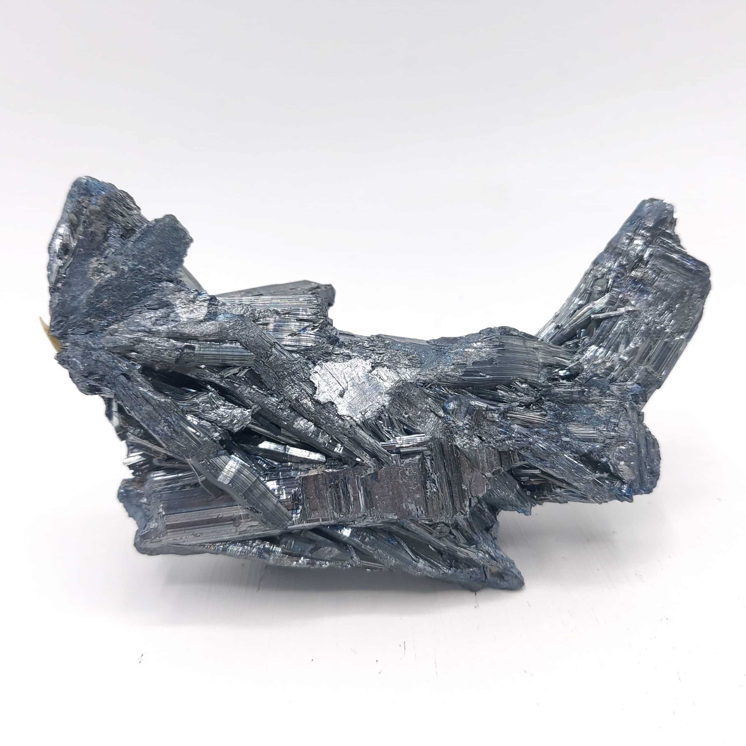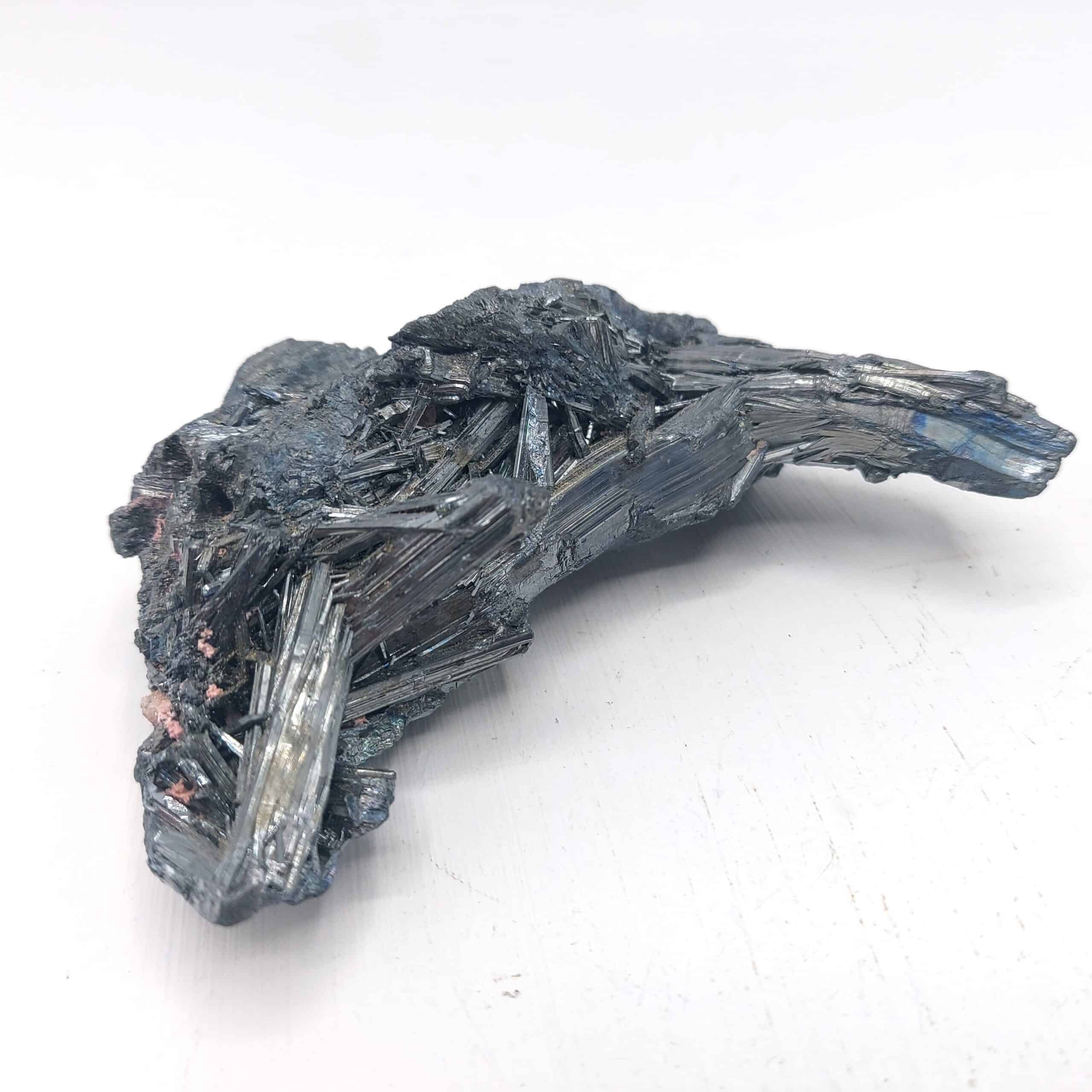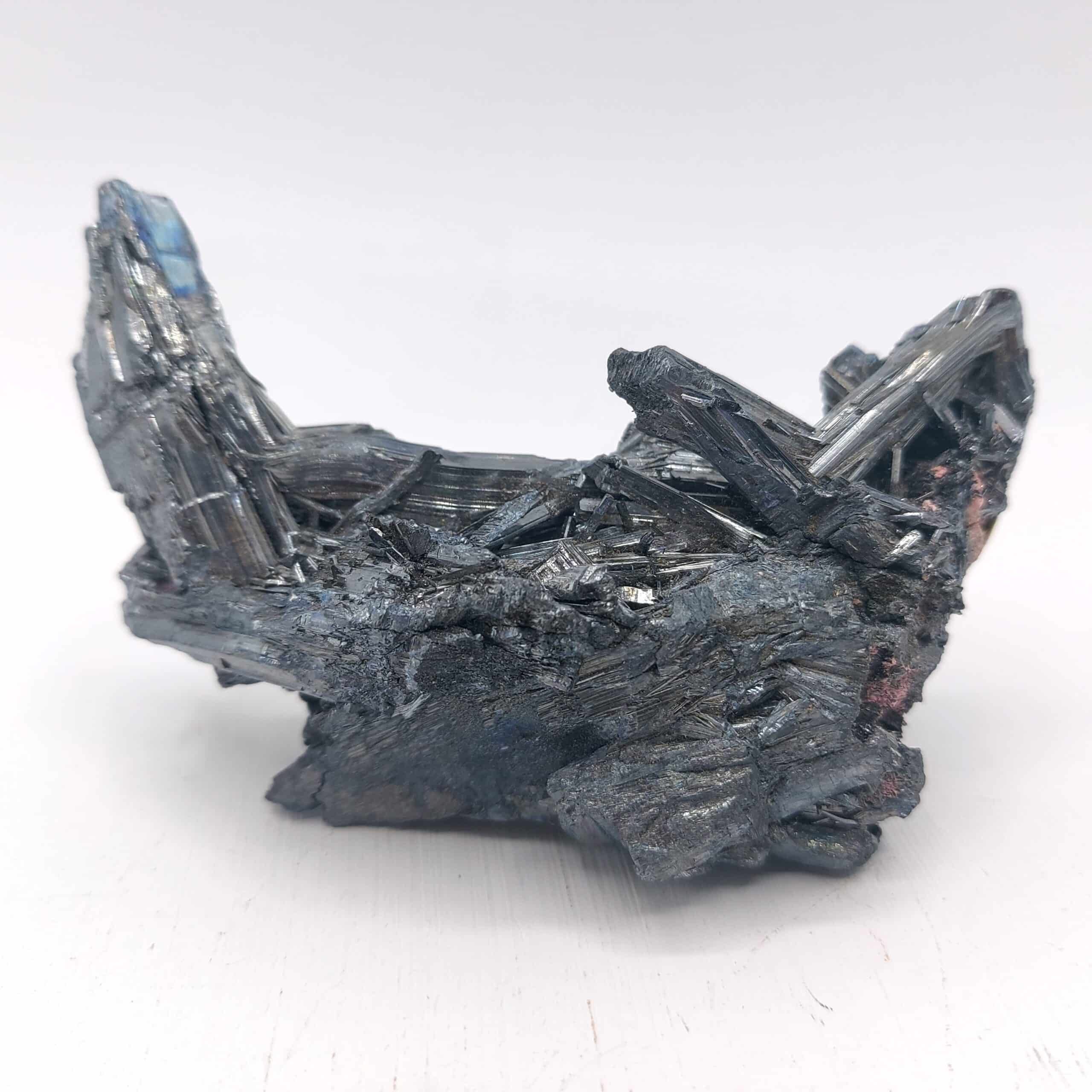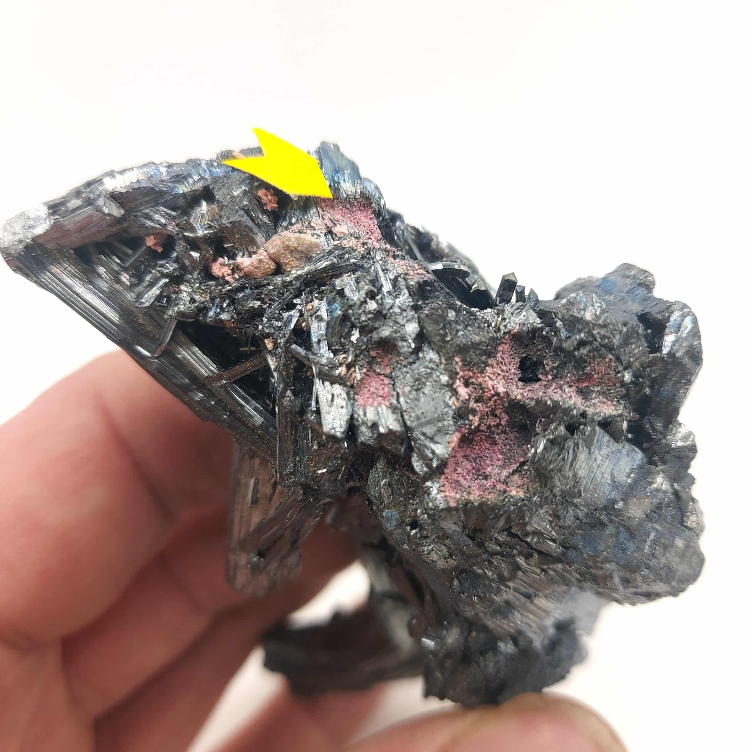 Spécimen de cristaux de stibine grise à noire, brillante, accompagnée de métastibine rouge en provenance de Chine.