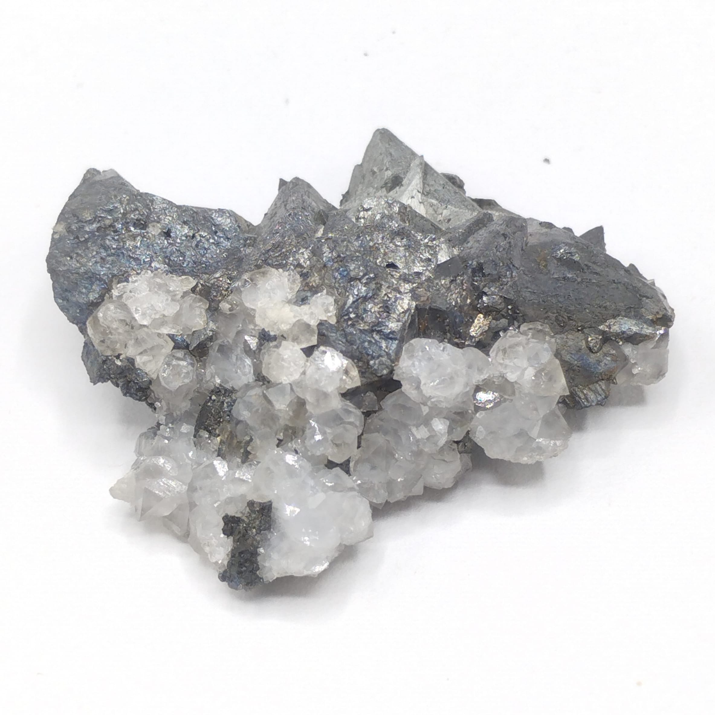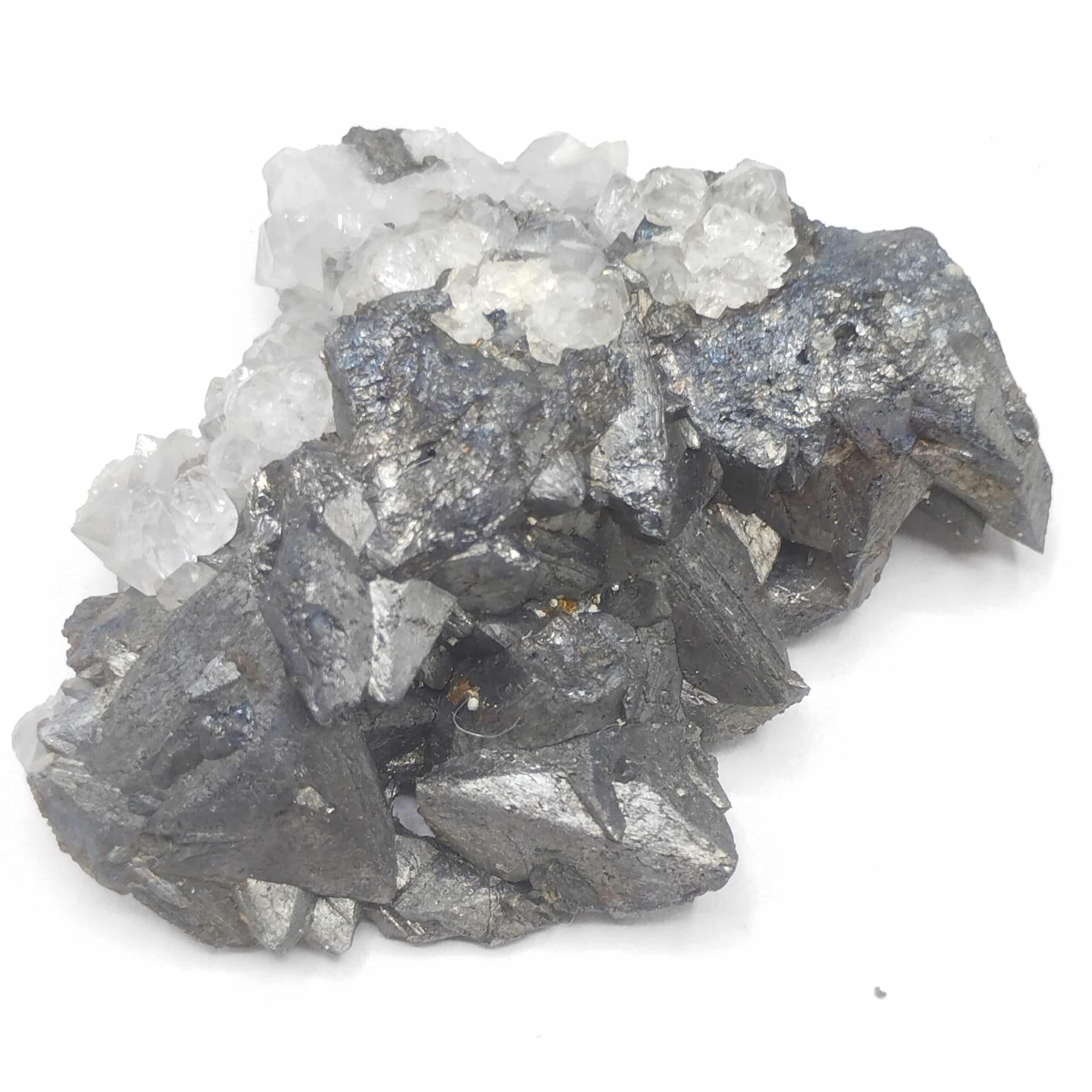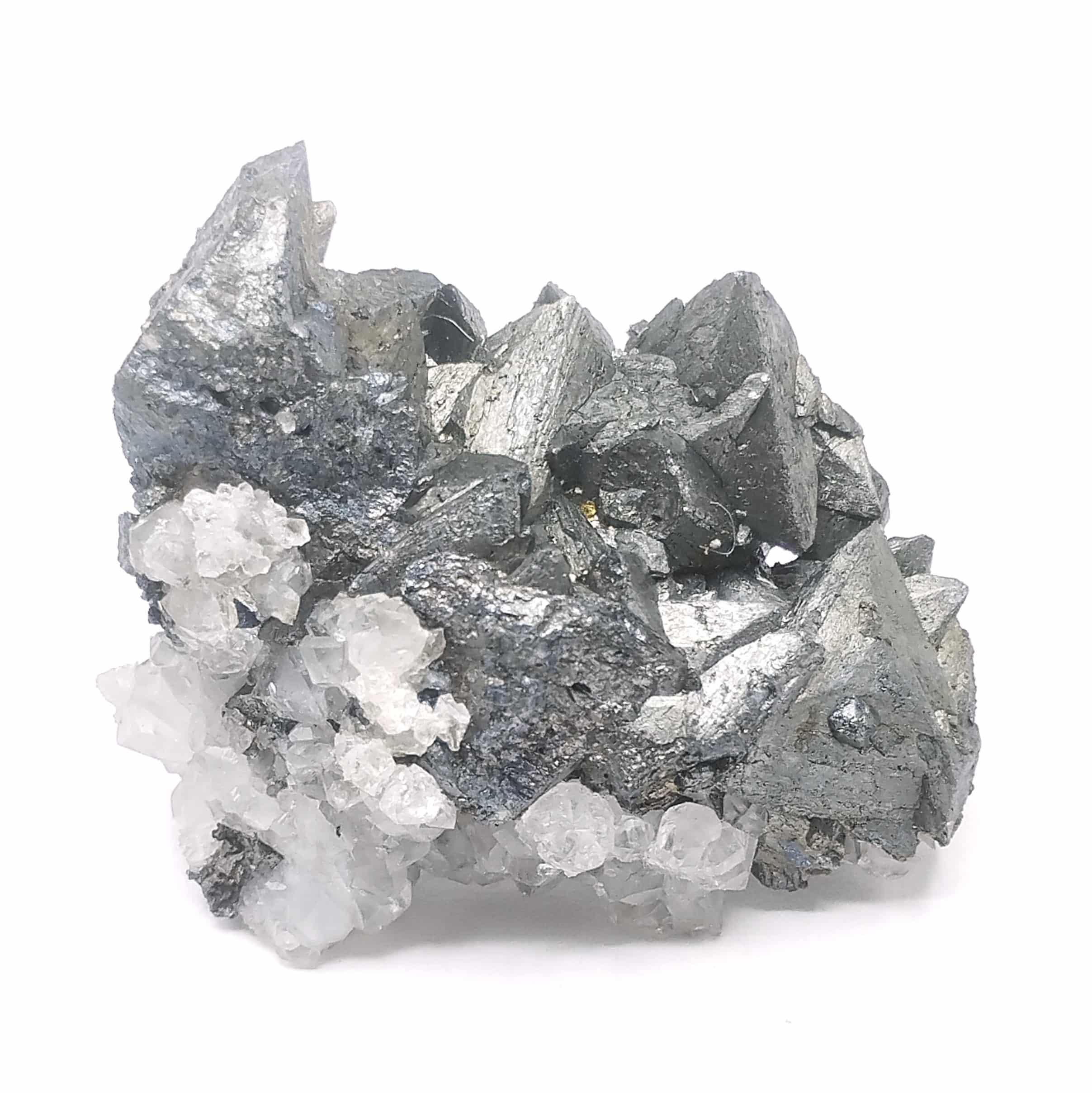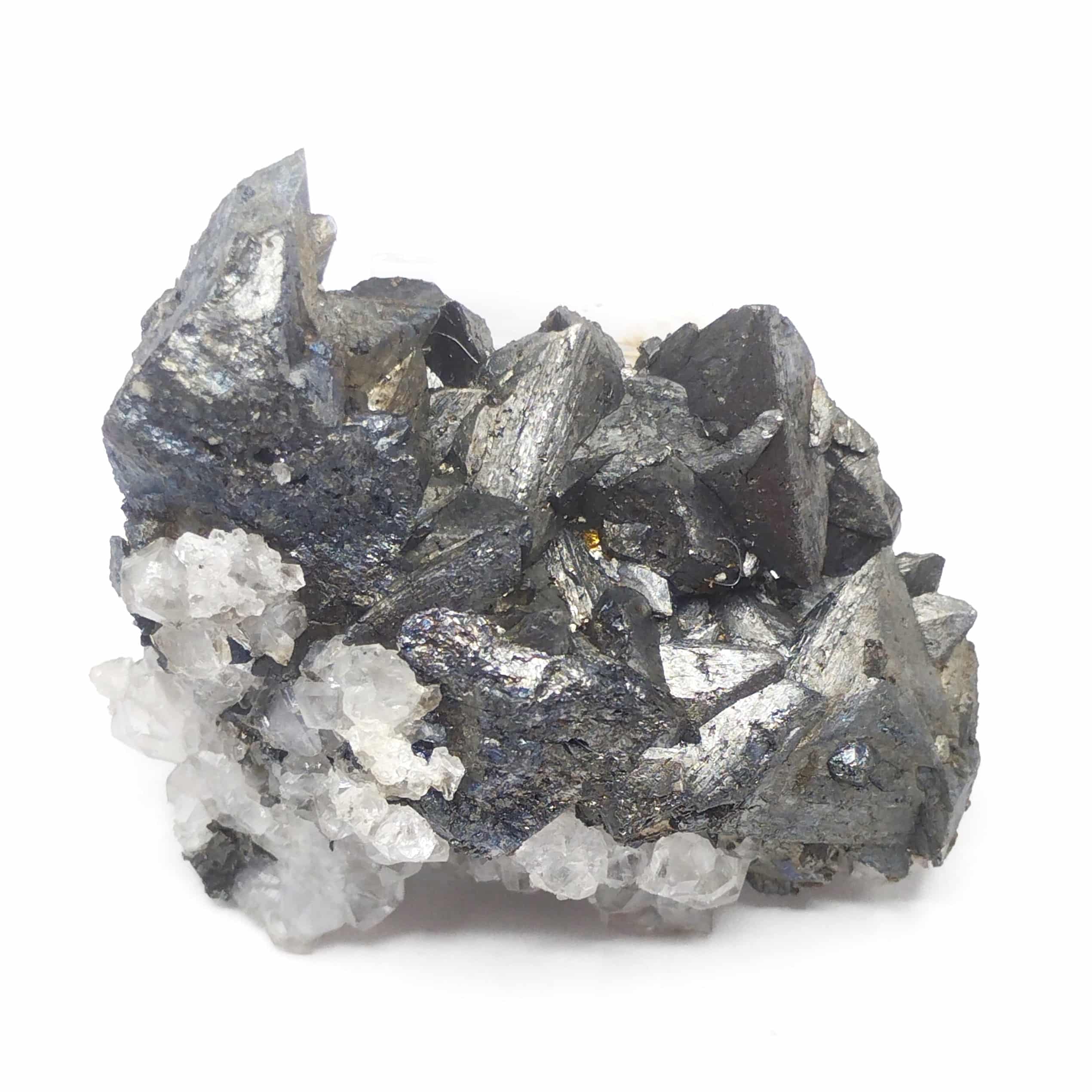Très joli groupe de cristaux de tétraédrite en association avec des cristaux de quartz hyalin, spécimen en provennce de la mine de Lina à Alzen en Ariège.