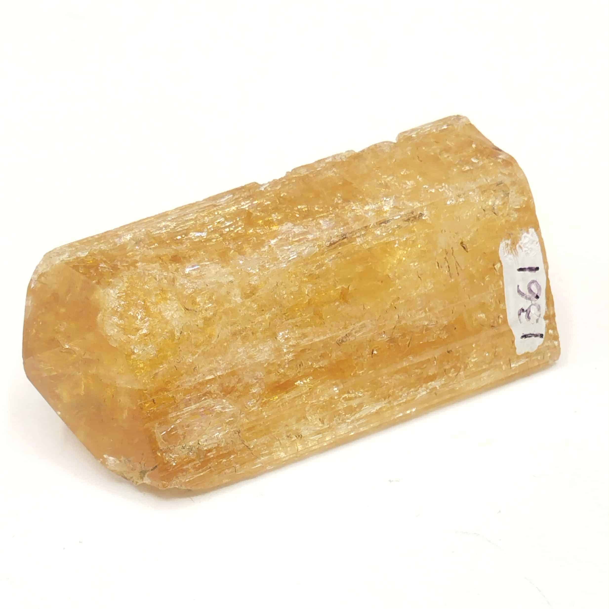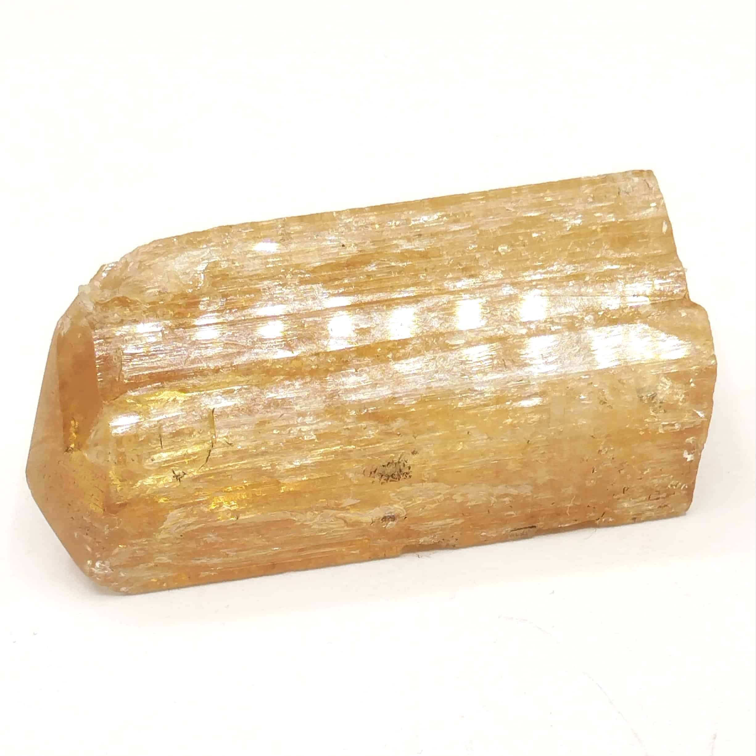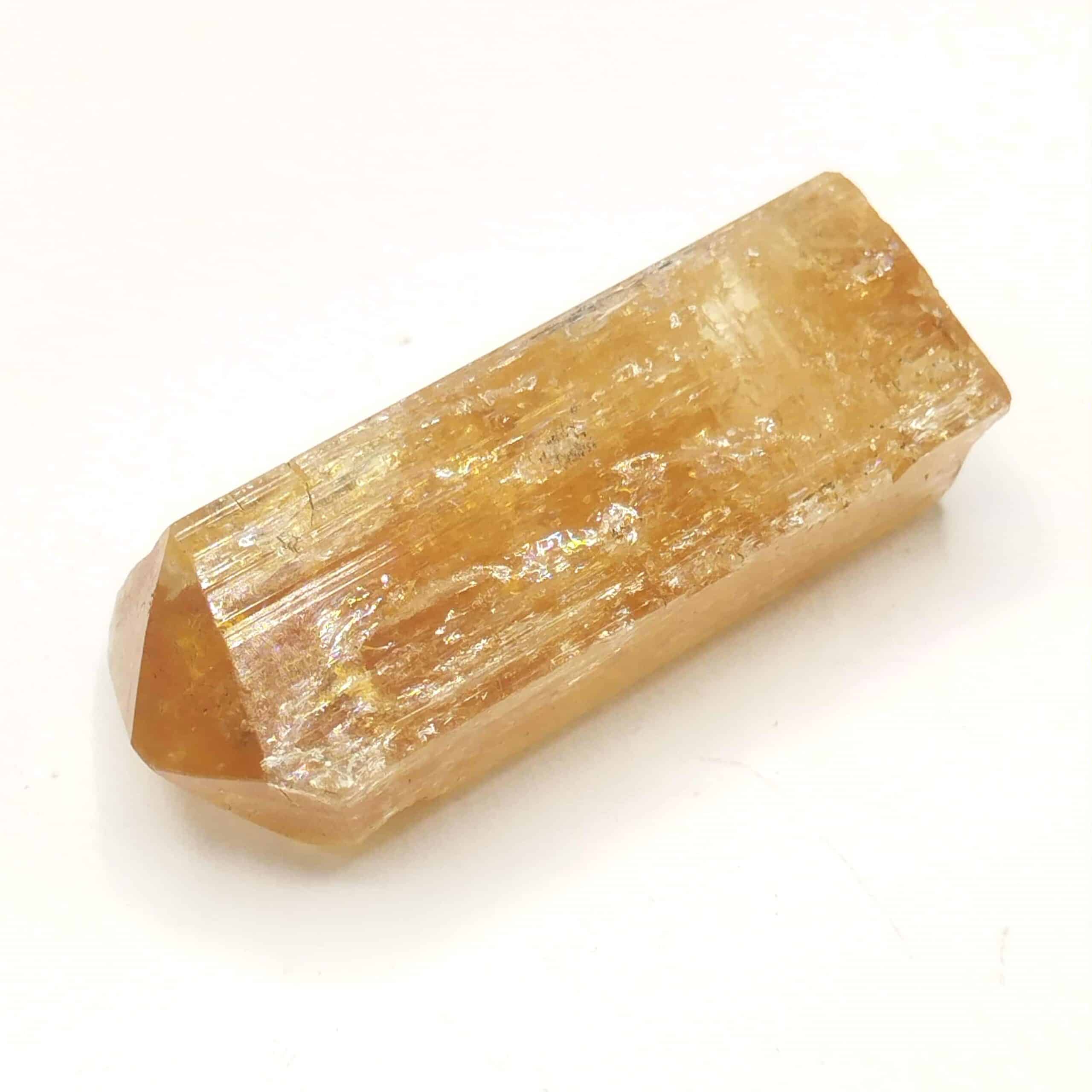 Superbe cristal terminé de topaze variété « Saramena ». Le cristal est terminé, sa base est cicatrisée. Belle couleur jaune orangée et nombreuses inclusions gazeuses.