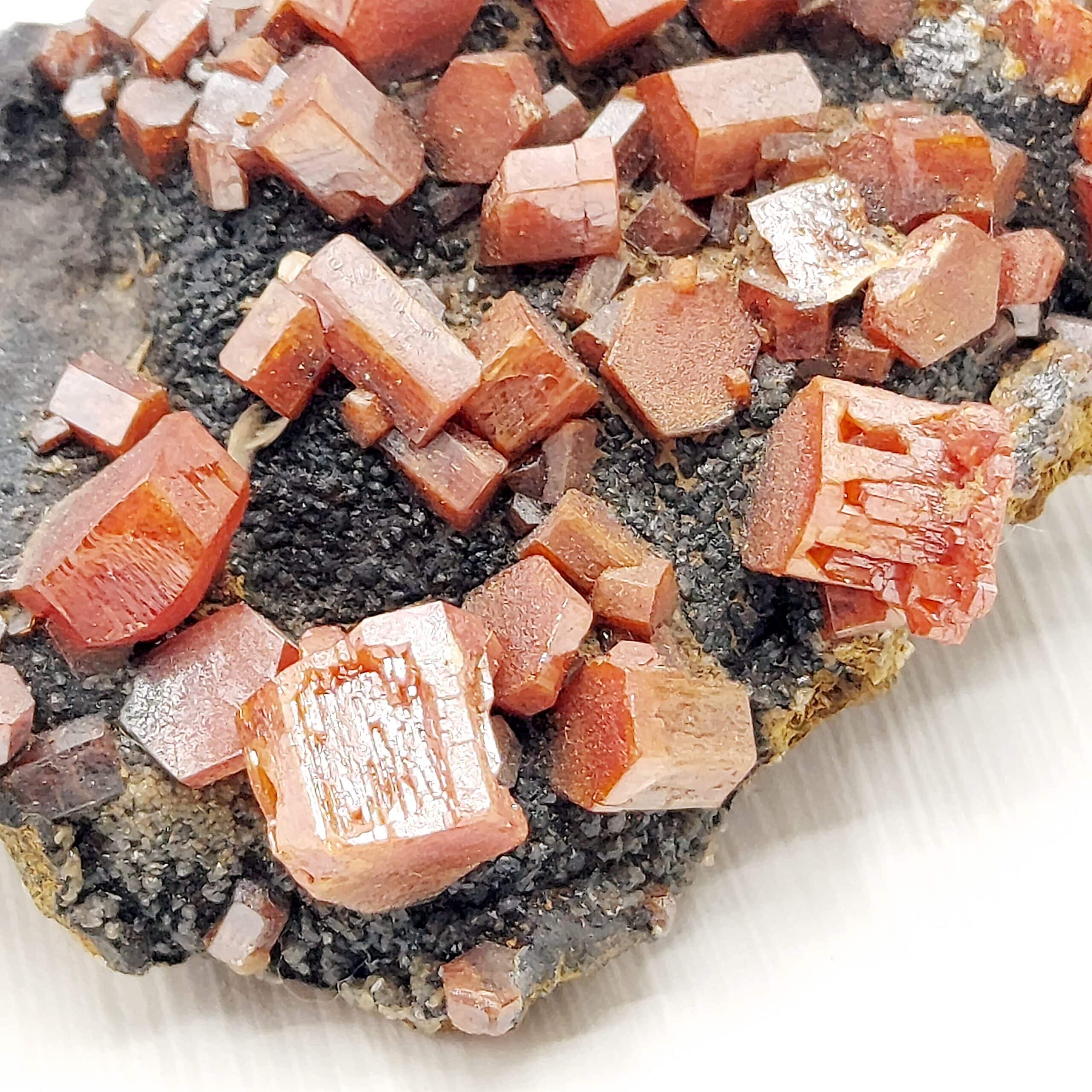 Typiques cristaux de vanadinite rouge sur goethite noire mamelonnée en provenance de Taouz au Maroc.