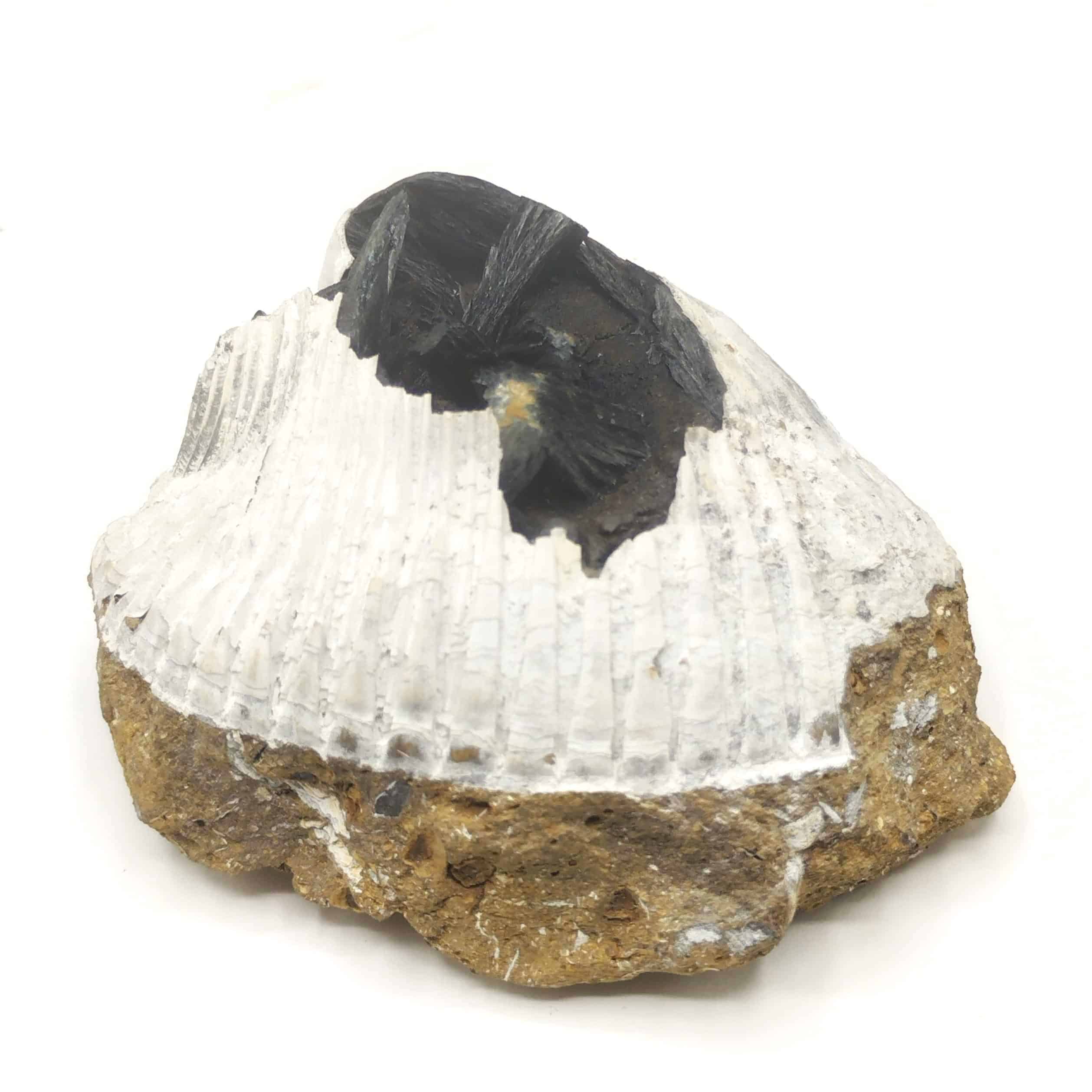 Remarquable groupe de cristaux de vivianite dans la coquille d’un bivalve fossilisé. Spécimen en provenance de Kertch dans la péninsule de Crimée, en Ukraine.